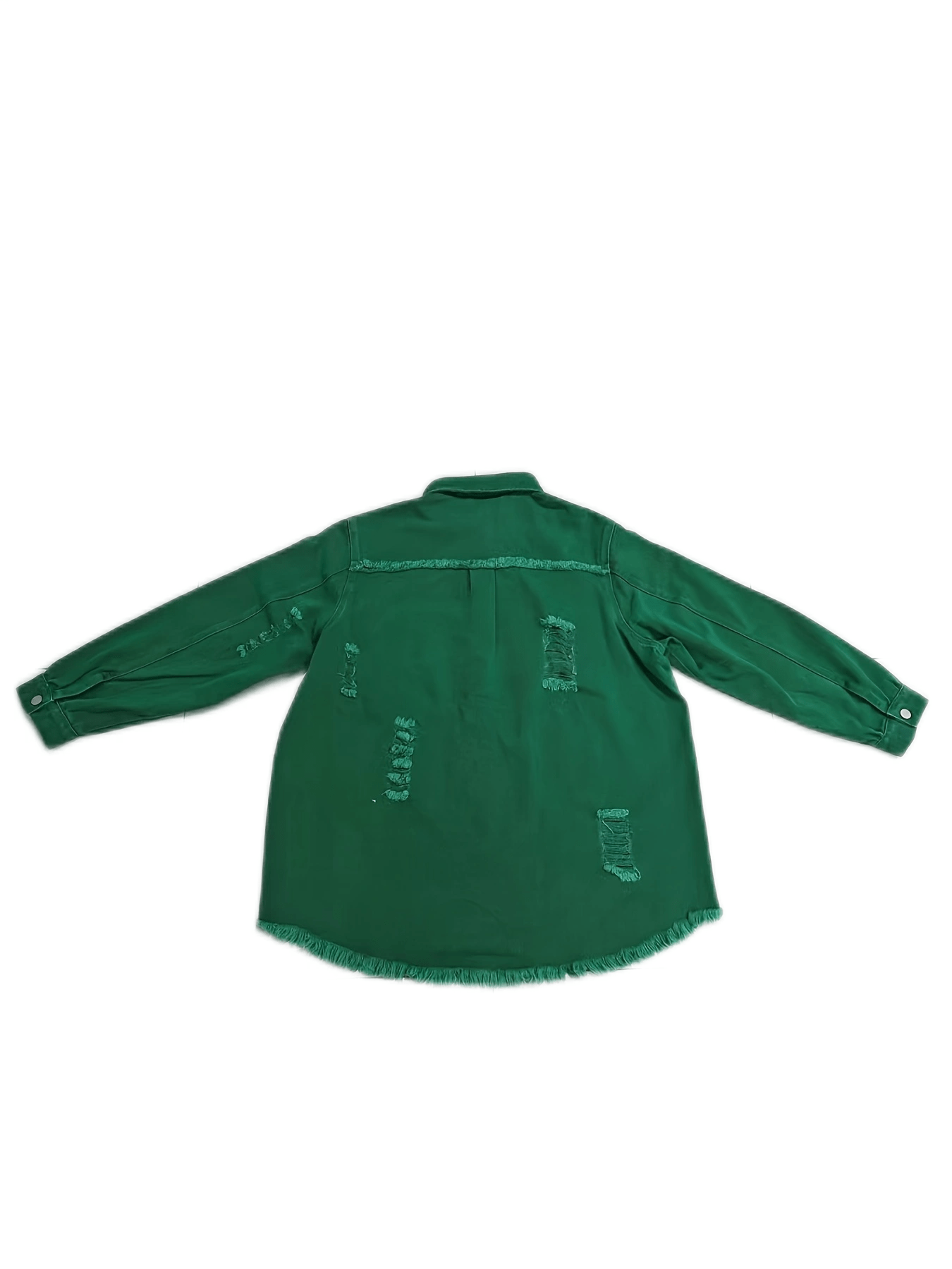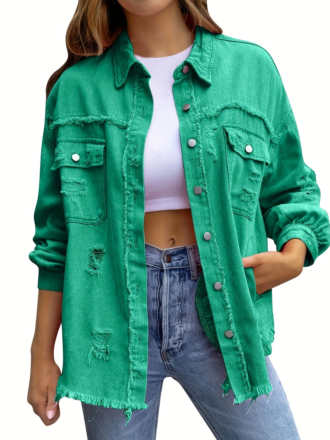 Women's Plus Size Distressed Denim Shirt with Raw Hem and Flap Pockets