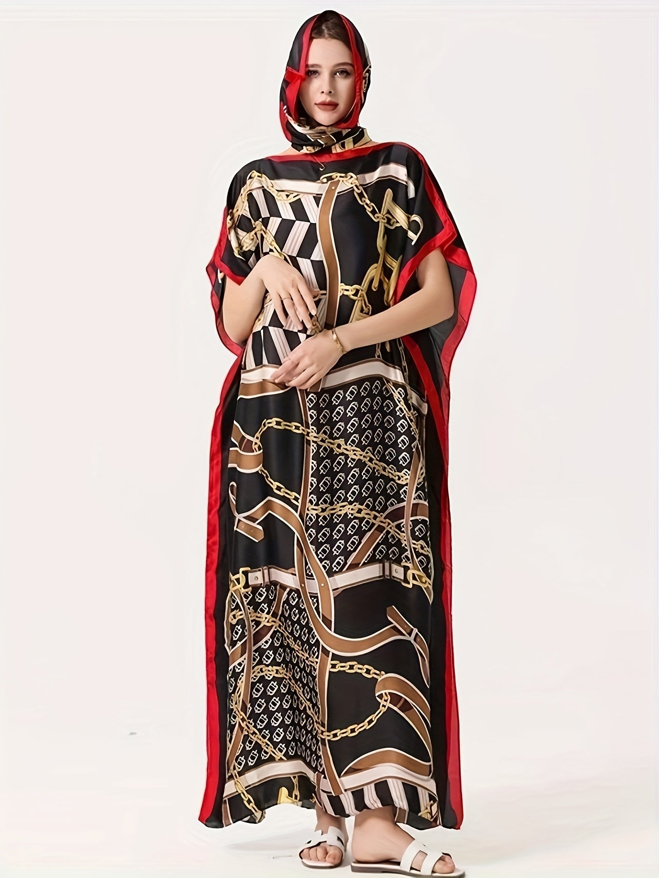 Women's Plus Size Geometric Chain Print Dress with Bat Sleeves and Scarf