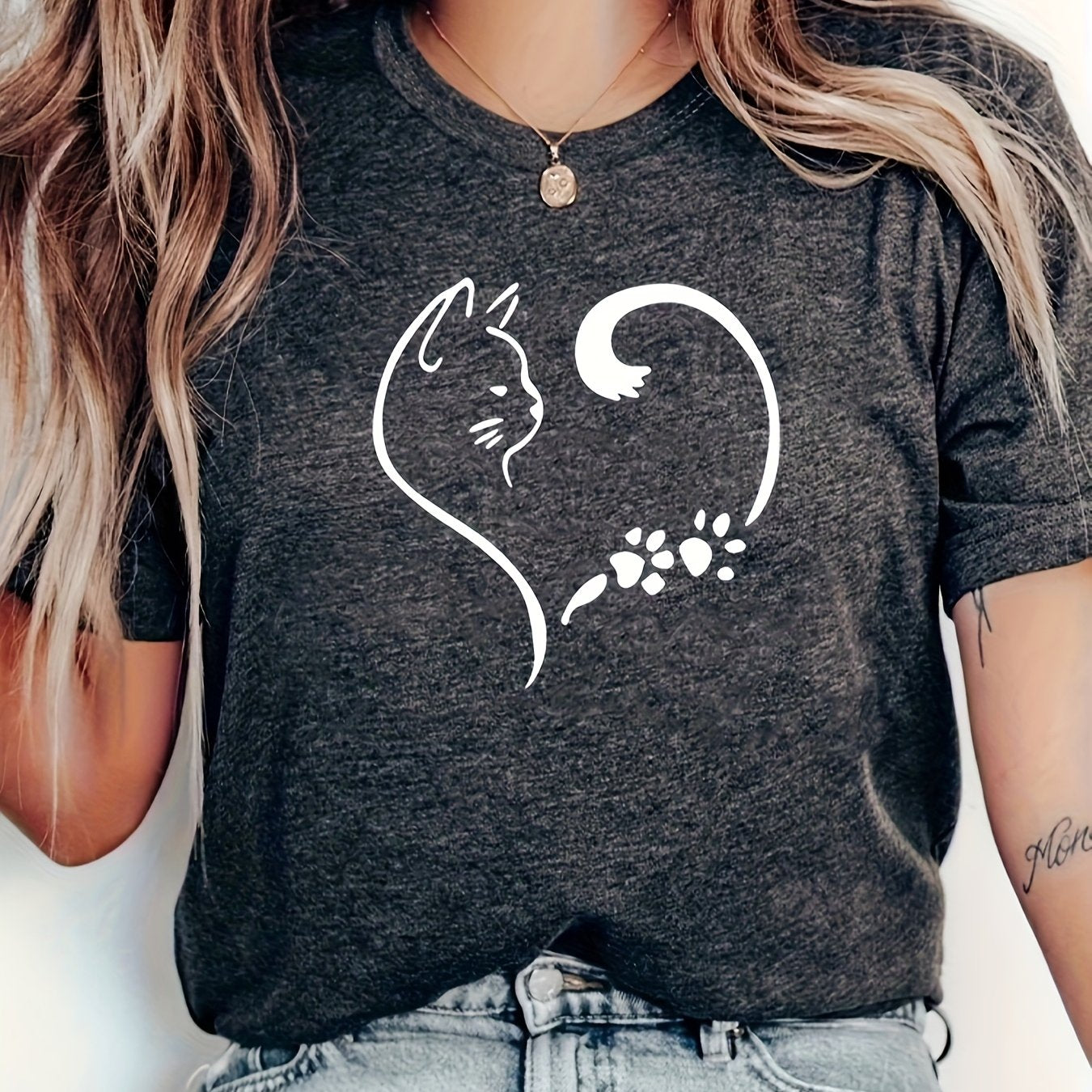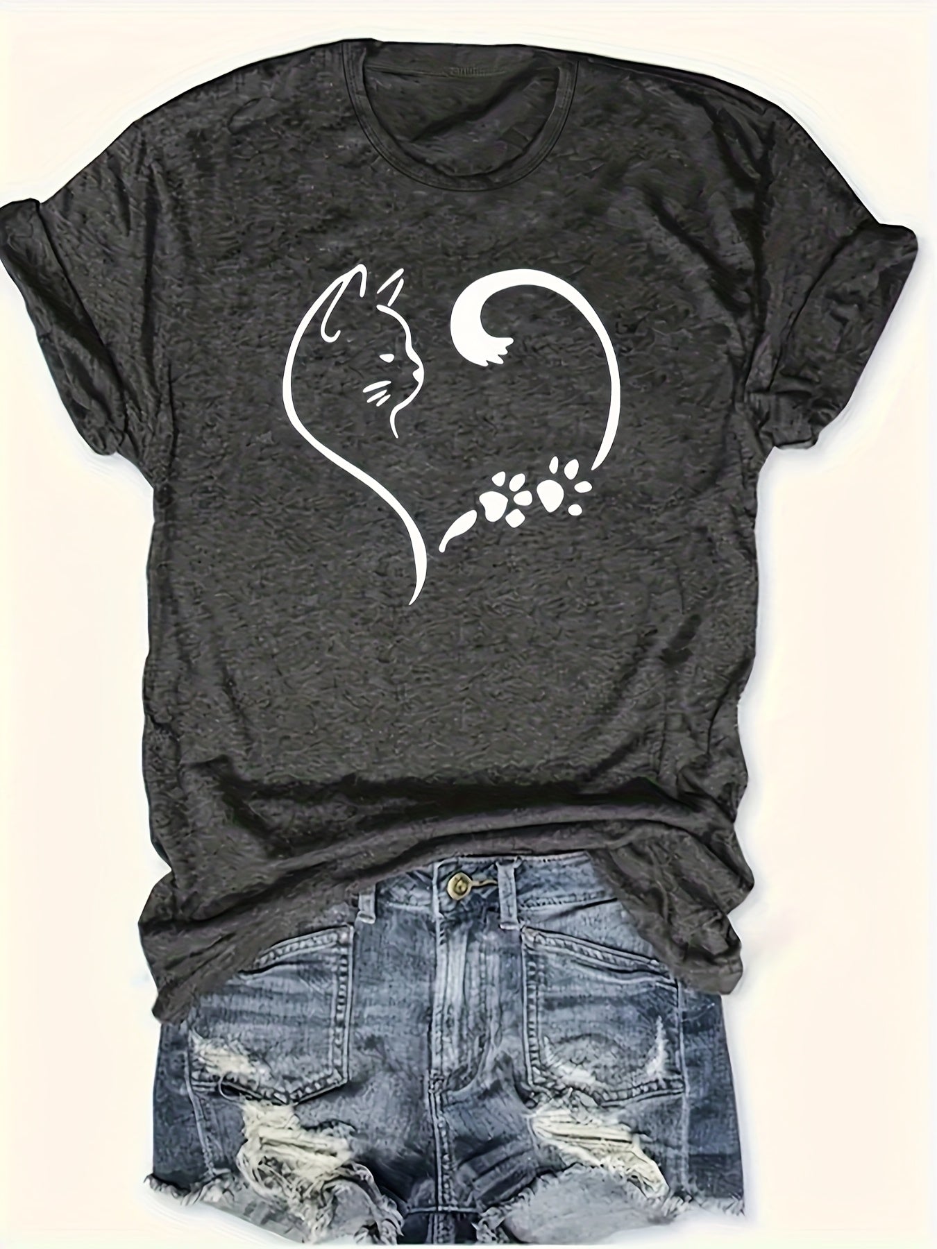 Women's Plus Size Gray T-Shirt with Cat Print Short Sleeve Casual Fit