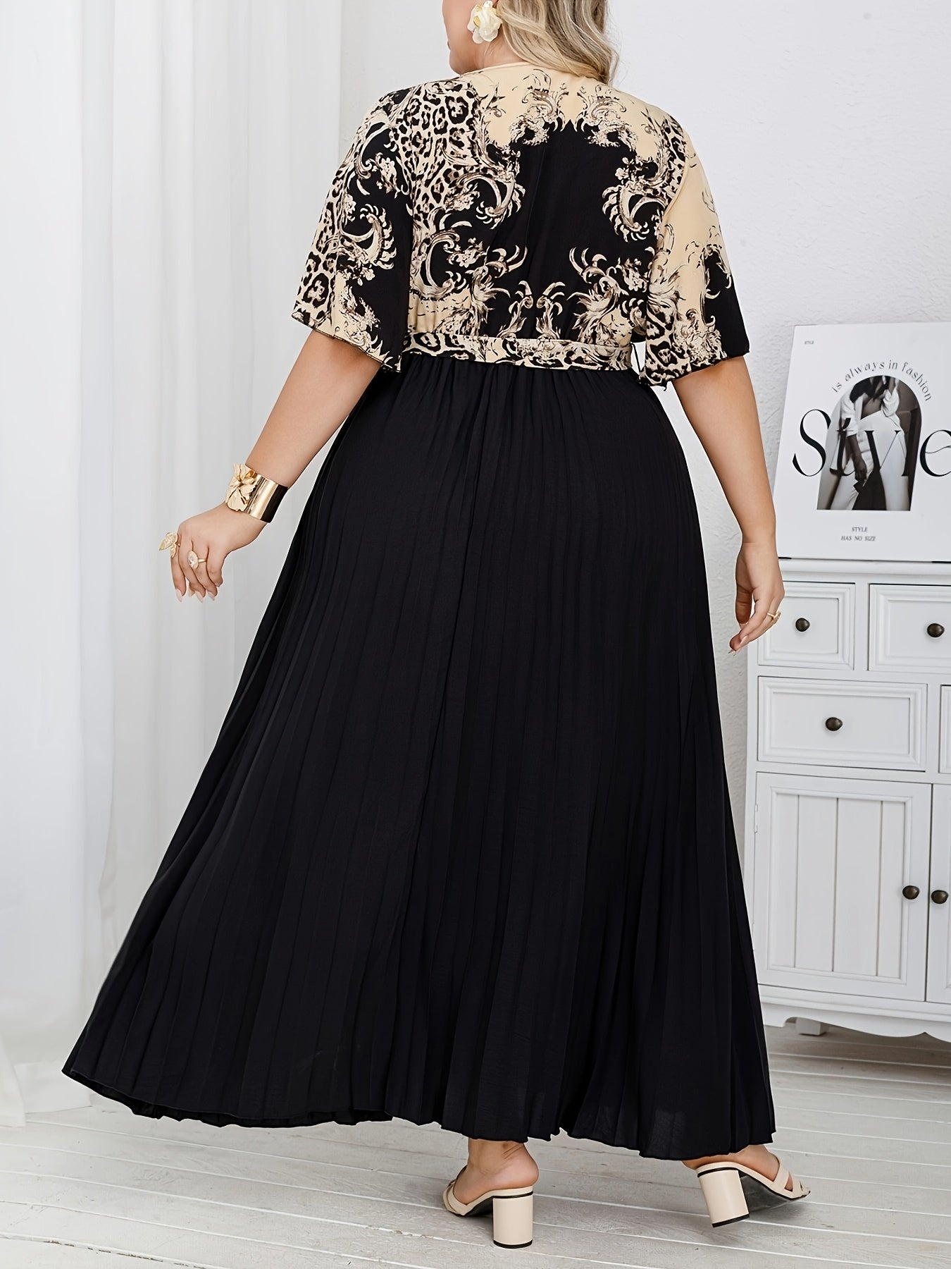 Women's Plus Size Pleated Print V-Neck Dress Elegant Temperament