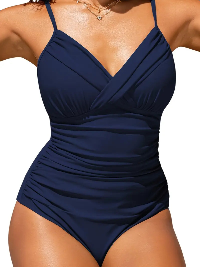 Women's Solid Color One-Piece Swimsuit with Ruched Cross Front and Push-Up Chest Pad