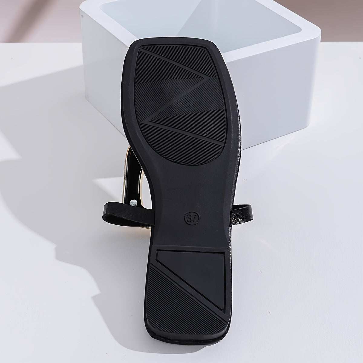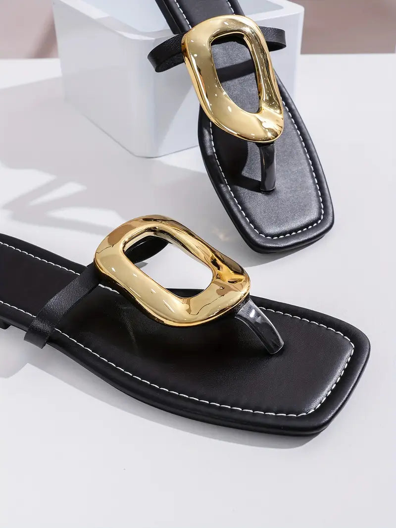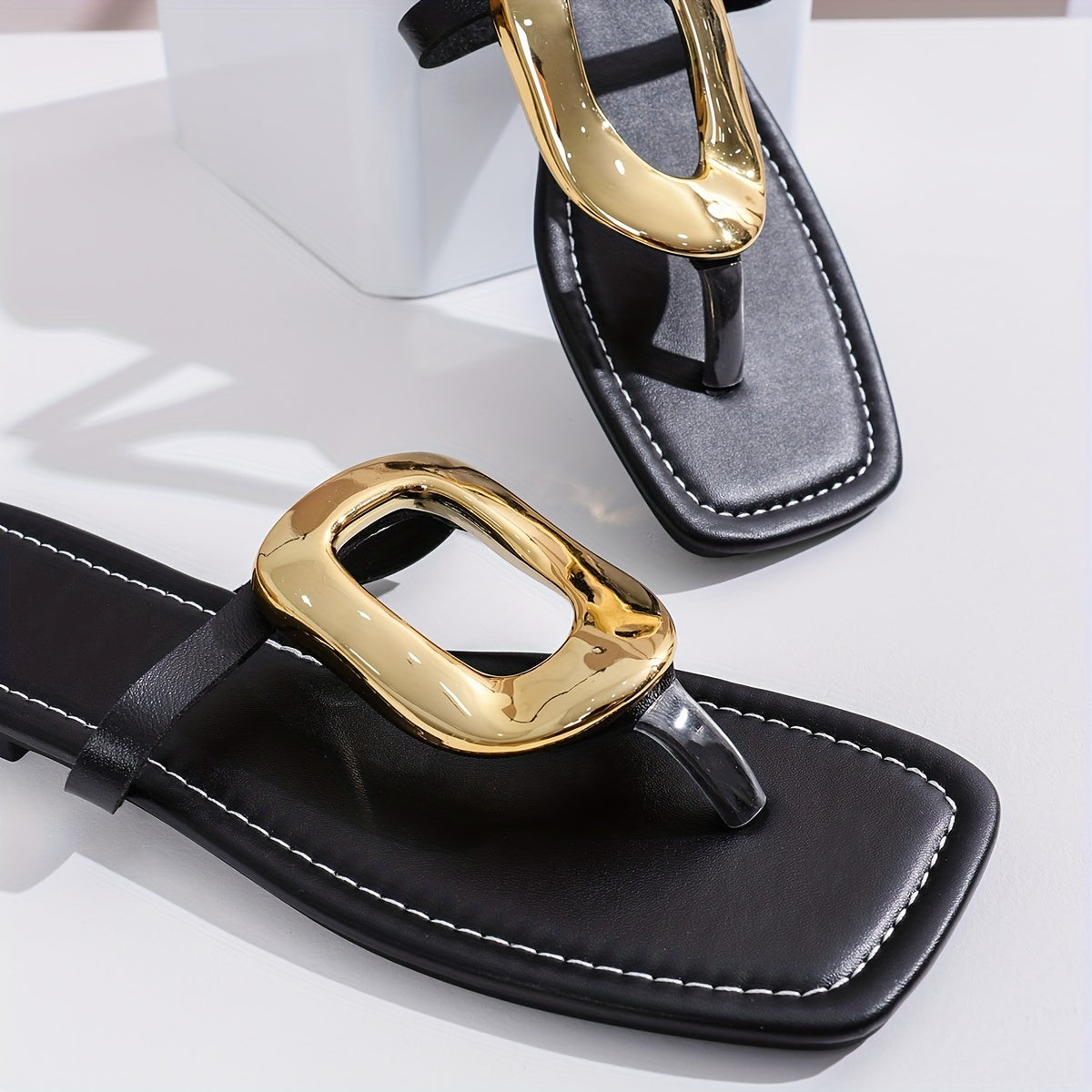 Women’s Summer Flip Flops with Gold Buckle, Solid Color, Flat Heel