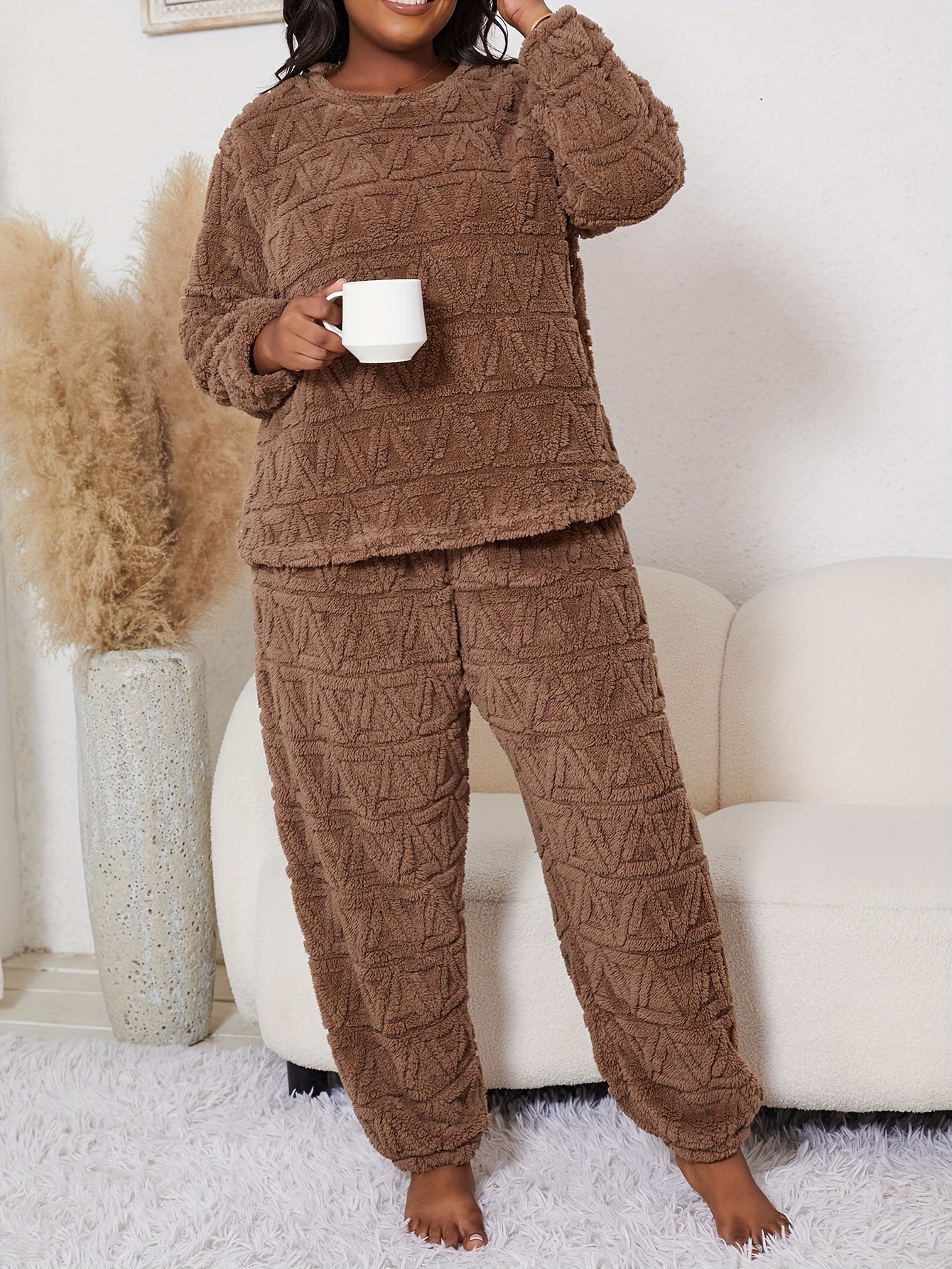 Women's Velvet Warm Pajama Set with Long Sleeve Top and Checkered Pants