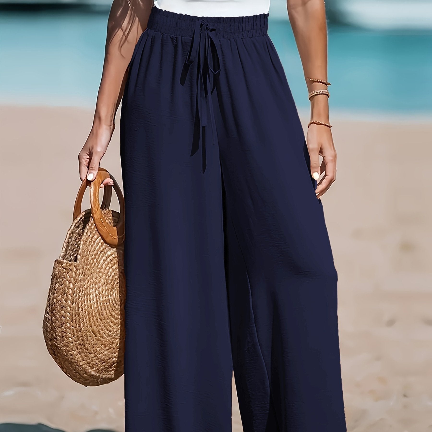 Women's Wide Leg Pants with Drawstring Solid Color Polyester Blend Fall Trousers