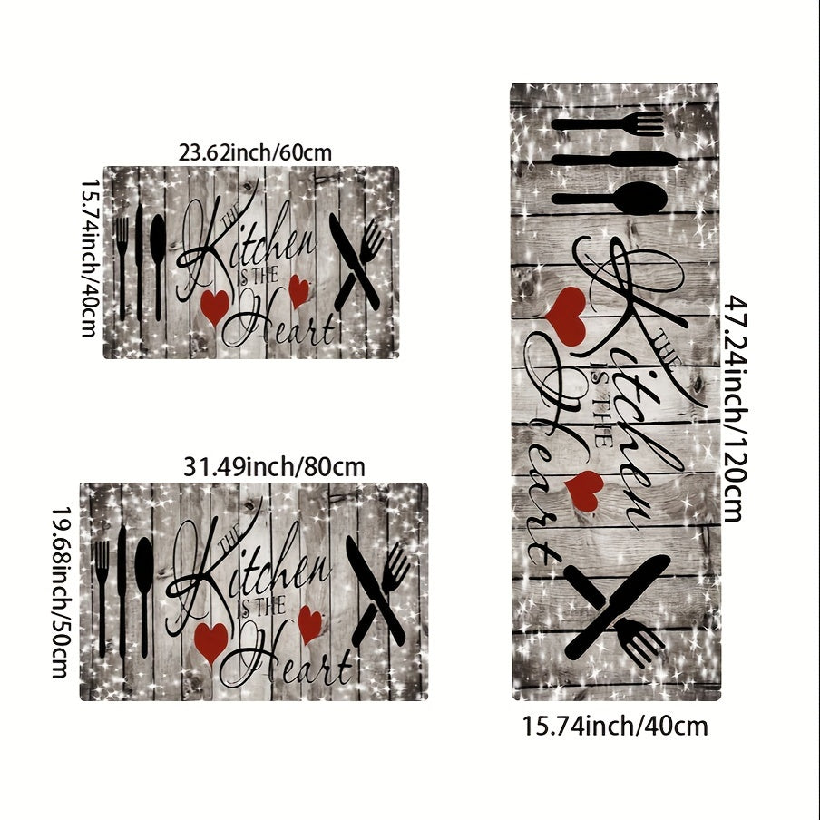 Wood Grain Kitchen Mat with Heart Knife and Fork Design Durable Polyester Non-Slip Washable