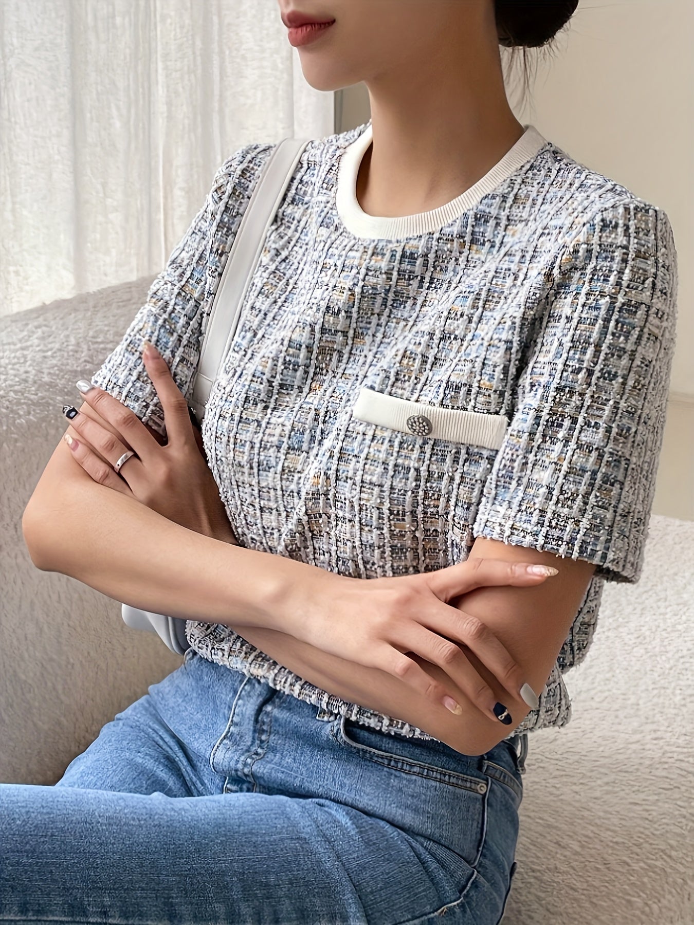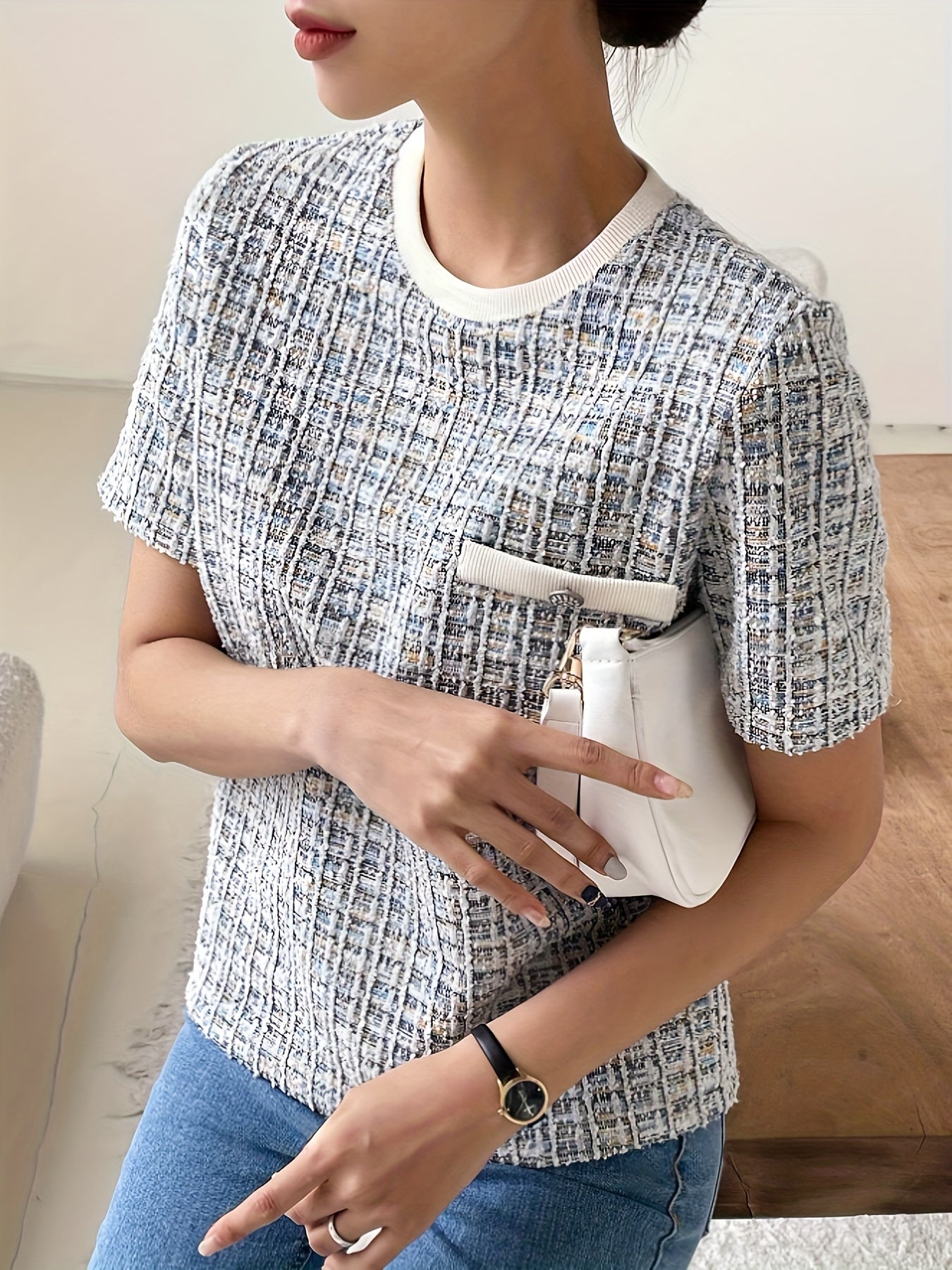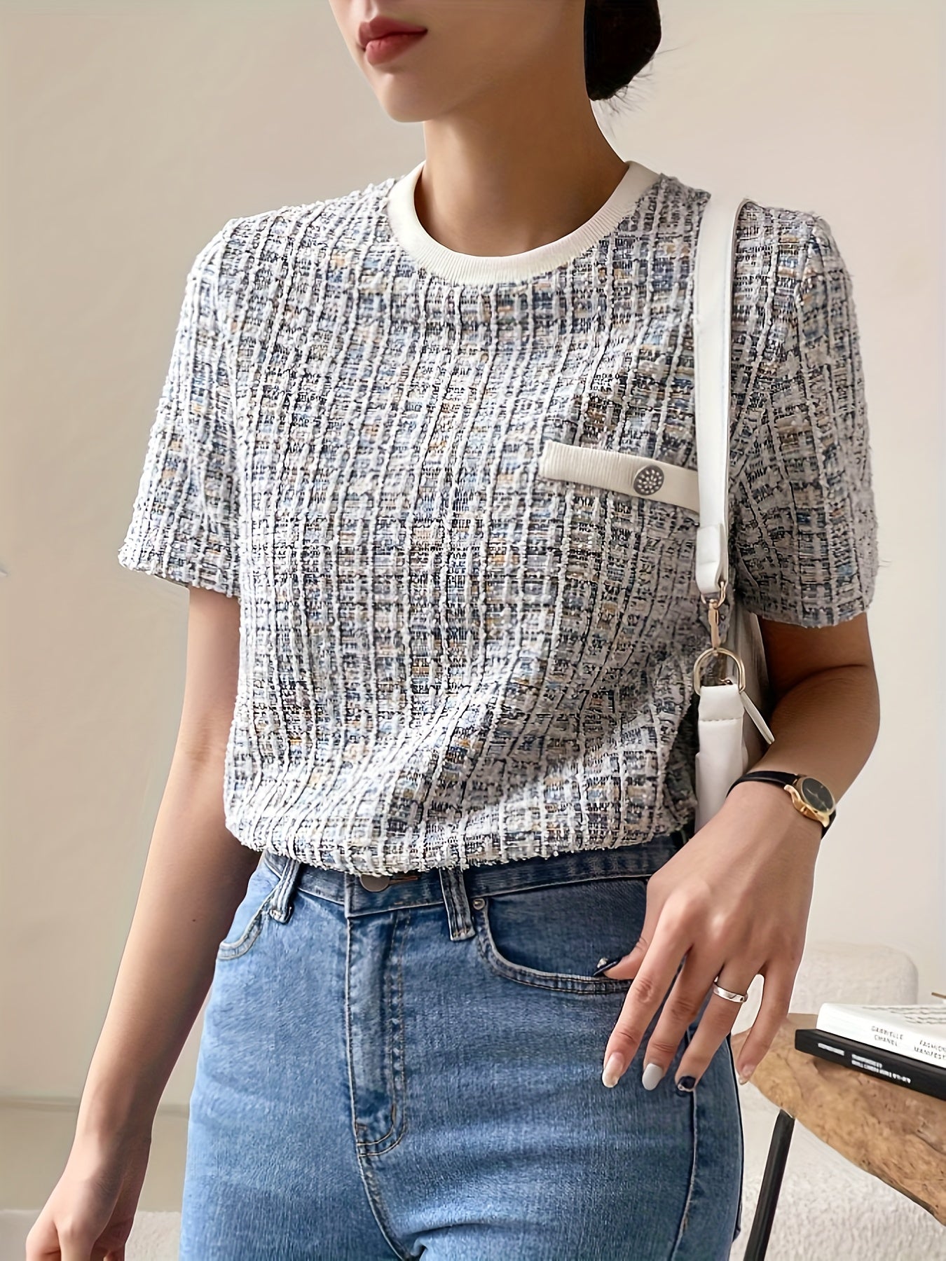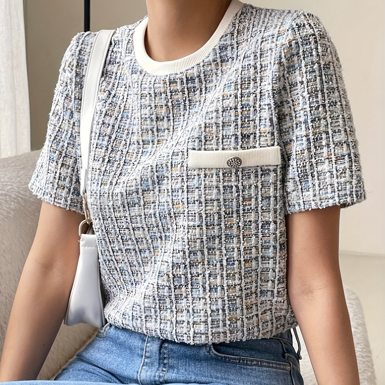 1 ta shik tekis to'qilgan ayollar uchun futbolka, cho'ntak tafsiloti, tugma aksenti, polyester to'qima, dumaloq bo'yin, qisqa yeng, bahor/yoz/kuz uchun oddiy uzunlik.