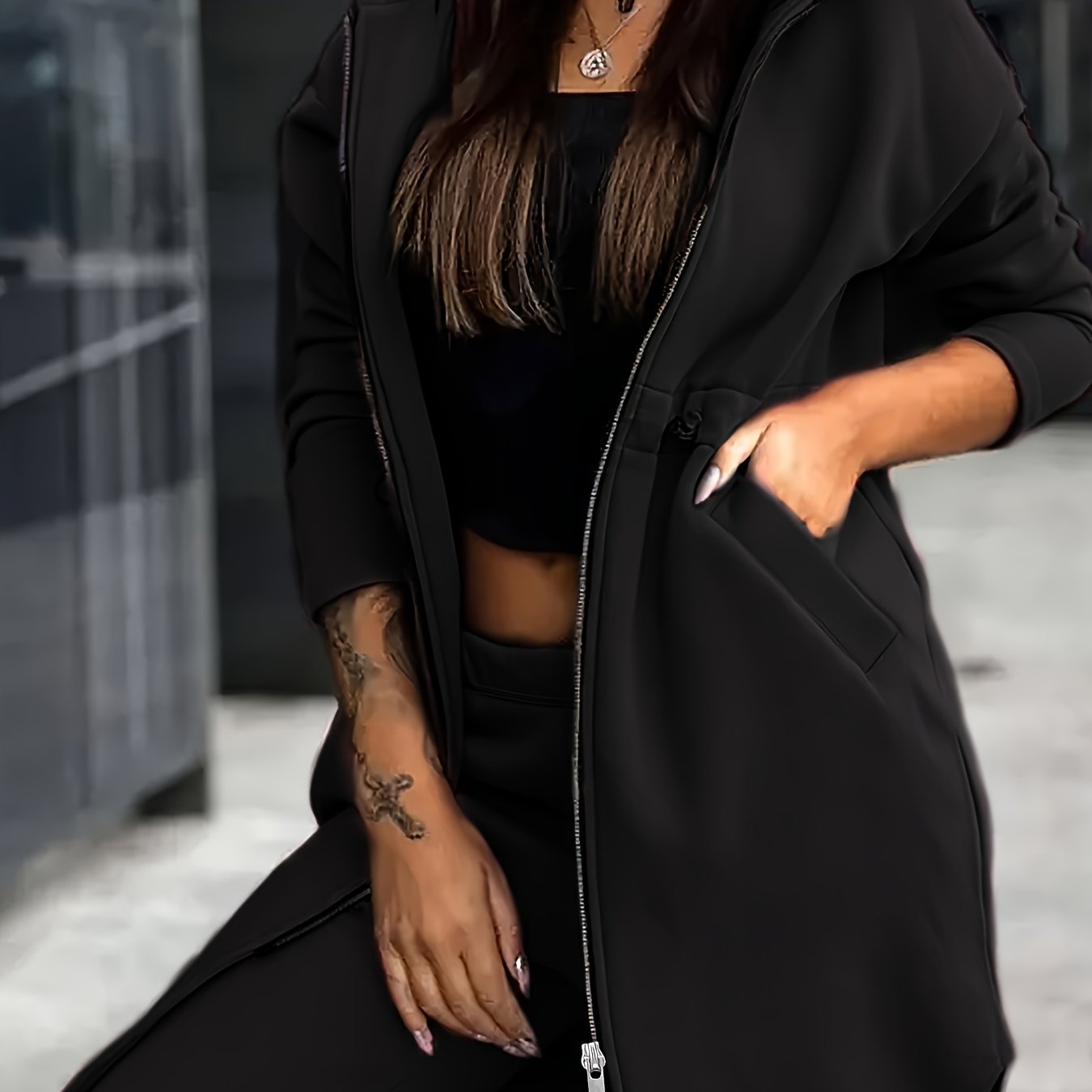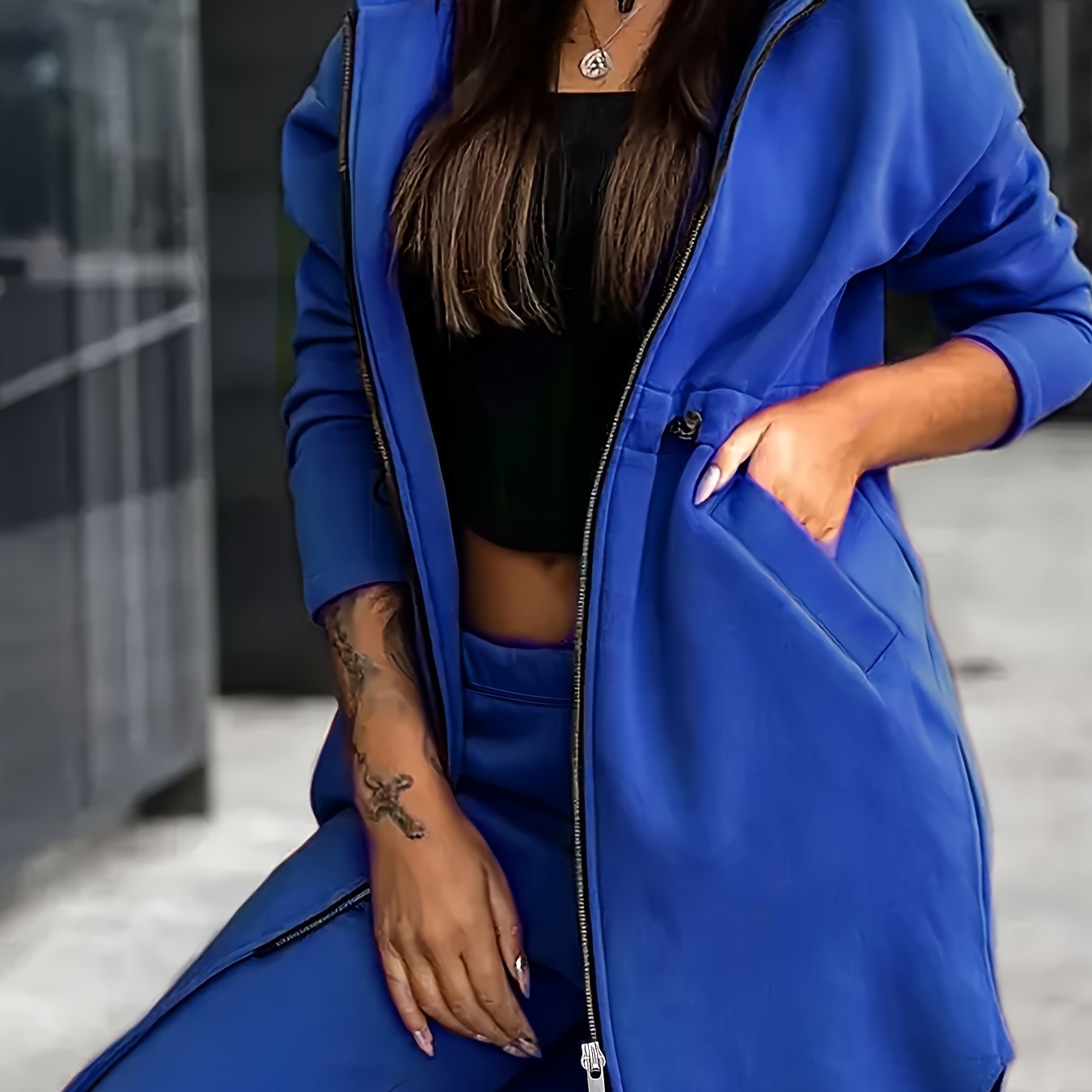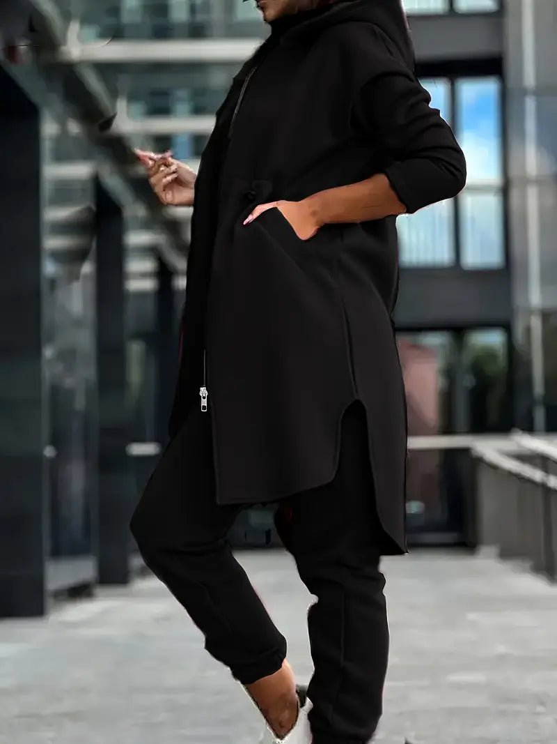 1 Ta'sirli Ayollar uchun Bir Rangli Kapüşonli Sviter va Shimlar To'plami, Poliesterdan Yasalgan Trikotaj Matodan Bahor/Kuz Moda uchun