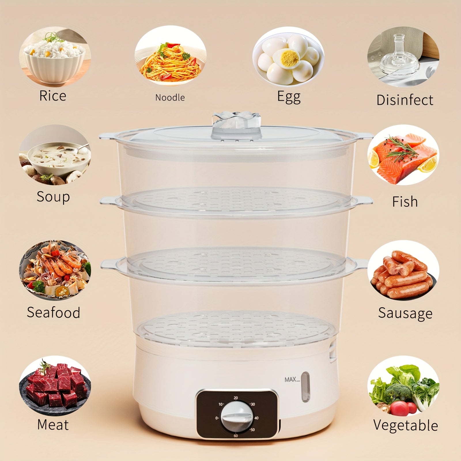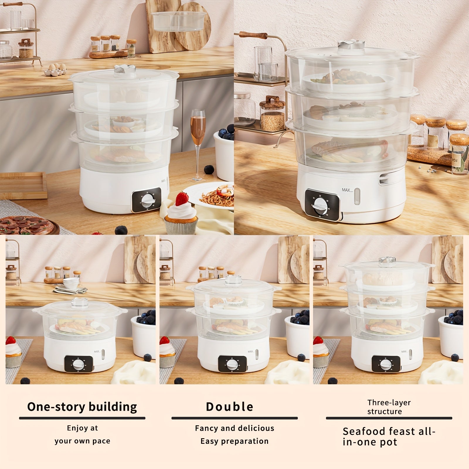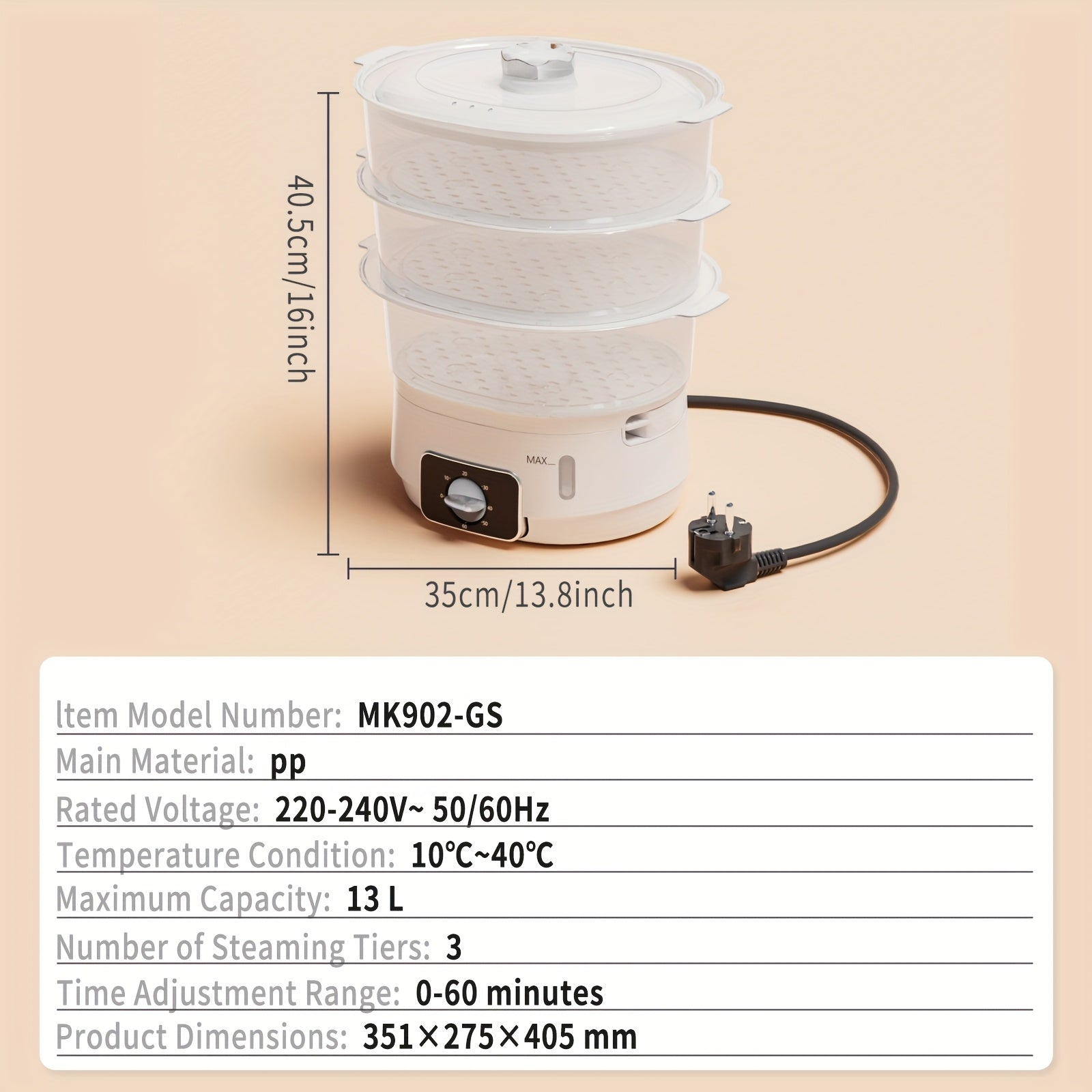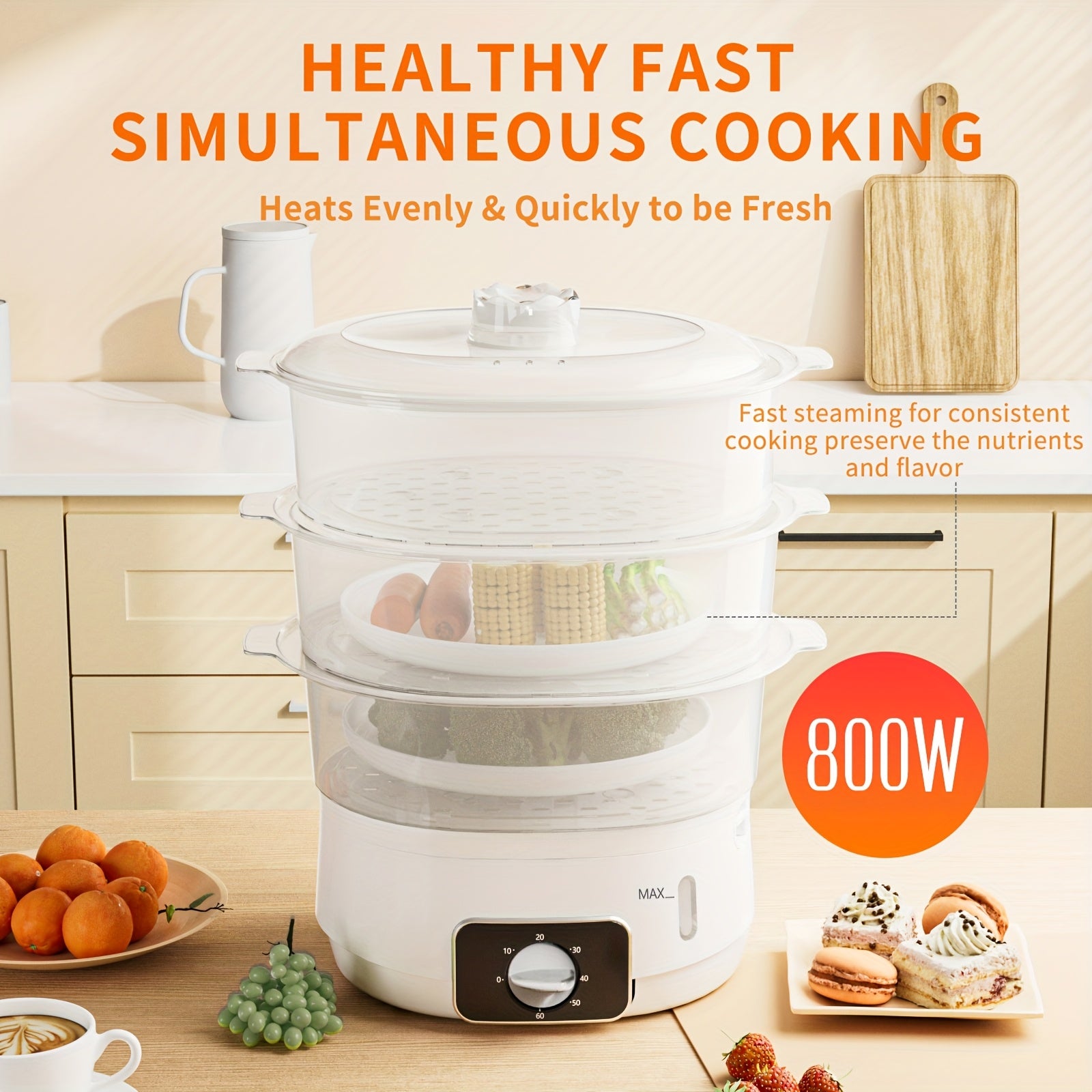 1 EU LIPWEL bug'lamali pech, 13L sig'imli, 800W, 3 ta konteyner, 60 min taymer, 2 ta suv kirish joyi, oq rang, stackable savat. Sabzavotlar, tuxum, guruch va mol go'shtini bug'lash uchun juda yaxshi.