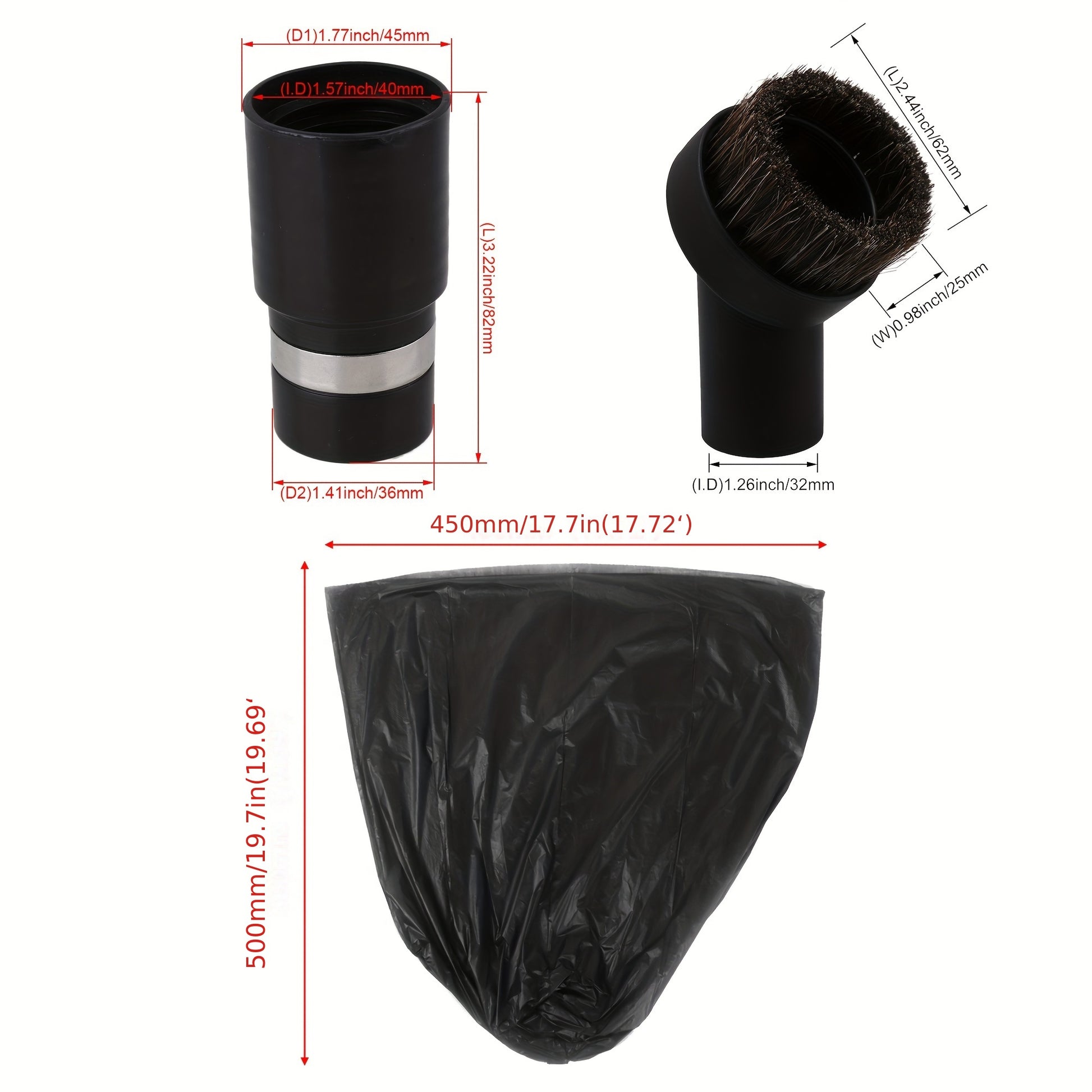 1 Ta'sirli changyutgich uchun dumaloq cho'tka qo'shimchasi, 32mm ichki diametri, 25mm cho'tka uzunligi, qora; 1 32mm quvur ulanishi, 2 oq nylon qo'lqop, 20 biodegradatsiyalanuvchi qalin tekis og'zli chiqindi sumkalari