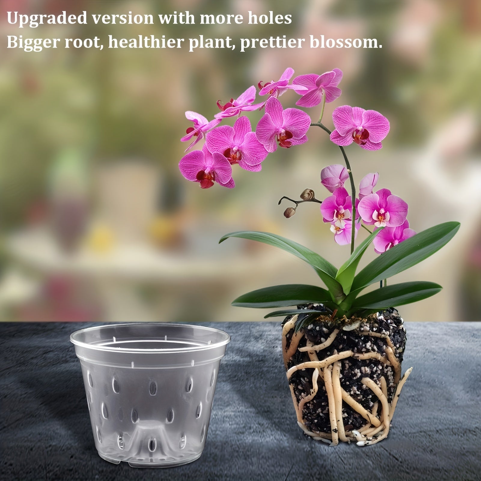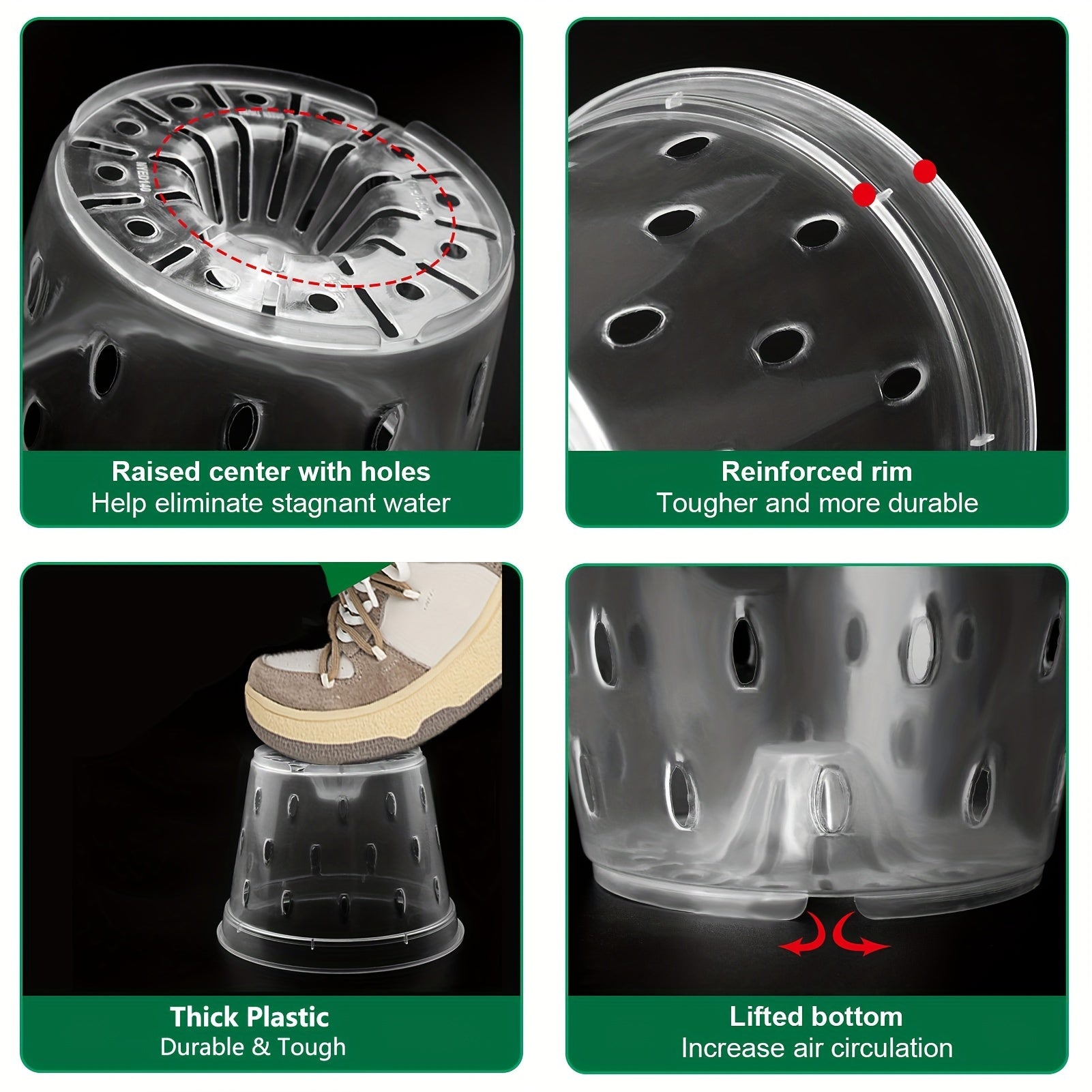 10 dona 13.97 sm o'lchamdagi teshiklari bo'lgan shaffof plastik orkide idishlari, sog'lom havo aylanishi va drenaj uchun. Qayta ekish, ichki va tashqi uy bezatish uchun ideal.