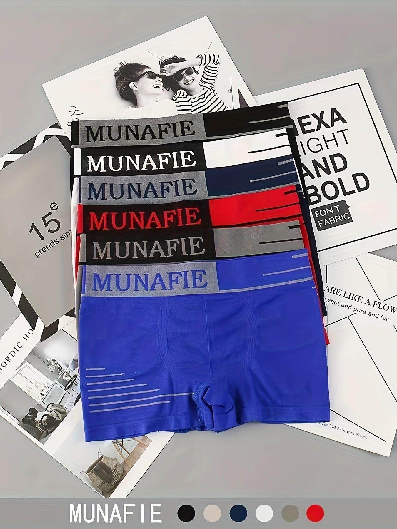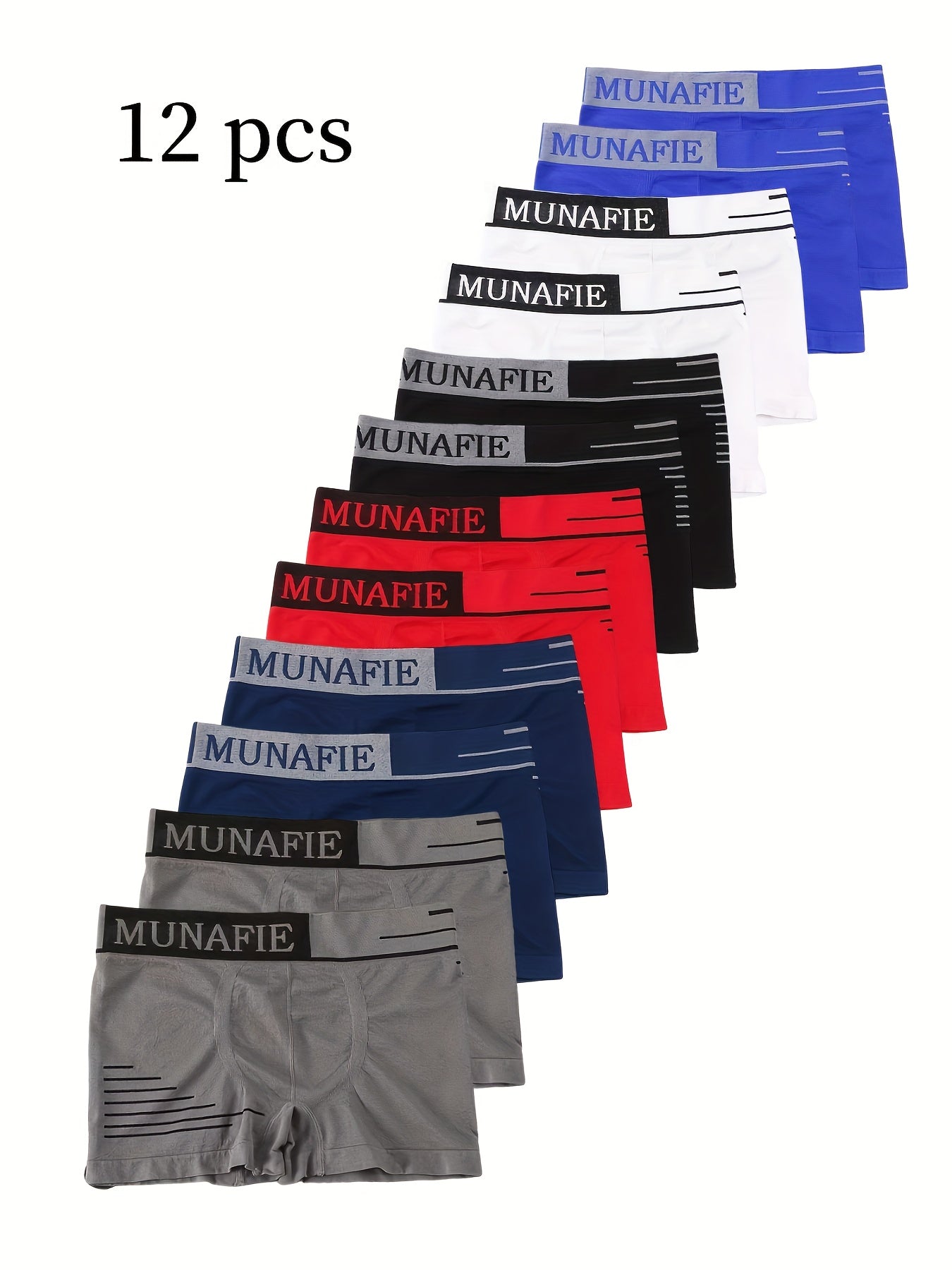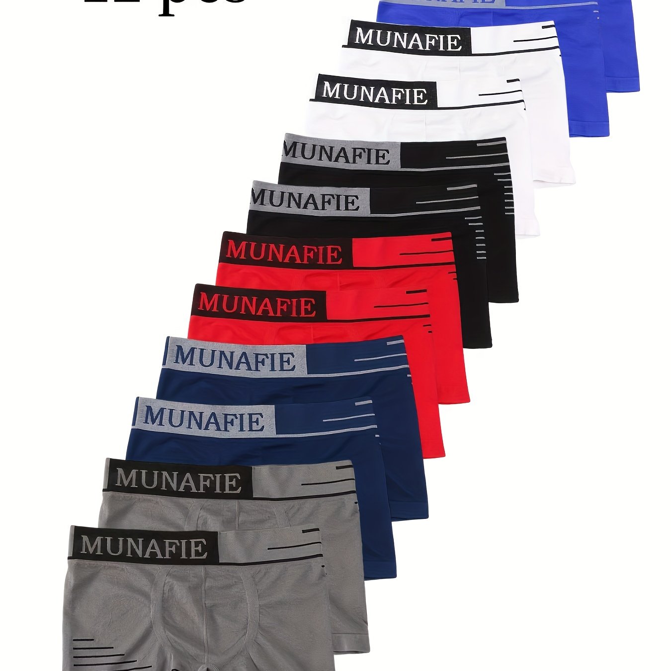 12 dona erkaklar uchun tikuvsiz boxer brieflar qizil, qora, ko'k va oq ranglarda "MUNAFIE" printi bilan. S va M o'lchamlari mavjud. Har kuni qulaylik uchun nafas oladigan, tez quriydigan, cho'ziluvchan mato.