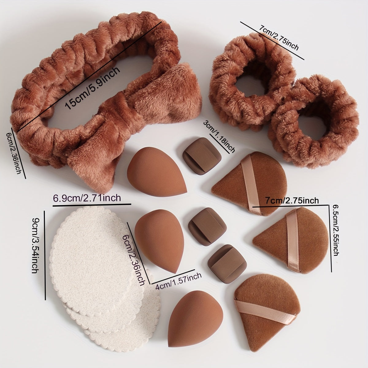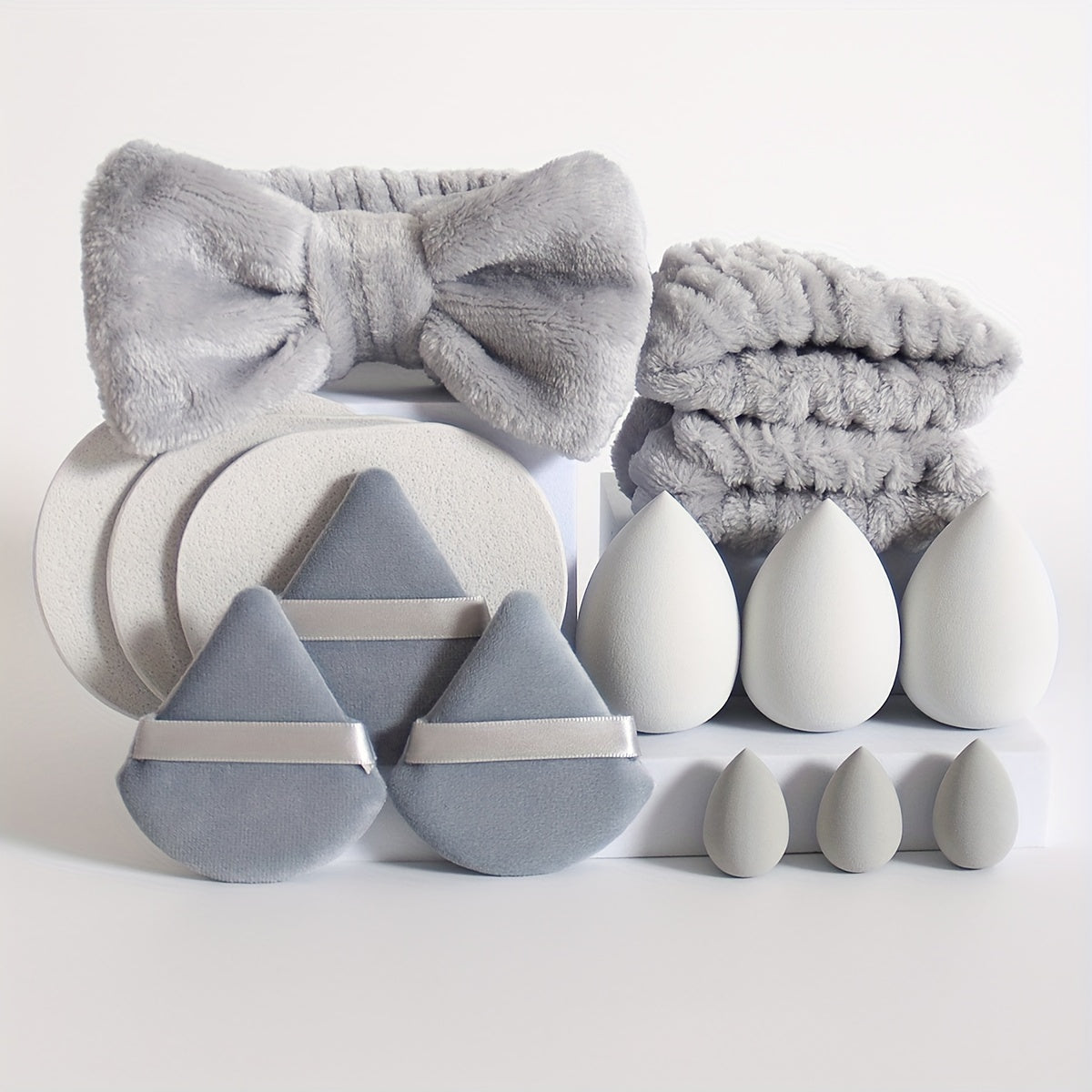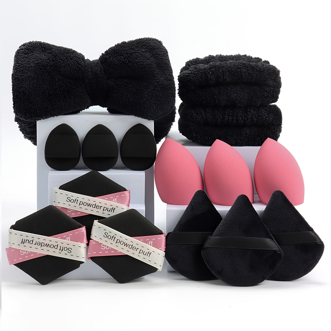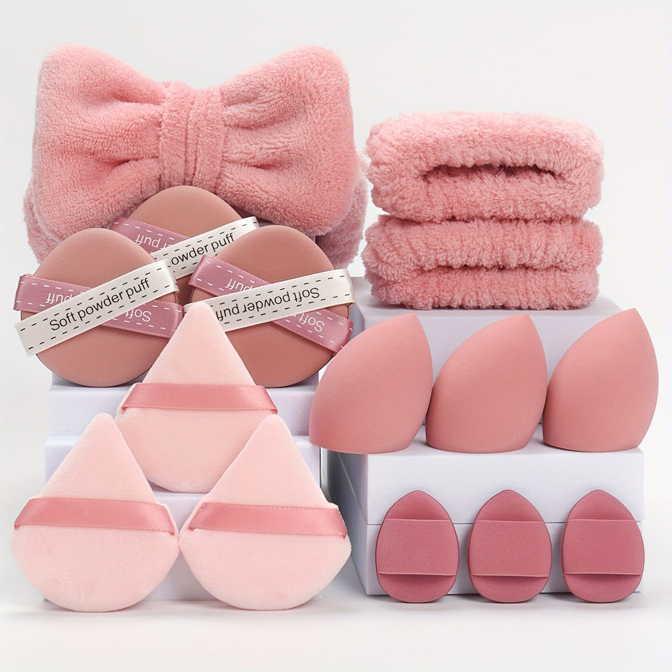 15-ta bo'lakli makiyaj asboblari to'plami, gubkalar, puflar, yuz yuvish gubkalari va aksessuarlar bilan