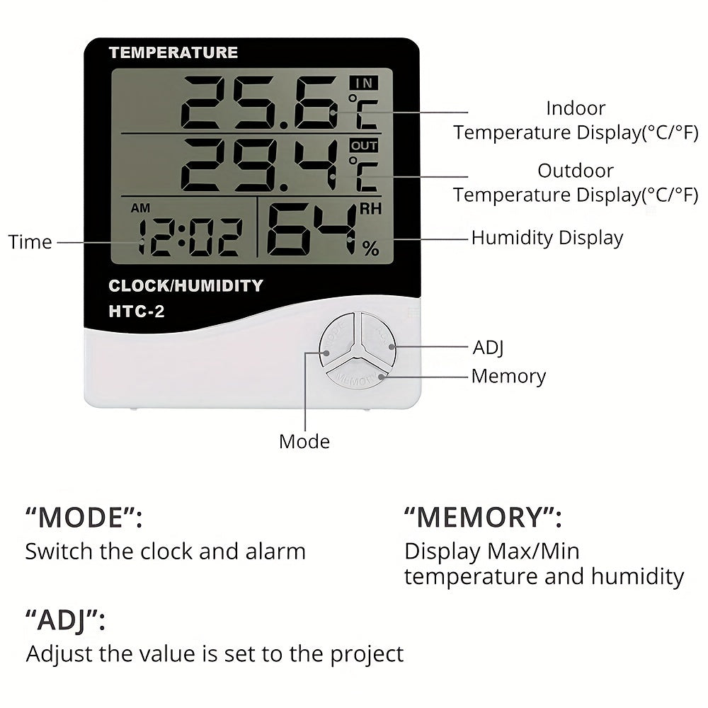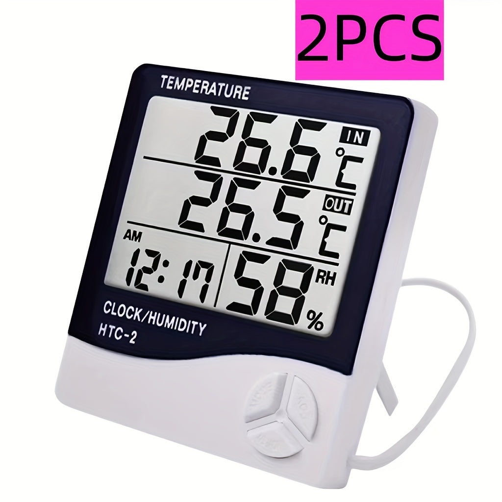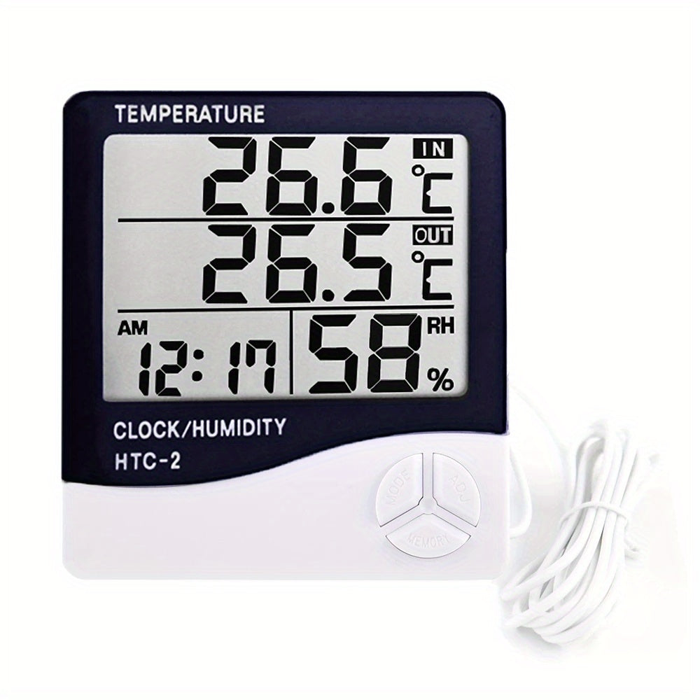 1 dona HTC-2 raqamli termometr gigrometri, ichki va tashqi ob-havo stansiyasi soati LCD displey bilan, batareya bilan ishlaydigan, 0.1 aniqlik, plastik material, oq - batareya kiritilmagan, gigrometr