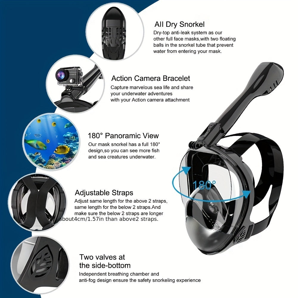 - Snorkel maskasi to'liq yuzda kamera ushlagichi bilan jihozlangan, shuning uchun siz dengizdagi har bir ajoyib lahzani tasvirga olish va uni do'stlaringiz va oilangiz bilan bo'lishishingiz mumkin.[SIFATGA KAFOLAT BERILADI]