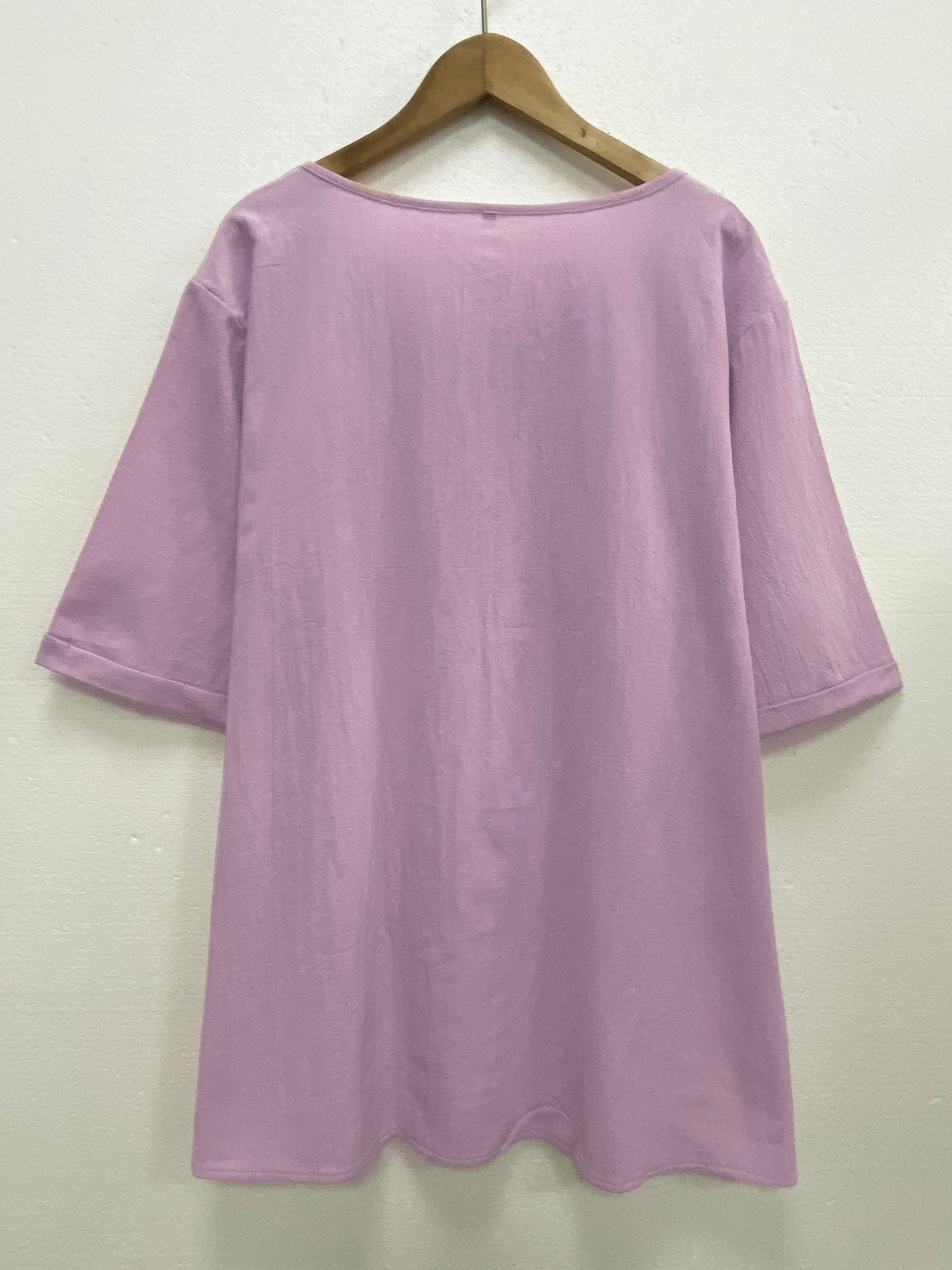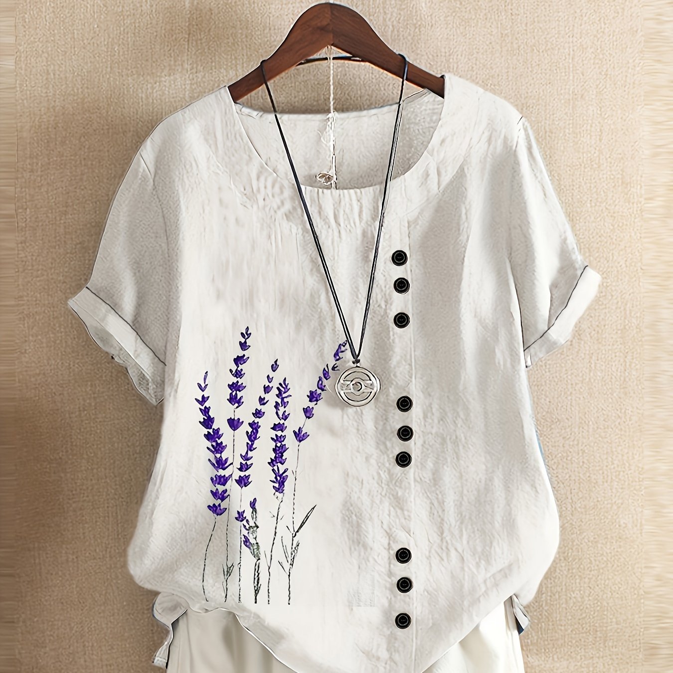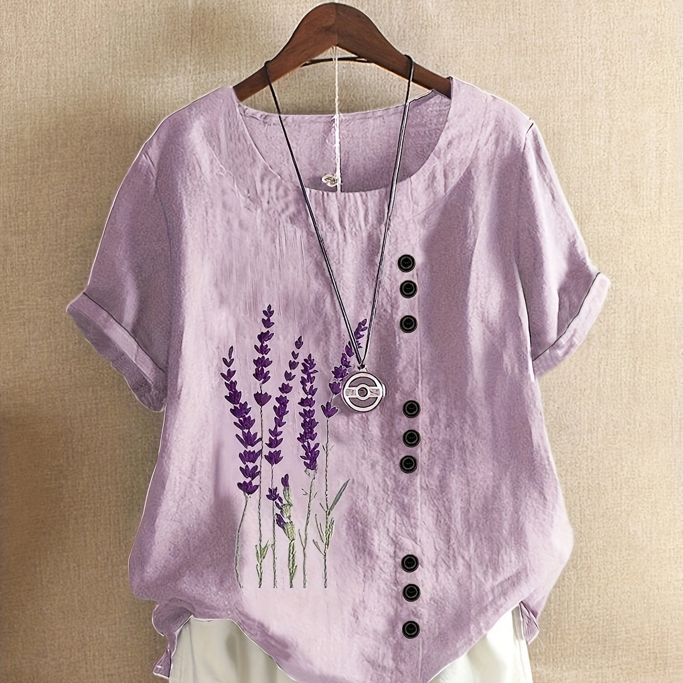 1 dona Ayollar uchun Katta O'lchamdagi Tasodifiy Gul Printli Qisqa Yengli Ko'ylak, Yuqori Bo'yin, Cho'zilmaydigan To'qilgan Matodan va Kesik Qirralardan iborat.