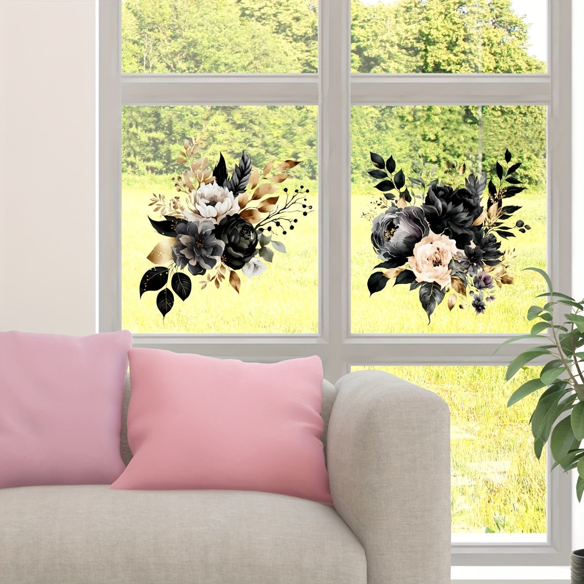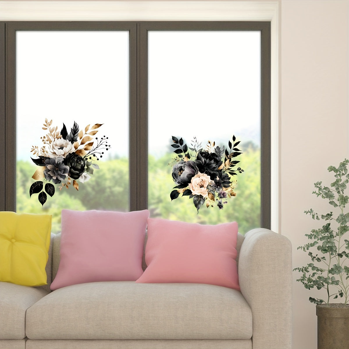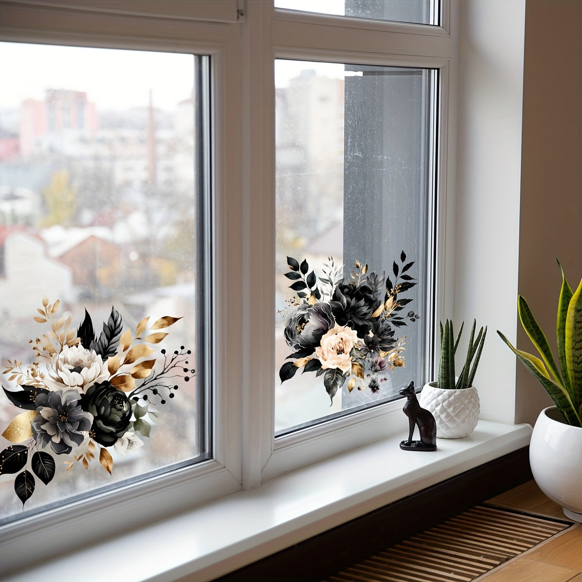 2 Ta'sirli Gullarli Deraza Qoplamalari Zamonaviy Qora va Oltin PVC - Bezakli Shisha Dekoratsiyalari, O'z-o'zidan yopishqoq va olib tashlanadigan Stikerlar Uy va Ofis Derazalarida Ko'rsatish uchun, Deraza Bezaklari