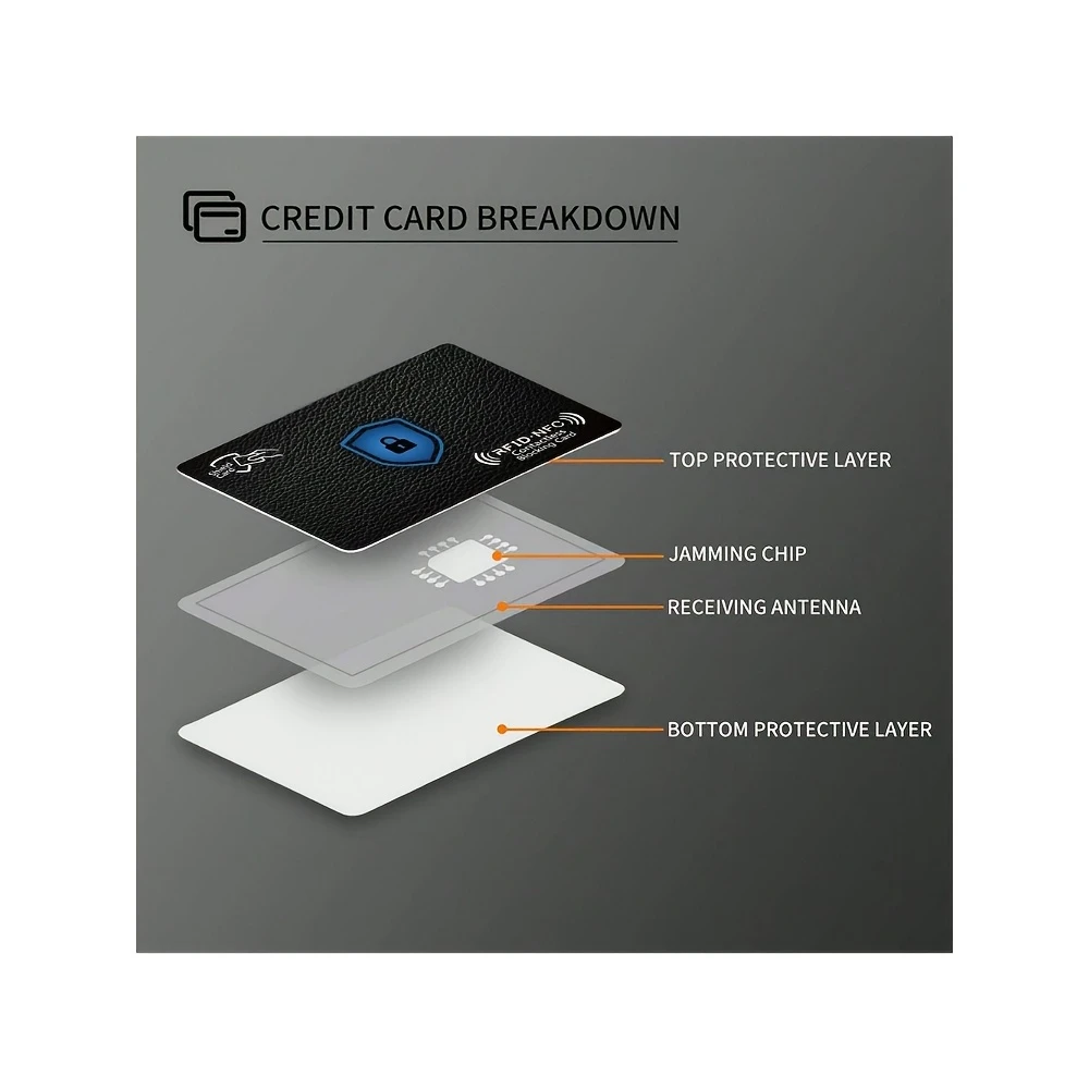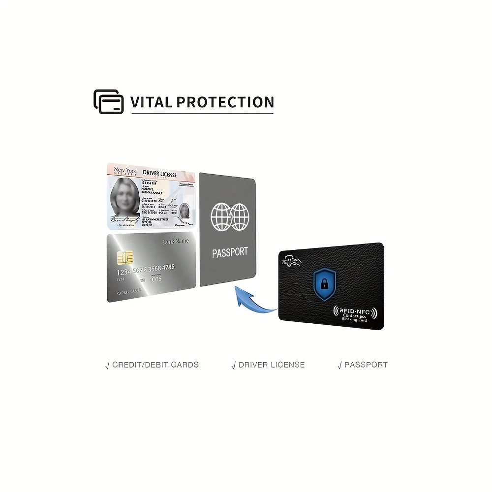 2 yoki 4 RFID/NFC blokirovka kartalari erkaklar va ayollar uchun shaxsiy ma'lumotlarni o'g'irlashdan himoya qilish uchun. Hamyonlar uchun ultra ingichka va zamonaviy dizayn.