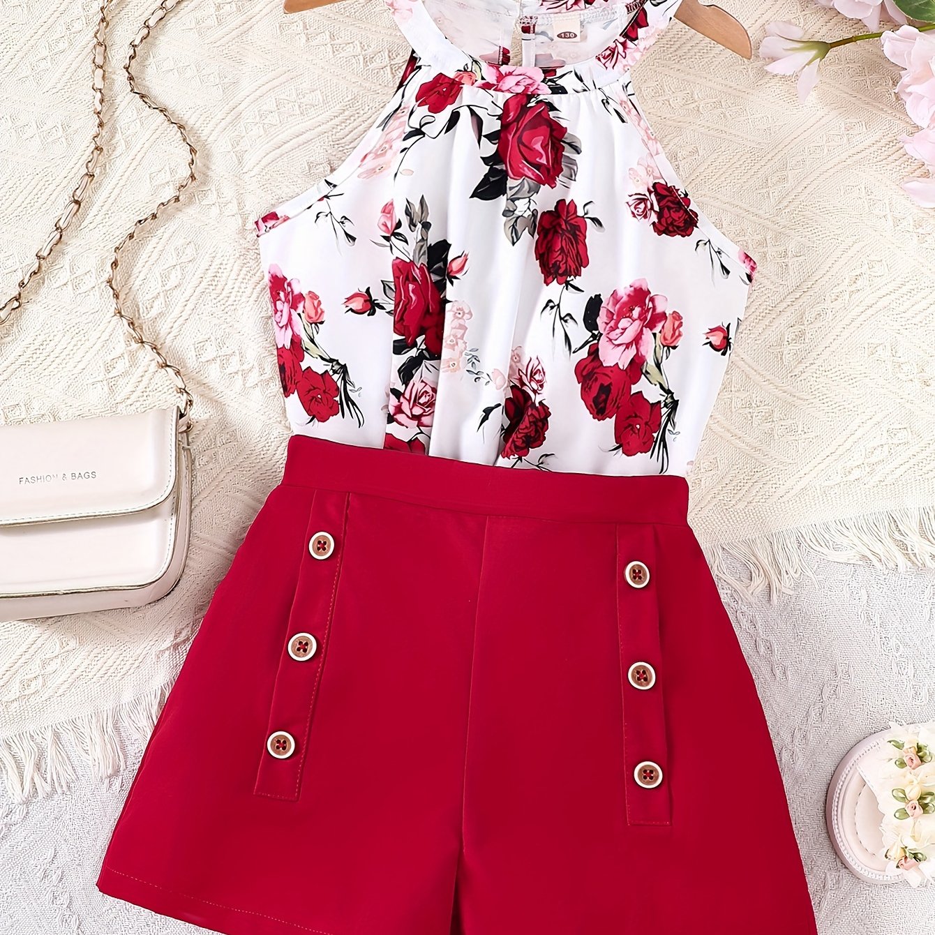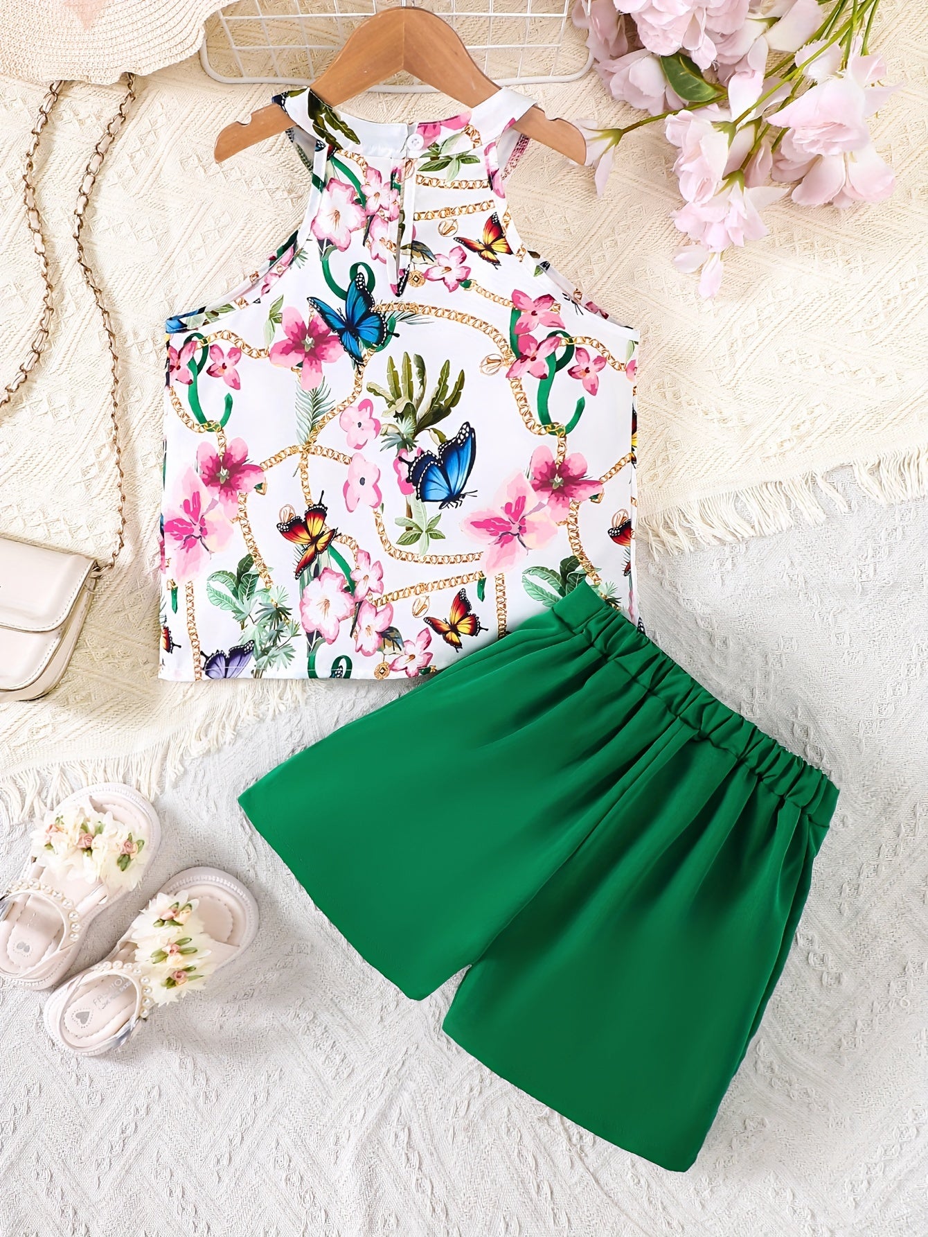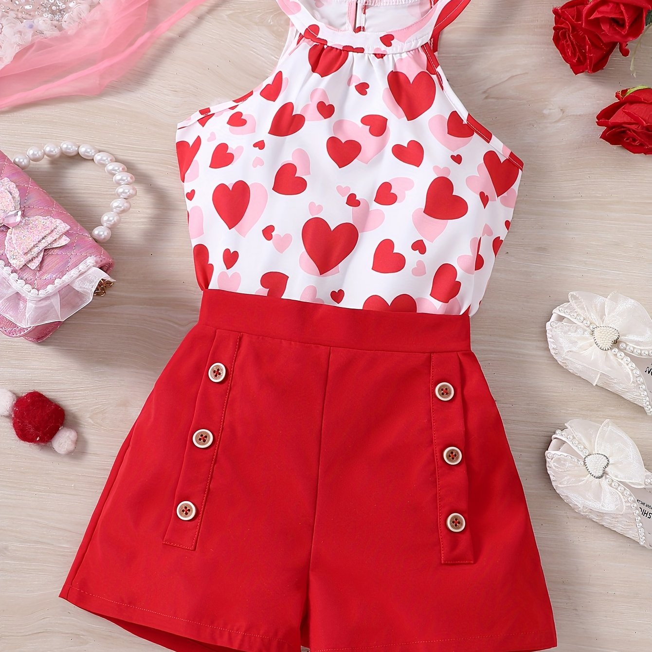 Yozgi faoliyatlar yoki sovg'alar uchun yurak, gullar va kapalak grafikalariga ega bo'lgan halter tepa va tugmachali shortlardan iborat 2-qismli to'plam.