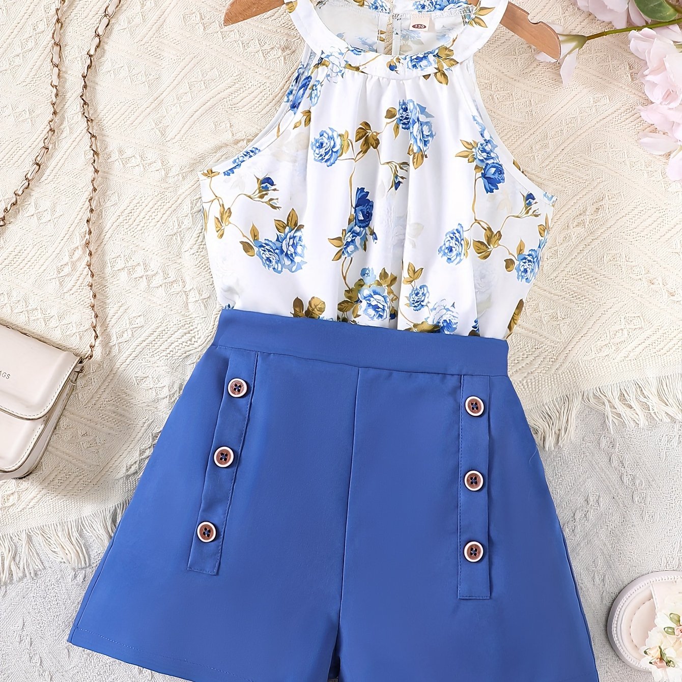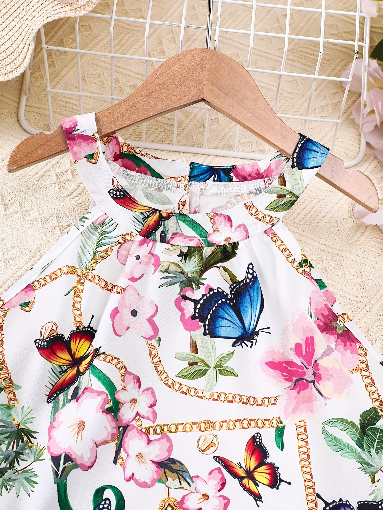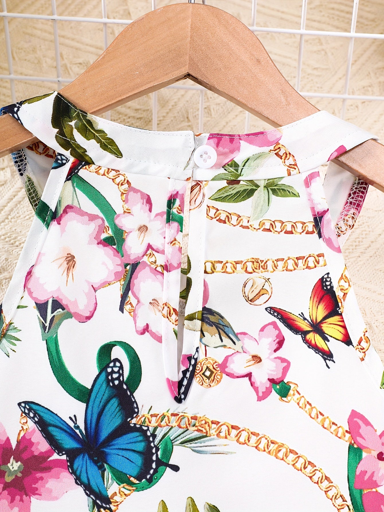 Yozgi faoliyatlar yoki sovg'alar uchun yurak, gullar va kapalak grafikalariga ega bo'lgan halter tepa va tugmachali shortlardan iborat 2-qismli to'plam.