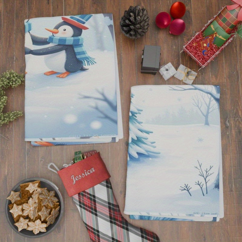 2 dona 18 x 26 dyuymli oshxona sochiq/chaqaloq sochiq to'plami, Rojdestvo va qish bezatish uchun mukammal. Yumshoq qor to'plari bezaklari bilan jozibador "Merry Christmas" dizayni. Sovg'a berish yoki oshxona dekoriga bayramona tuyg'u qo'shish uchun ideal.