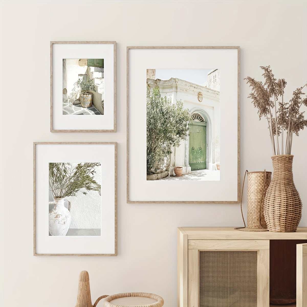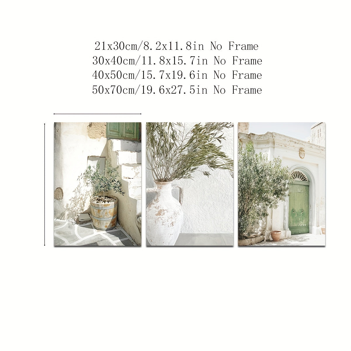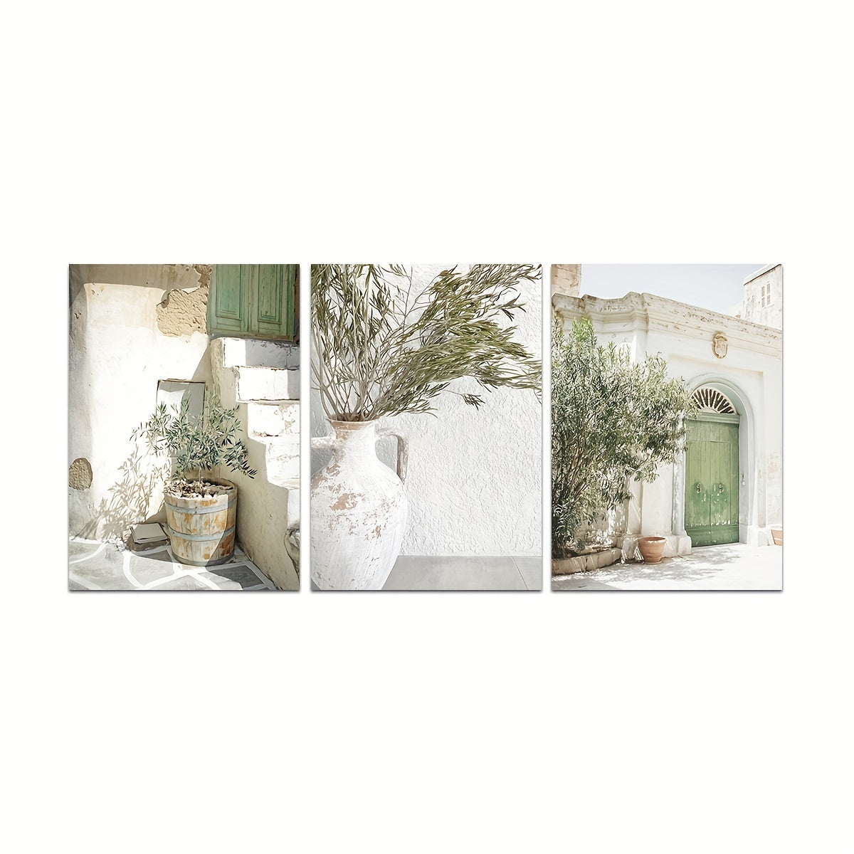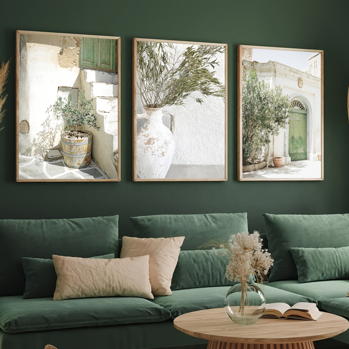 3 zaytun daraxti manzarali san'at nashrlari zamonaviy rustik devor bezaklari uchun, bahor/yoz bargi naqshi bilan. Yashash xonasi, yotoqxona yoki ovqatlanish joyi uchun ideal. Ramkasiz, portret yo'nalishi.