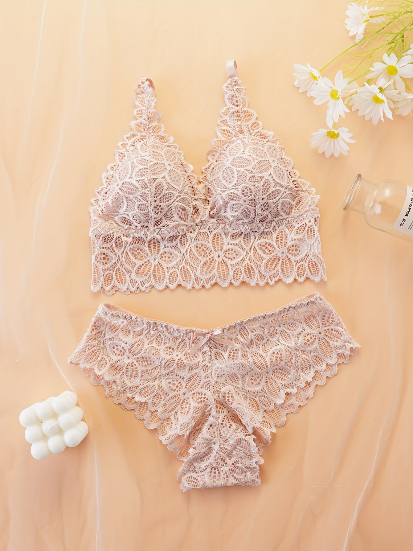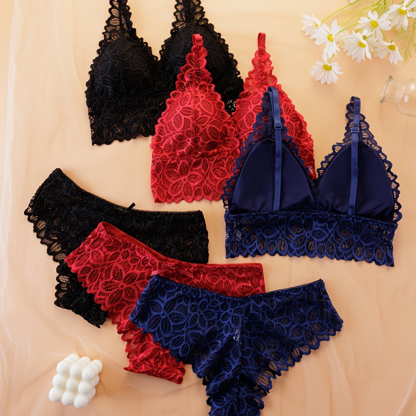 3-qismli gullar bilan bezatilgan dantel ichki kiyim to'plami, simsiz brassiyer va thong ichki kiyimlar bilan