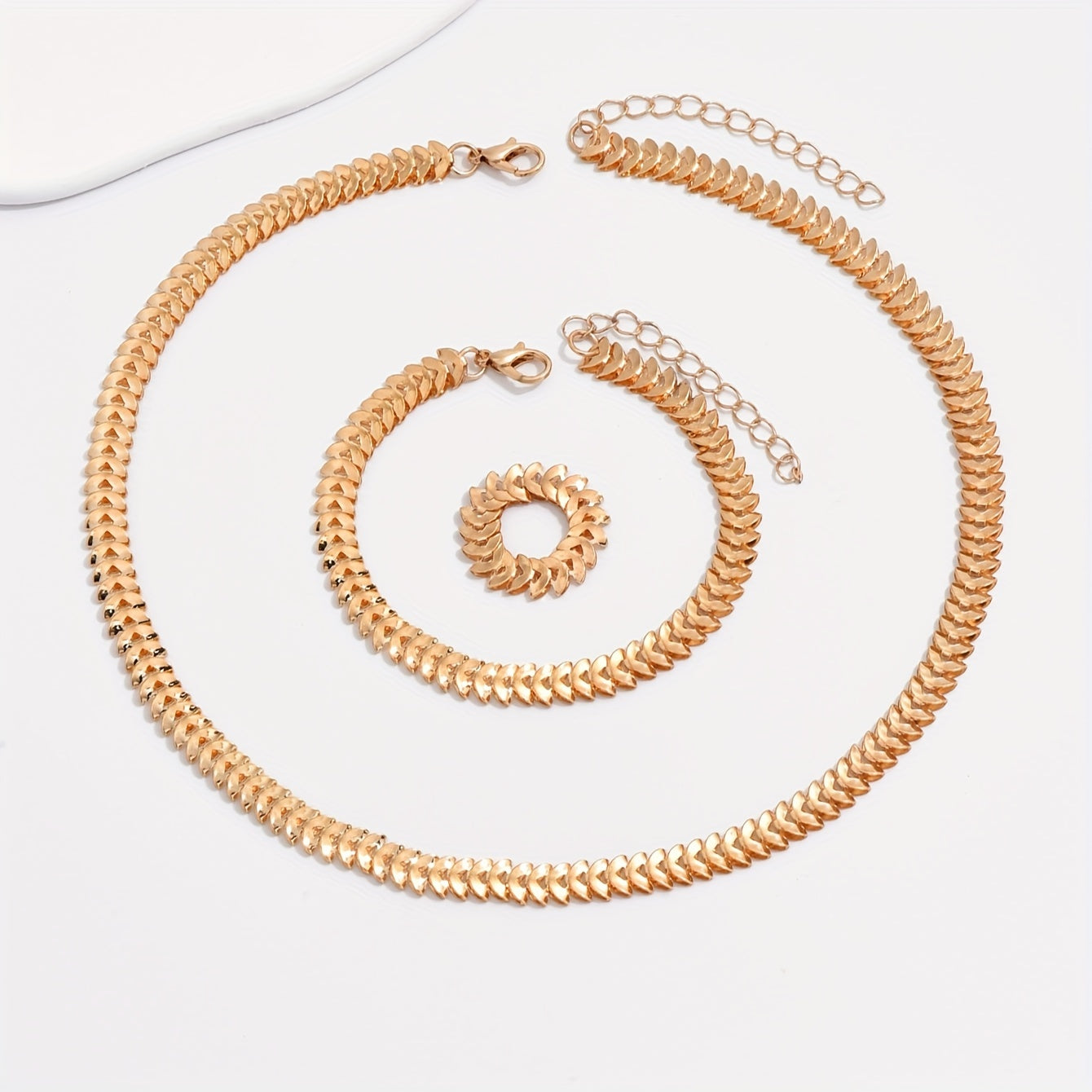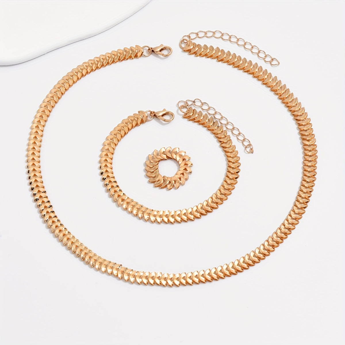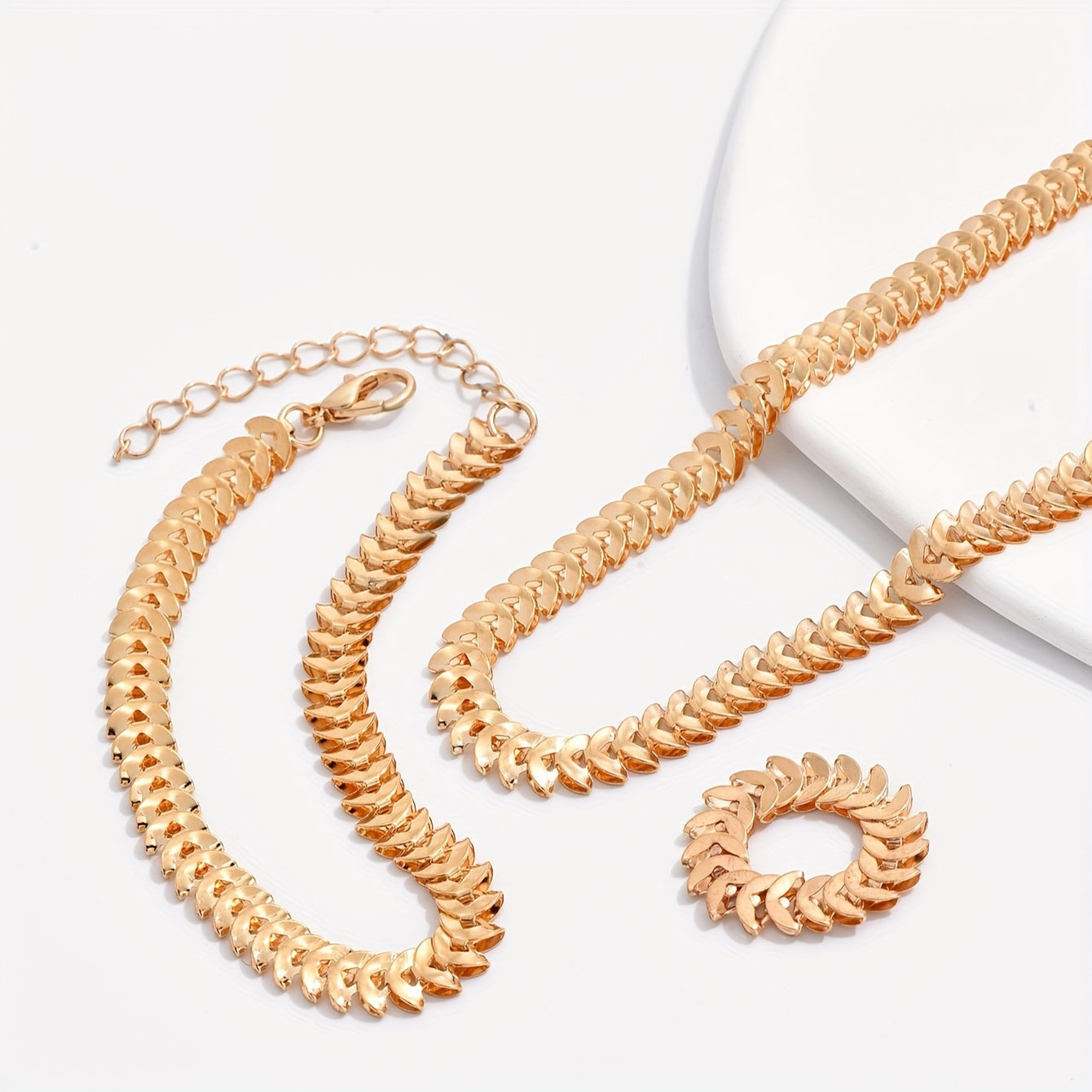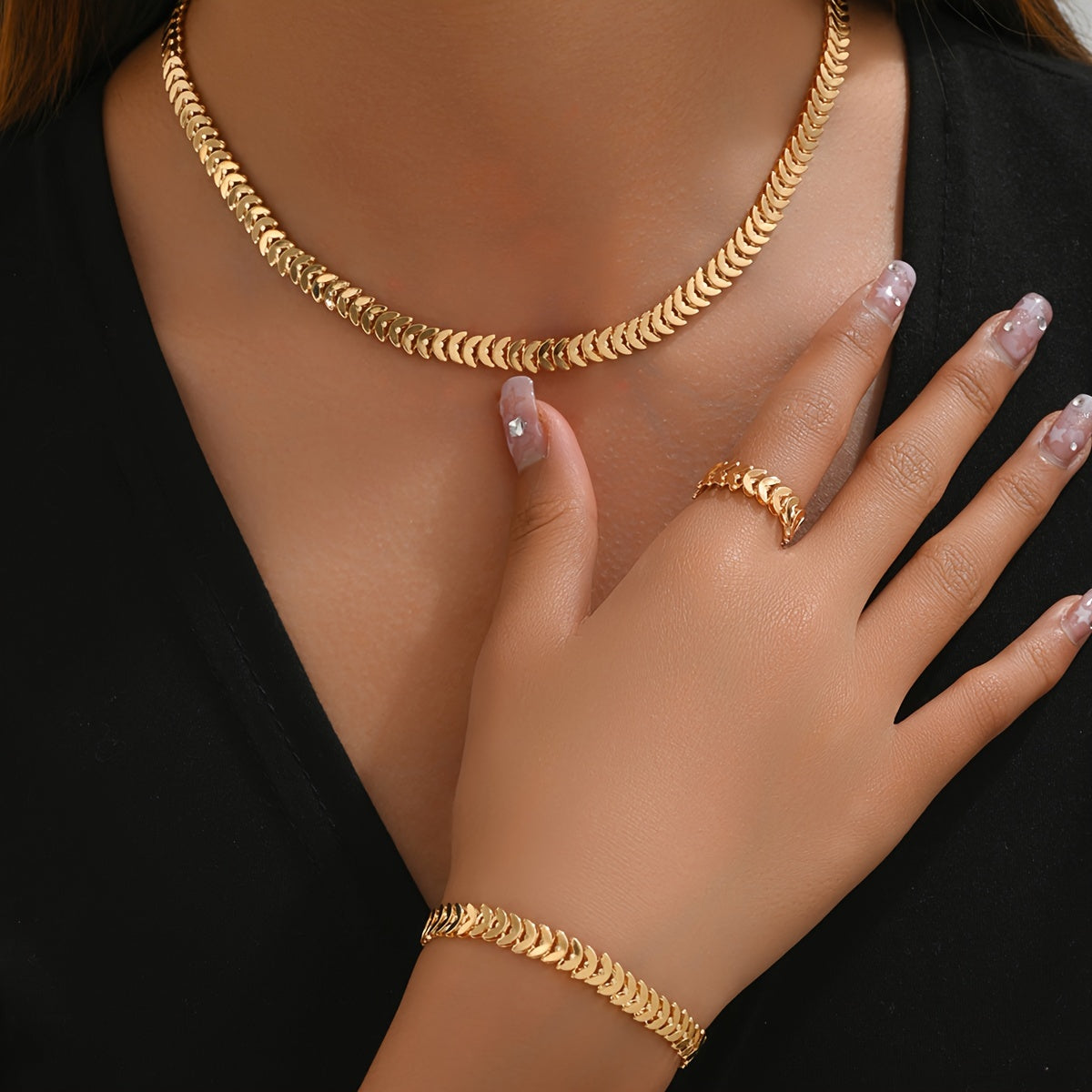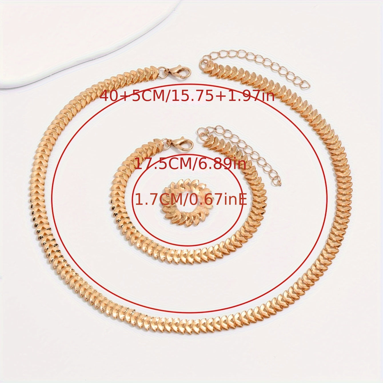 3-qismli yaproq zargarlik to'plami kundalik kiyish, ta'til, dam olish va partiyalar uchun zanjirli marjon, bilaguzuk va uzukni o'z ichiga oladi.