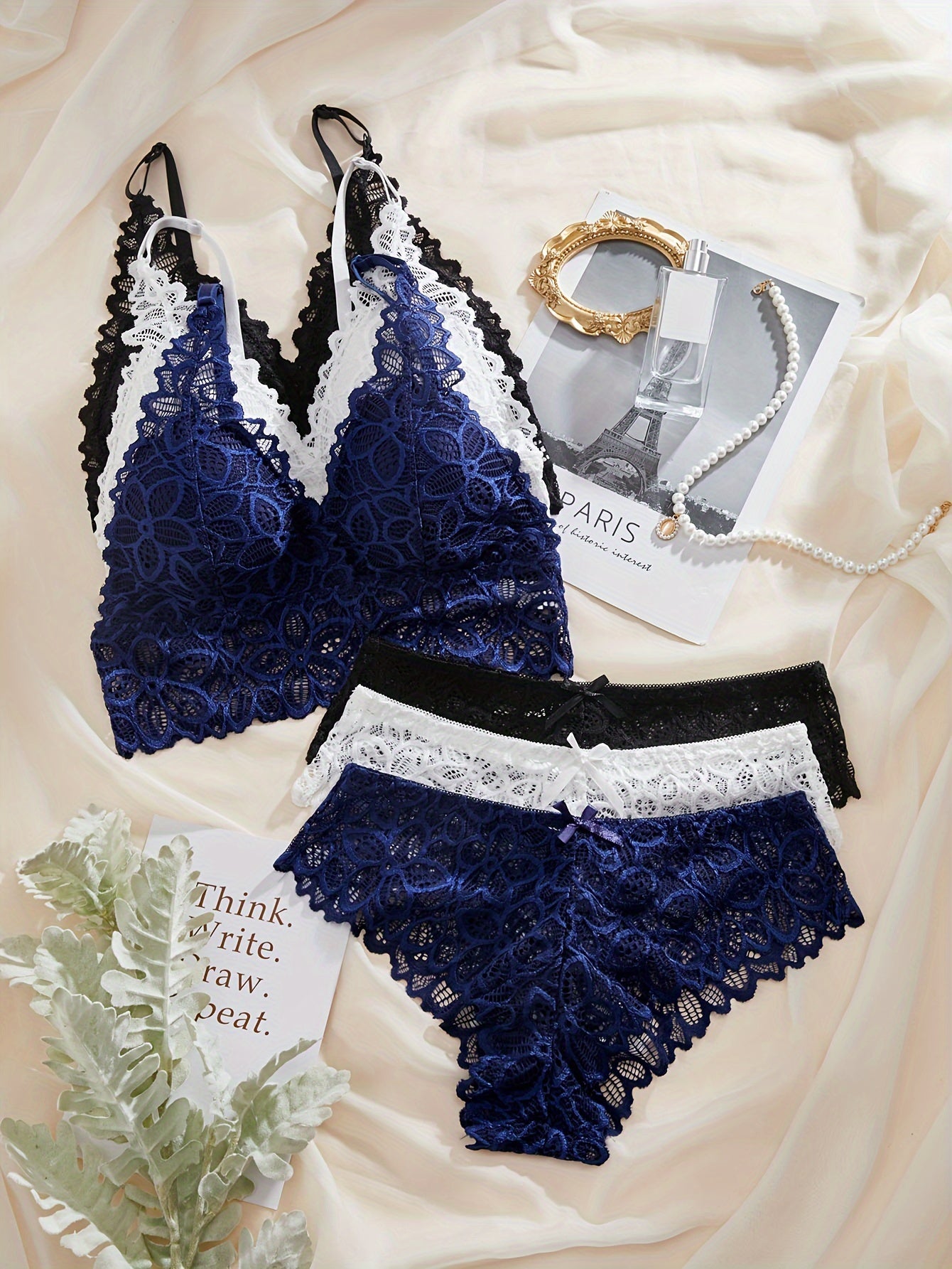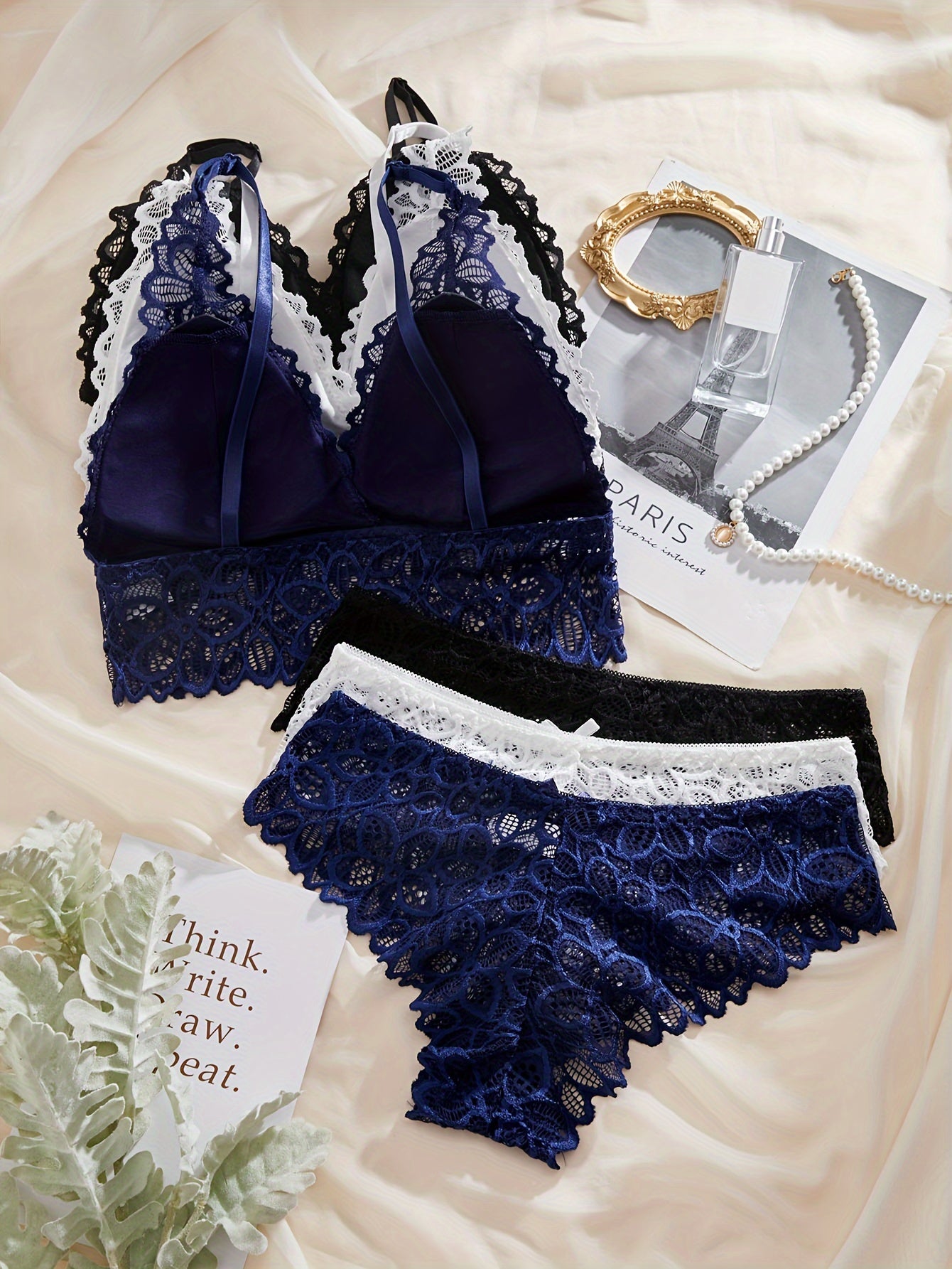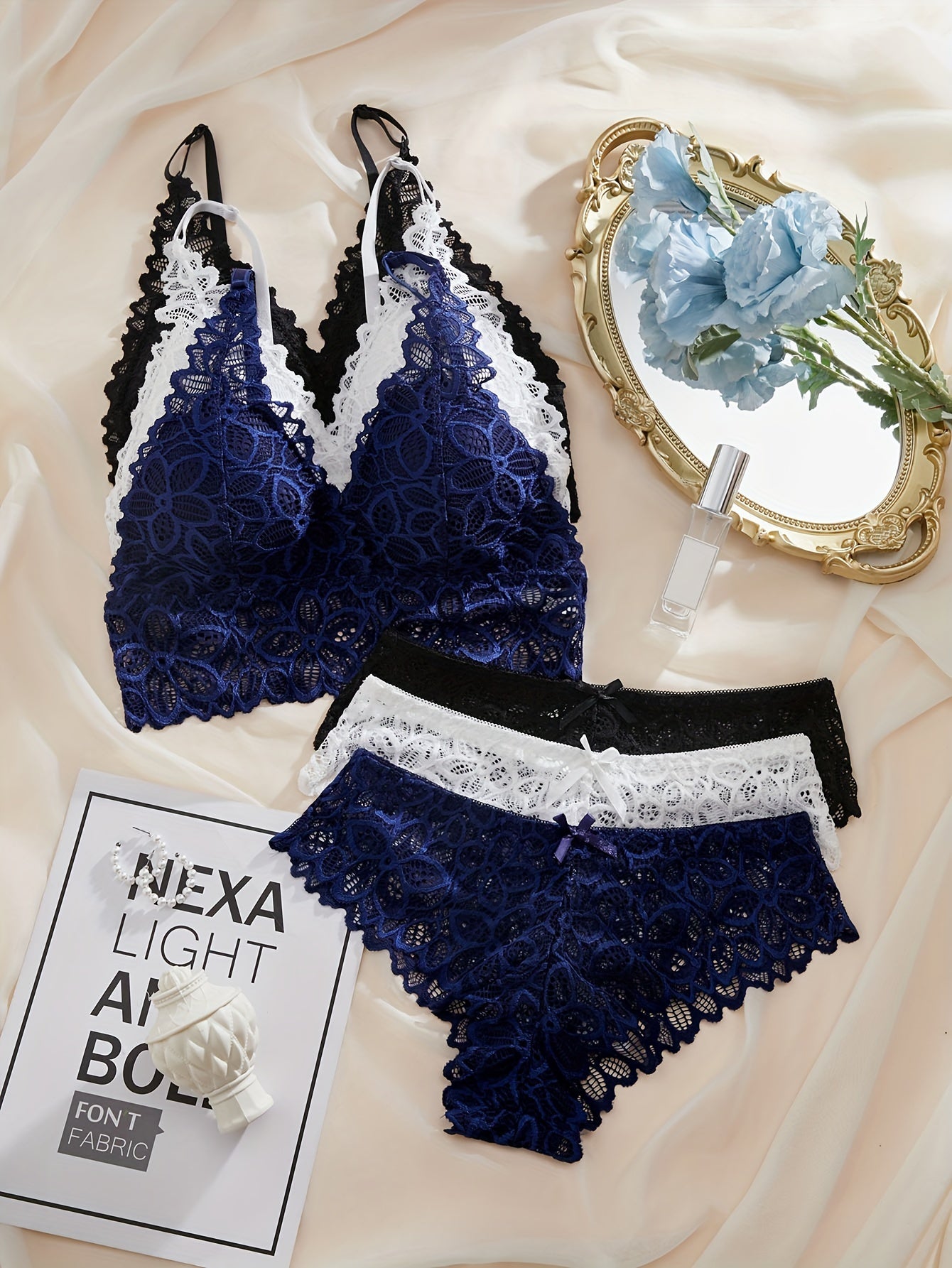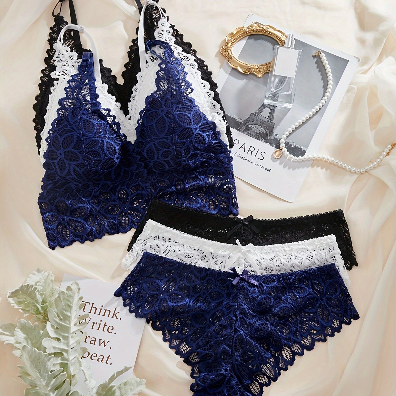 3-qismli romantik gullar bilan bezatilgan dantel ichki kiyim to'plami ayollar uchun
