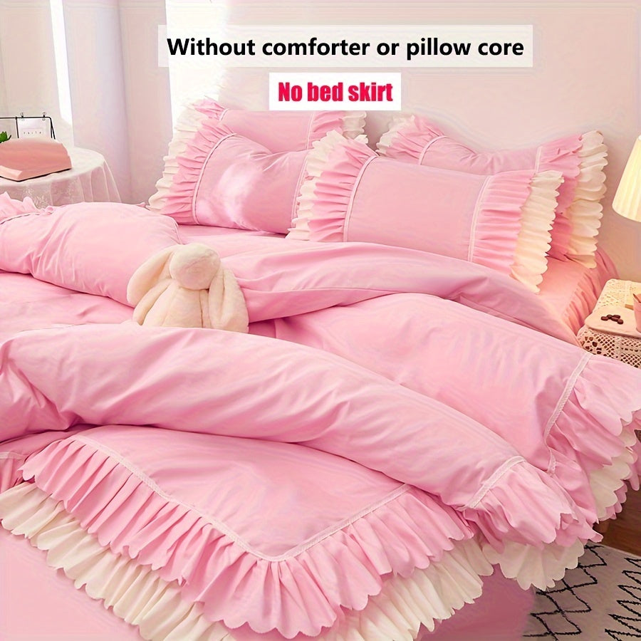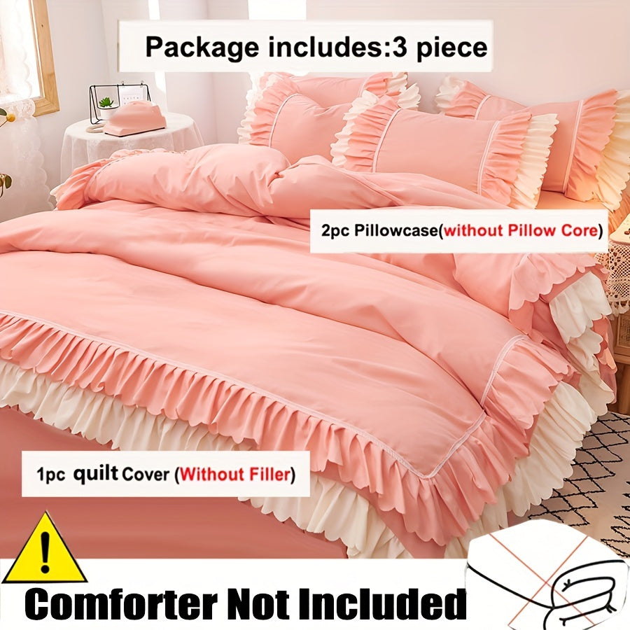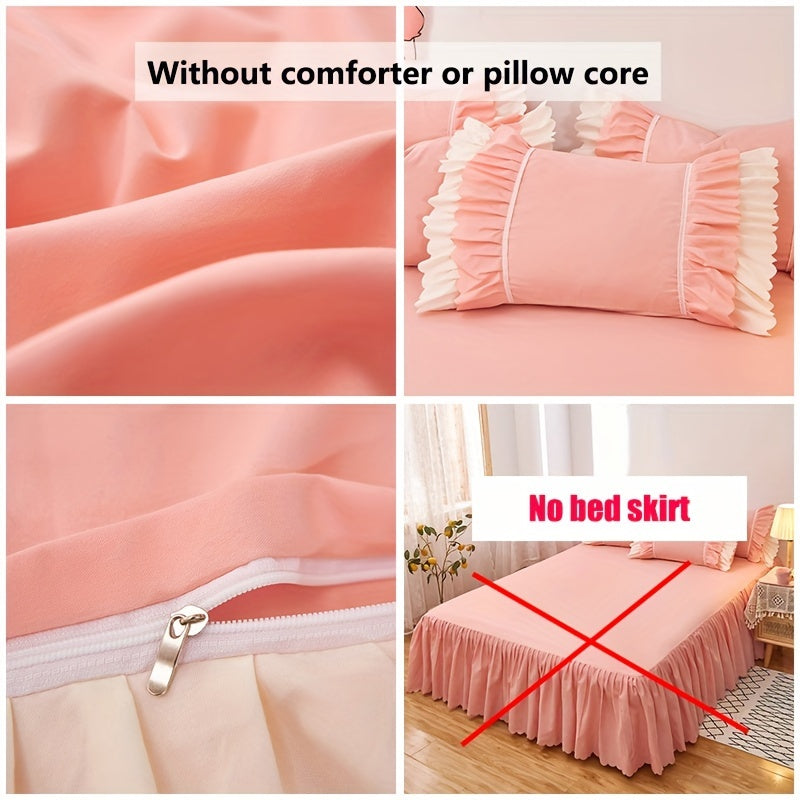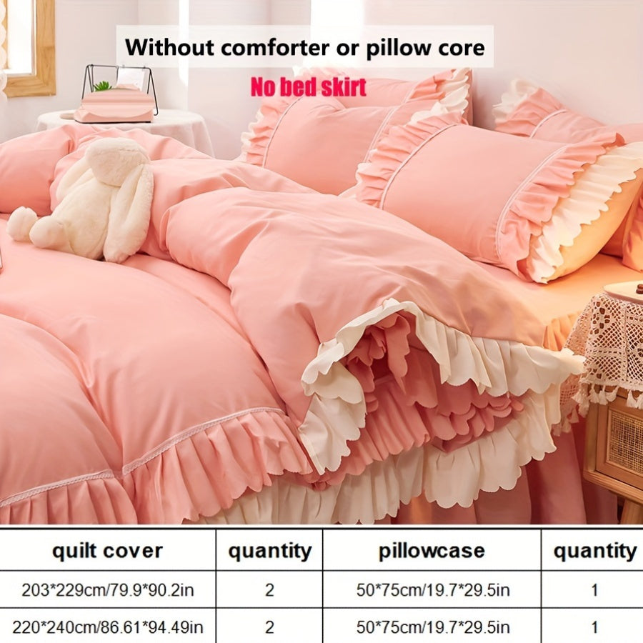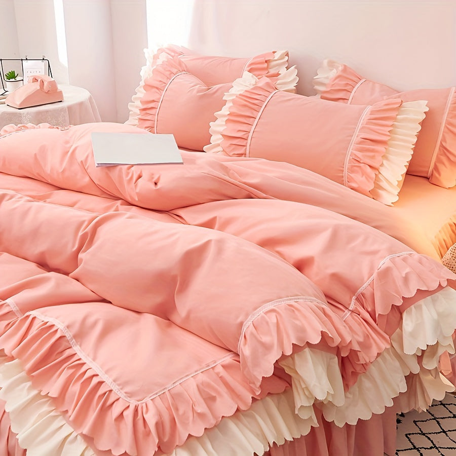 3 qismdan iborat pushti qirralangan to'shak to'plami 2 ta yostiq qopqog'i va 1 ta qopqoqni o'z ichiga oladi, to'ldiruvchi yoki qulaylik kiritilmagan.