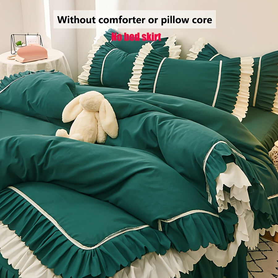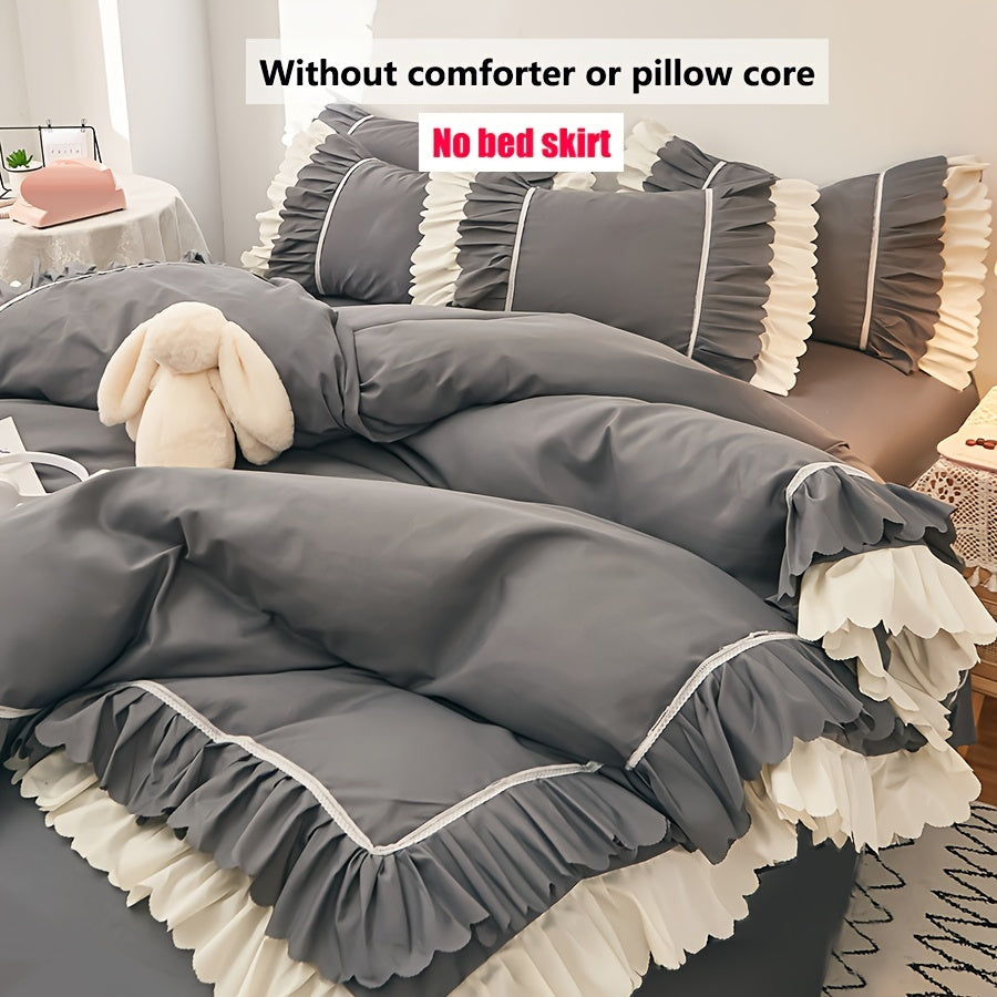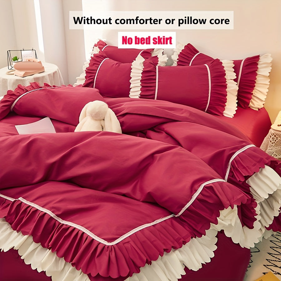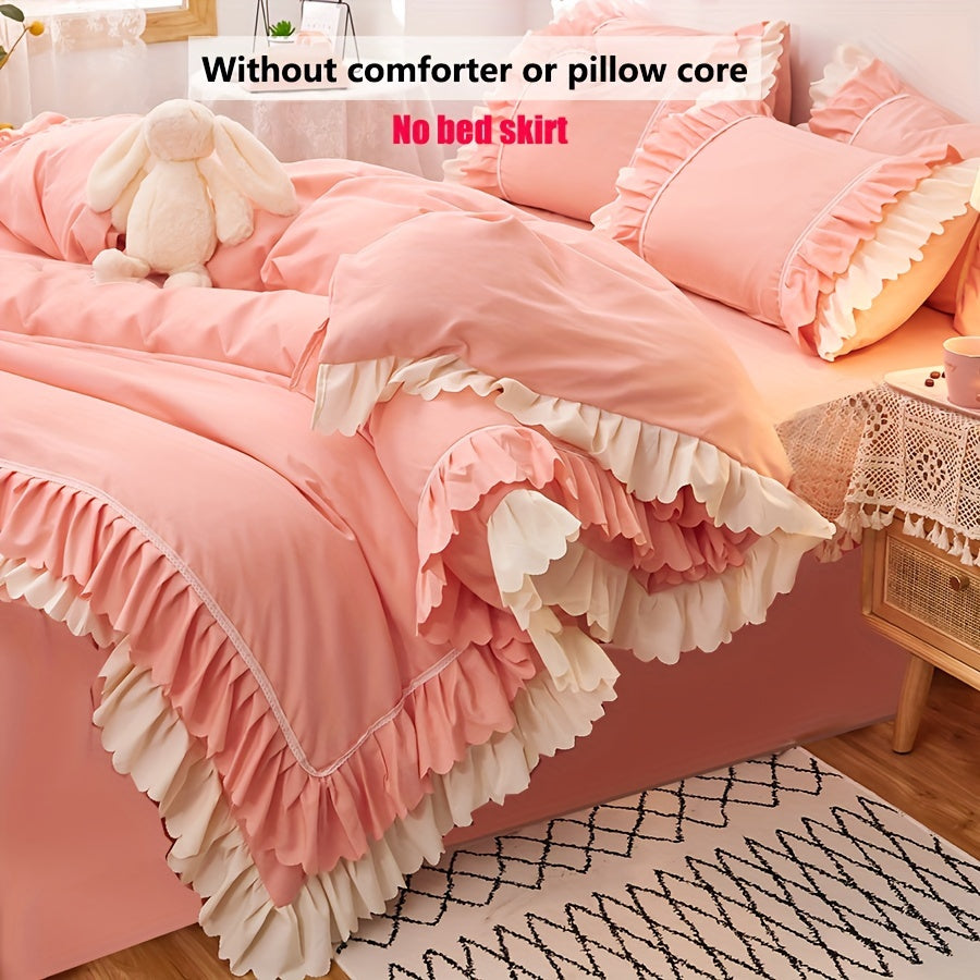 3 qismdan iborat pushti qirralangan to'shak to'plami 2 ta yostiq qopqog'i va 1 ta qopqoqni o'z ichiga oladi, to'ldiruvchi yoki qulaylik kiritilmagan.