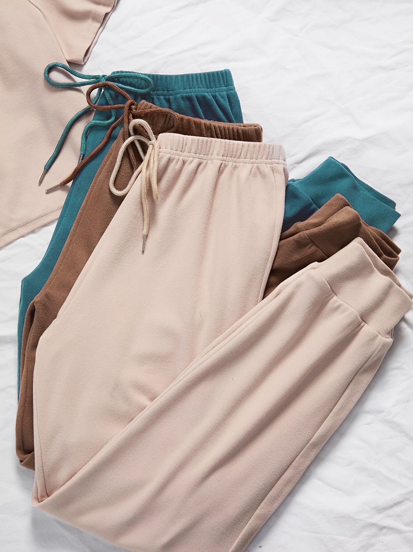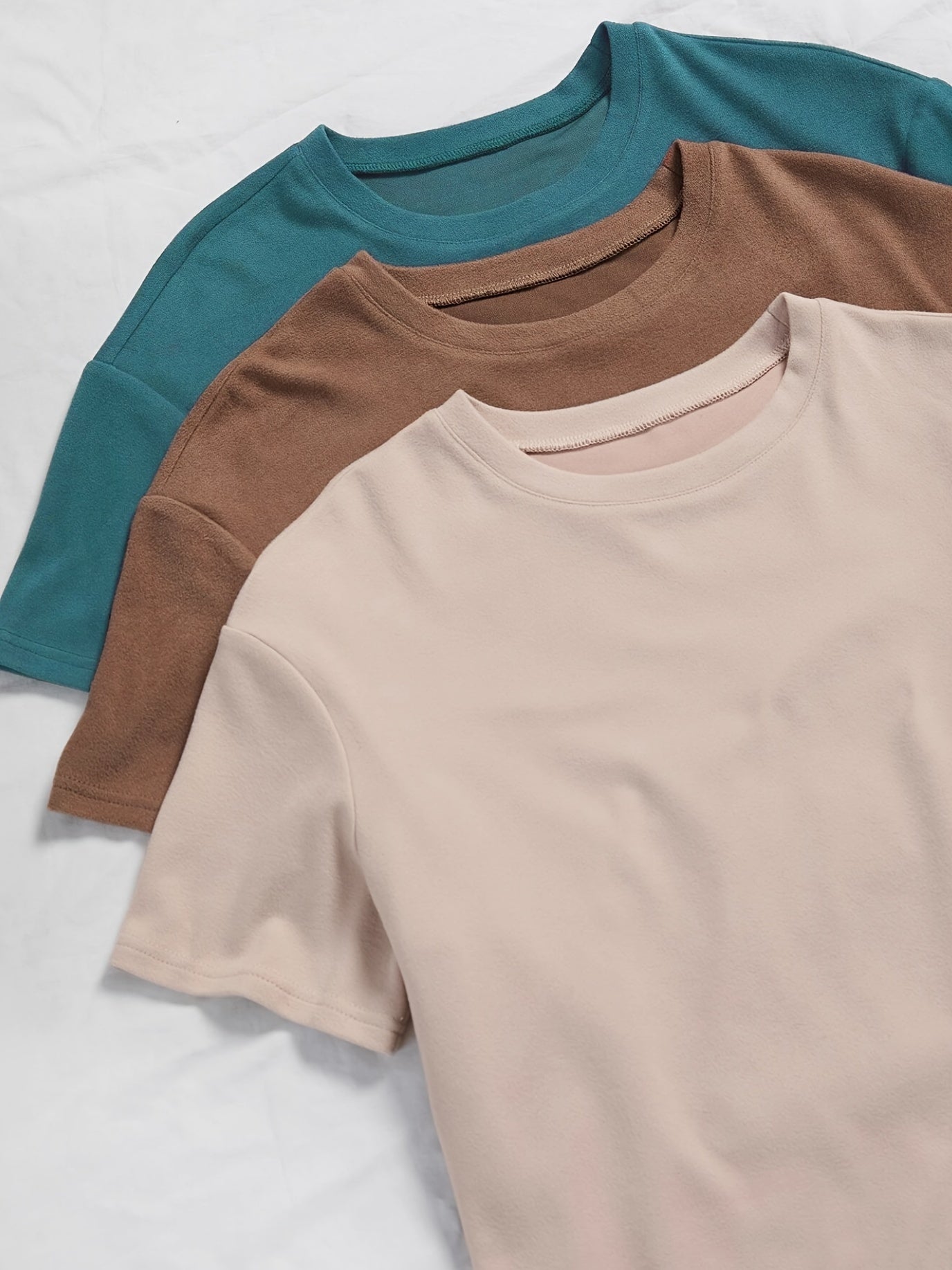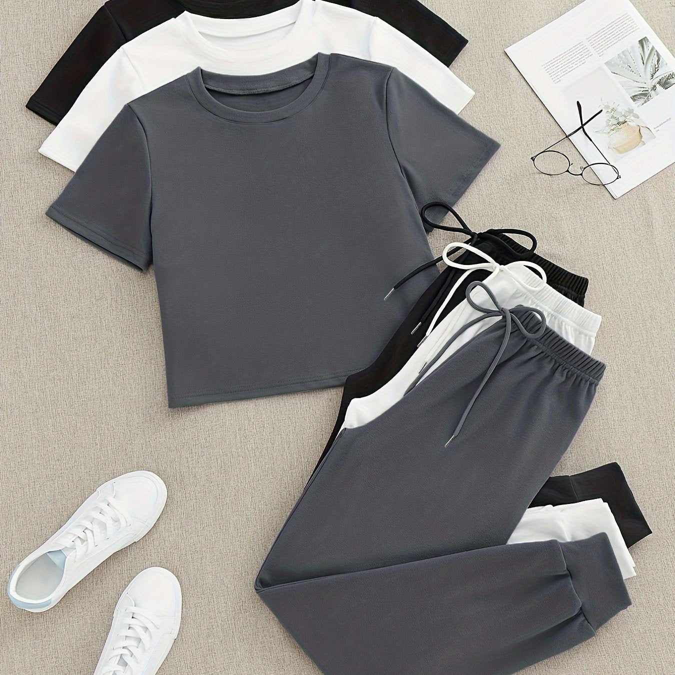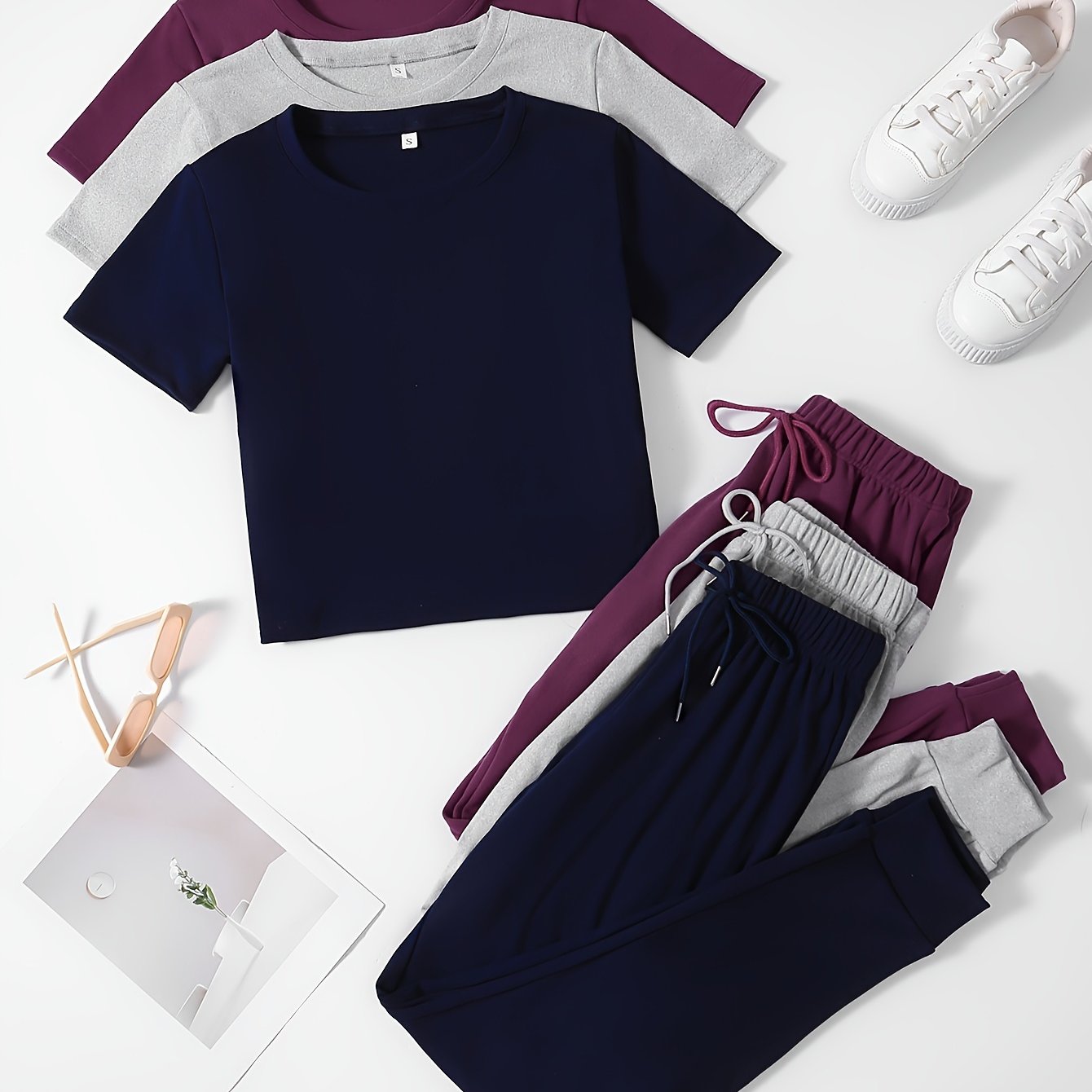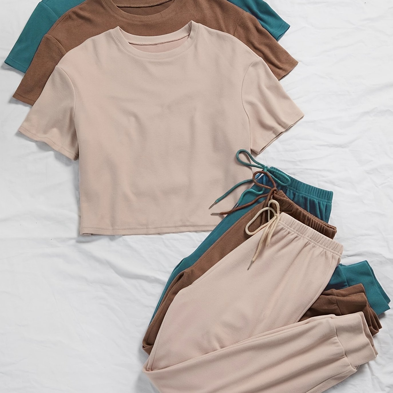 3 ta to'plam ayollar uchun bir rangli dam olish to'plamlari, qulay T-ko'ylak va bog'ichli shimlar bilan. Yengil tasodifiy kiyim uchun bir nechta ranglarda mavjud.