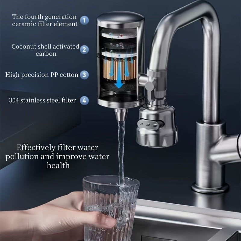 304 zanglamas po'latdan yasalgan kran suv filtri, ko'p yo'nalishli dush boshli - xlor, miya va og'ir metallarni kamaytirish uchun keramik kompozit kartuşli kran tozalagich, elektr energiyasi talab qilinmaydi.