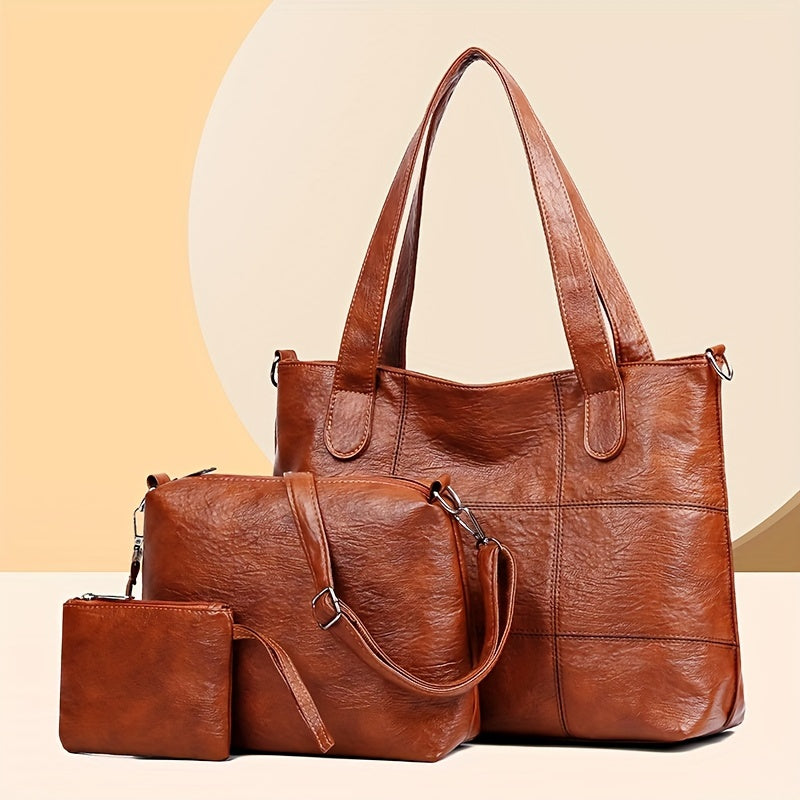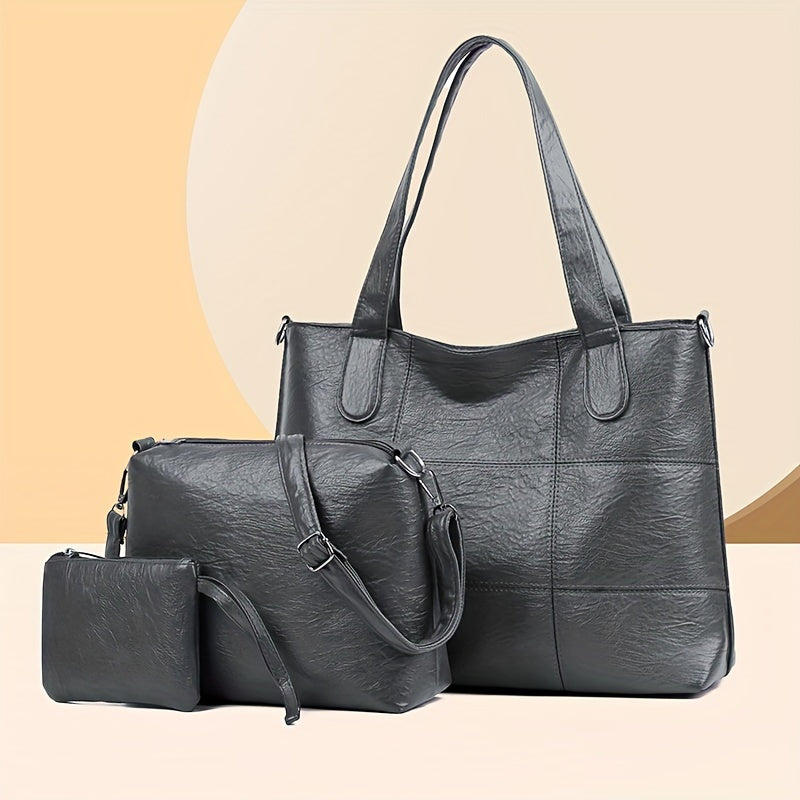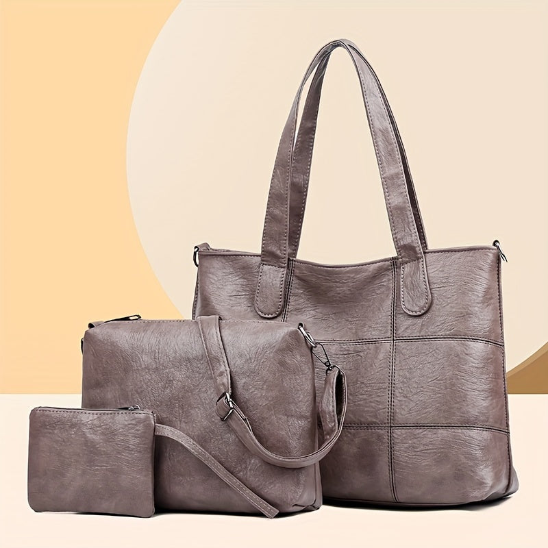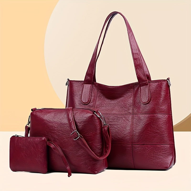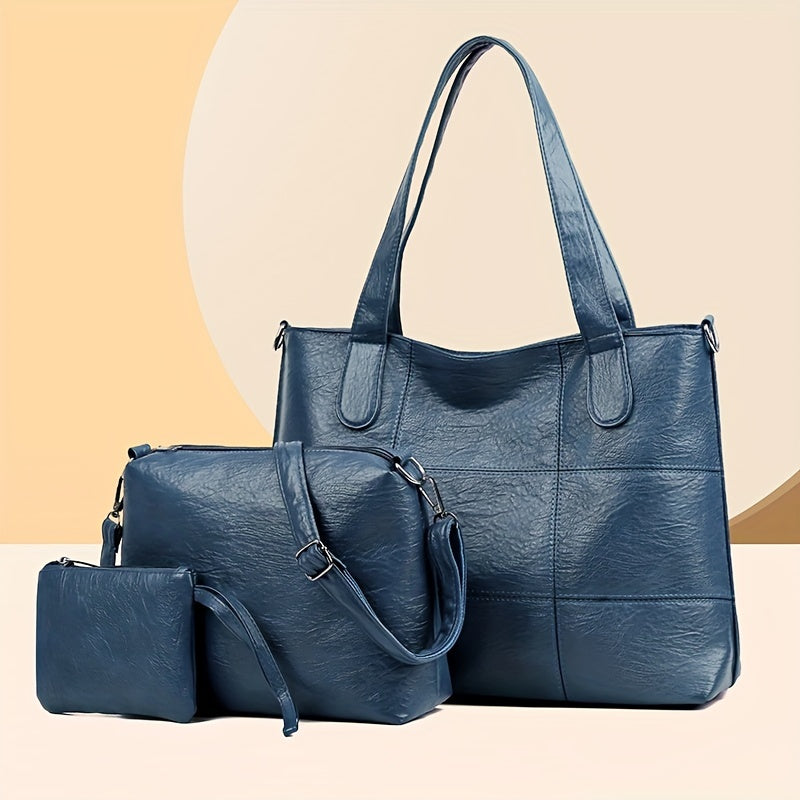 3 dona ayollar uchun sumka to'plami, bir rangli yelka va kesma sumkalar bilan. Qattiq kamarlar, fermuar yopilishi, naylon astar va chekka bo'yoq tafsilotlari mavjud. Xarid qilish, sayohat va ish uchun mos.