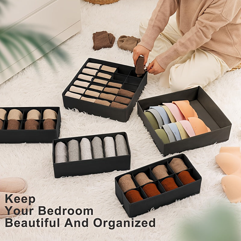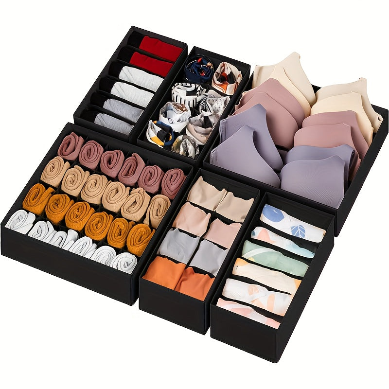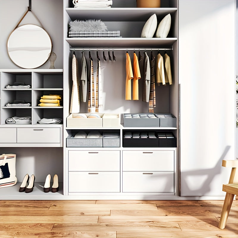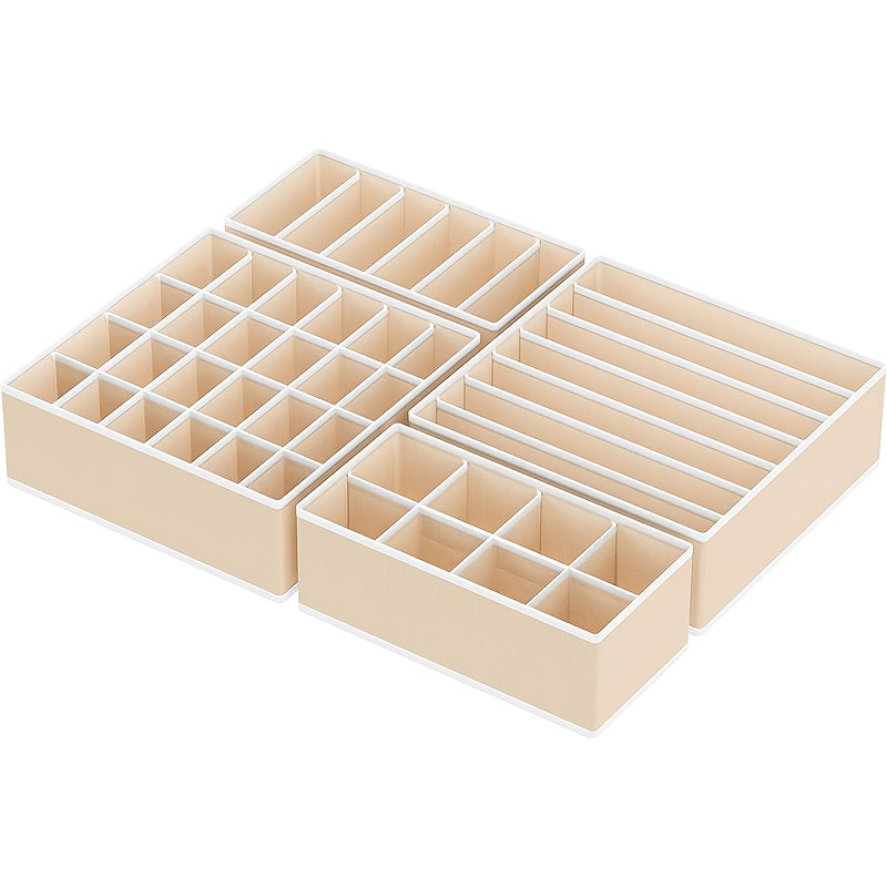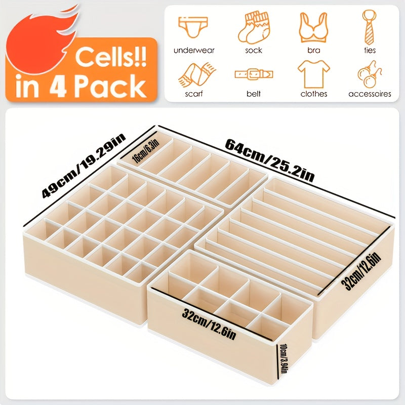 4 ta yig'iladigan saqlash qutilari o'lchami 64.01 sm X 49.0 sm X 10.01 sm. Kiyimlar, paypoqlar, kamarlar va uy bezaklarini tartibga solish uchun ideal.