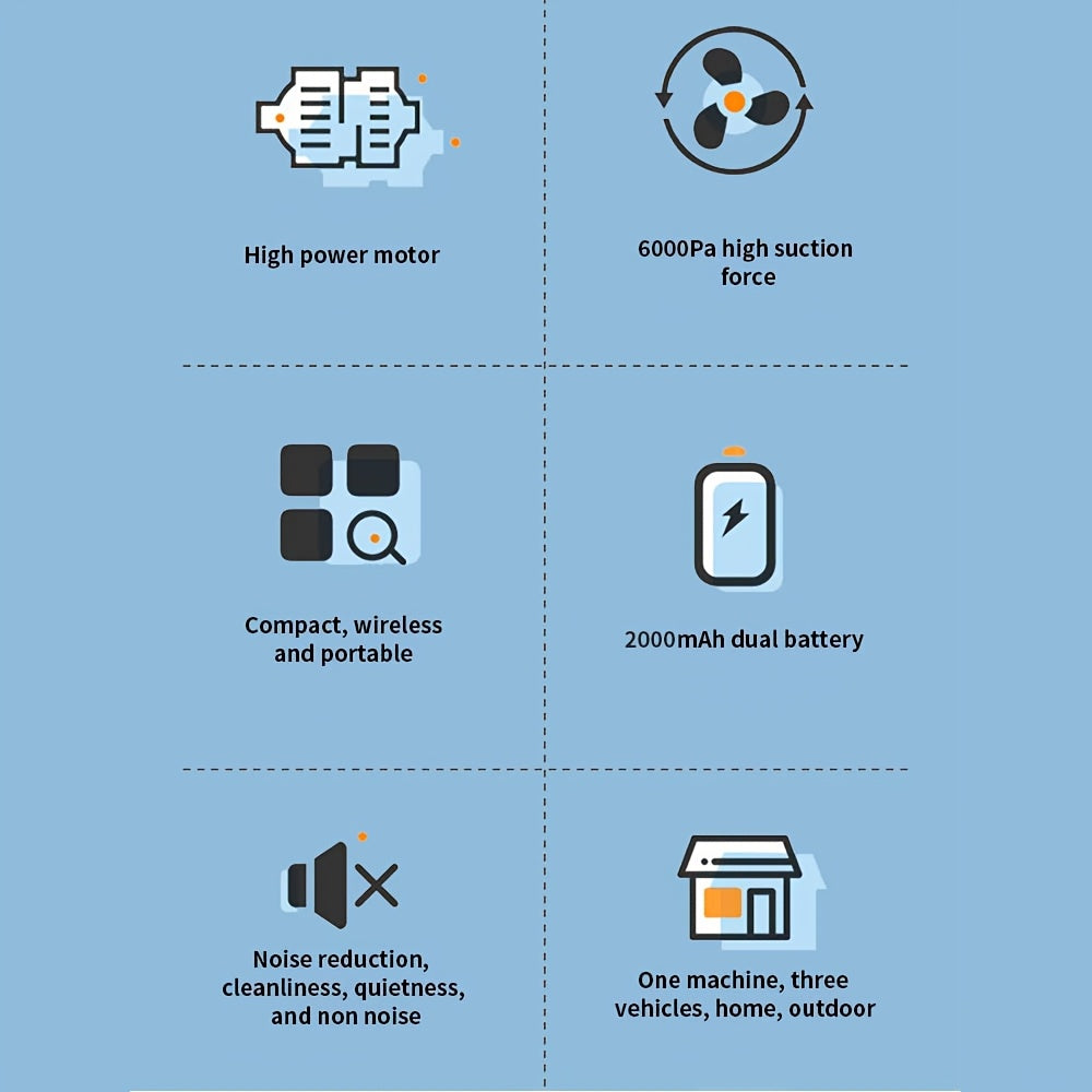 5/7 dona qo'l vakuum tozalagichi to'plami, yuqori quvvatli so'rish, simsiz, portativ, 2000mAh litiy batareya, USB orqali zaryadlanadigan, cartridge filtri, 45dB jim ishlash, 6KPa so'rish, ABS