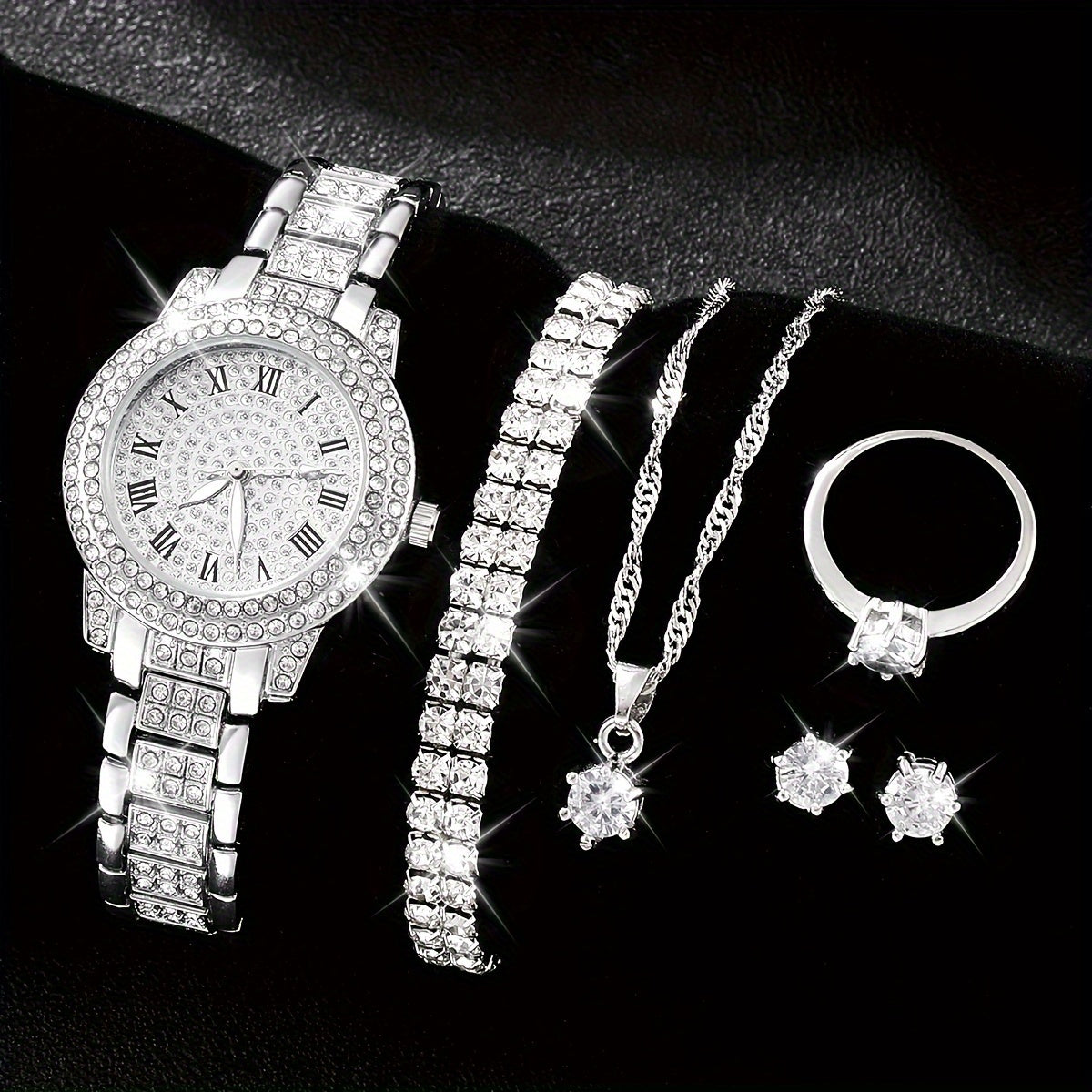 6 dona Nafis Ayollar uchun Kvarts Soat va Zargarlik To'plami, Soxta Olmoslar bilan - Bohem uslubi, Alloy Rim raqamli Bilaguzuk, Kristall Aksessuarlar bilan - U uchun Mukammal Retro Sovg'a