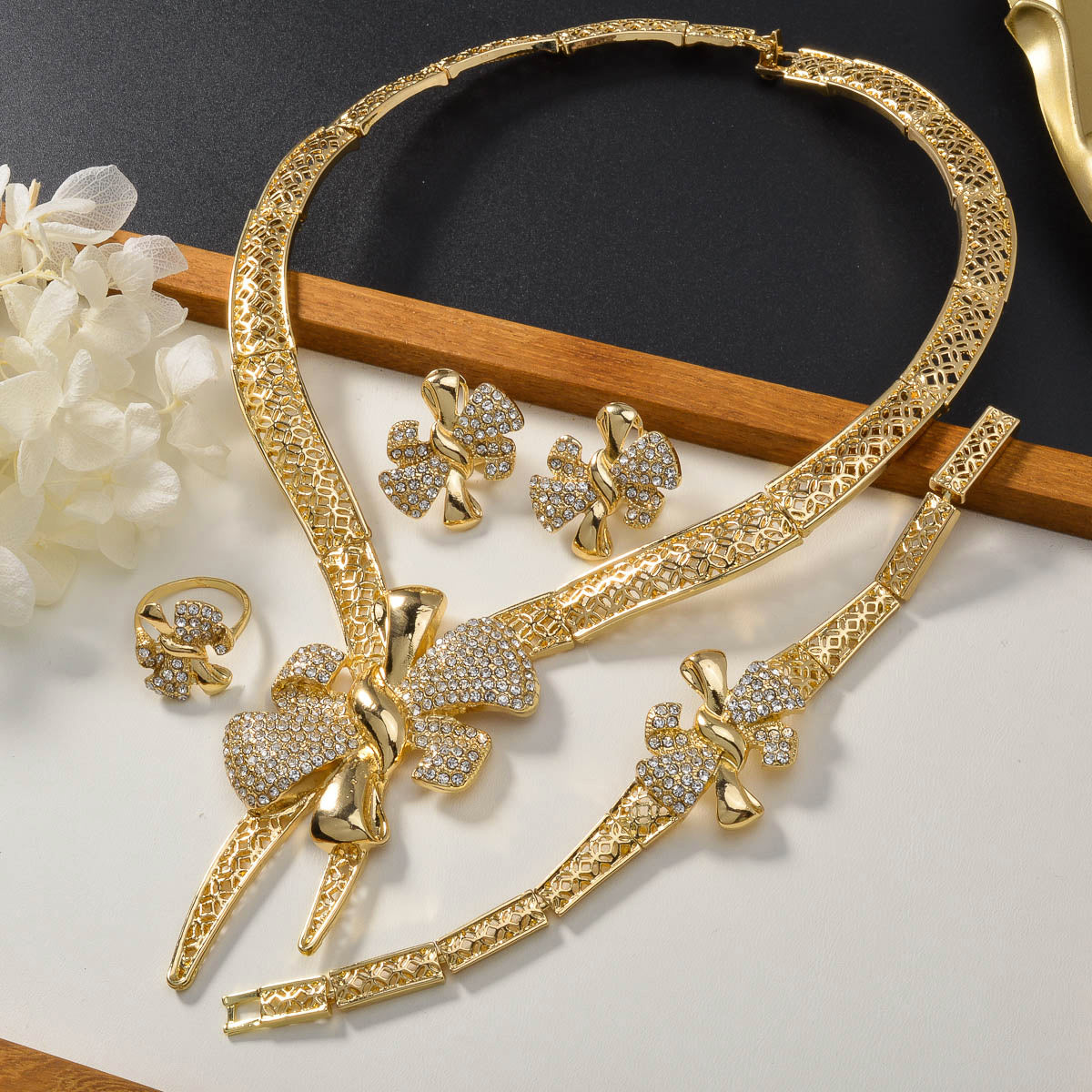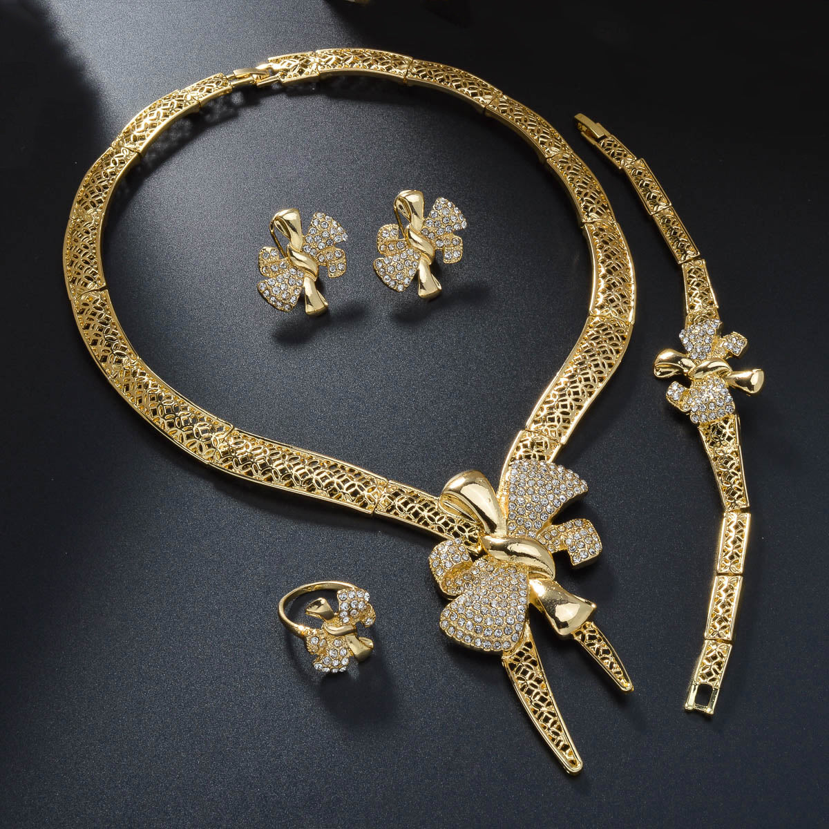 Ayollar uchun ajoyib mis zargarlik to'plami, porloq kamon, murakkab geometrik naqshlar va hashamatli marjon, bilaguzuk, sirg'a va uzukni o'z ichiga oladi. Ushbu retro Sharqiy uslub to'plami partiyalar, banketlar uchun mukammal va ajoyib.