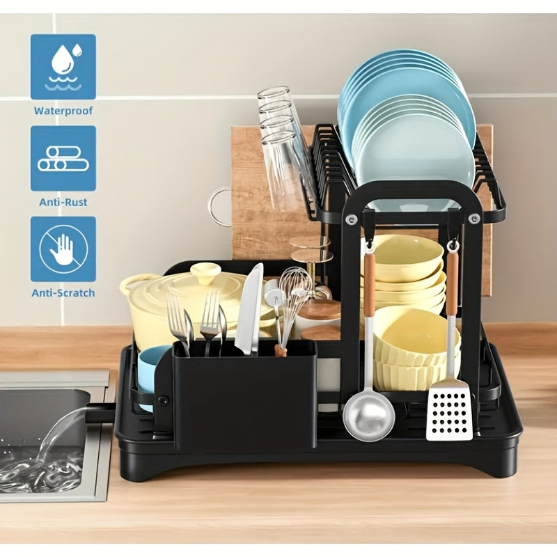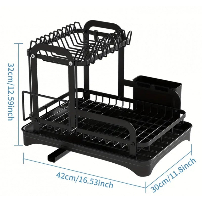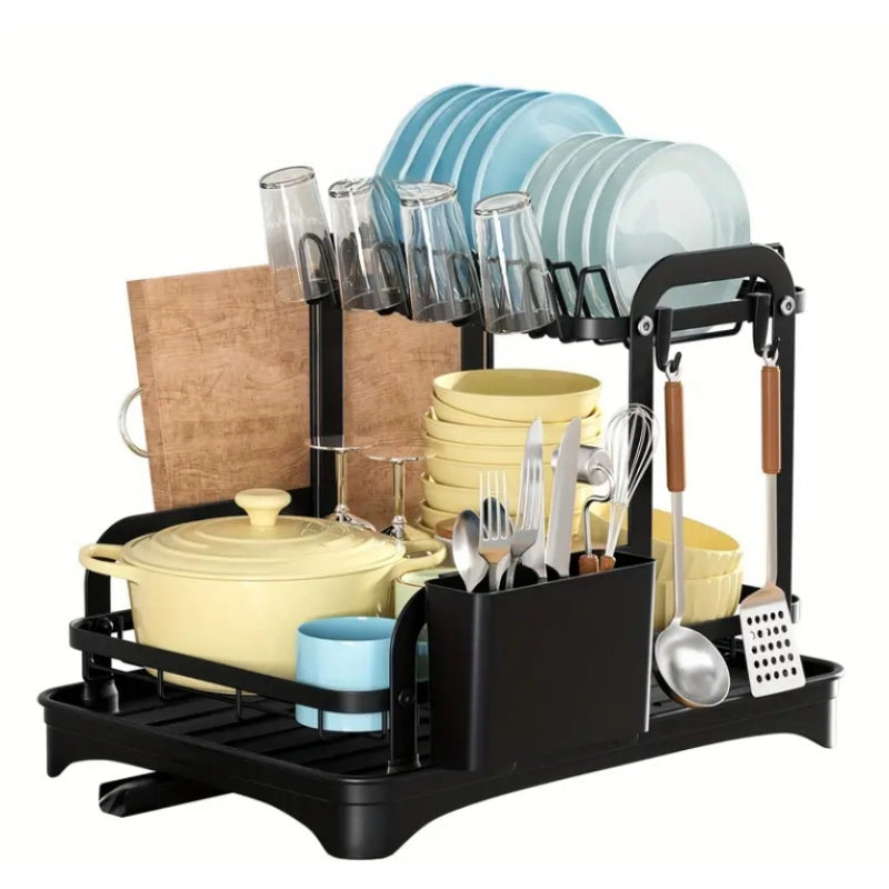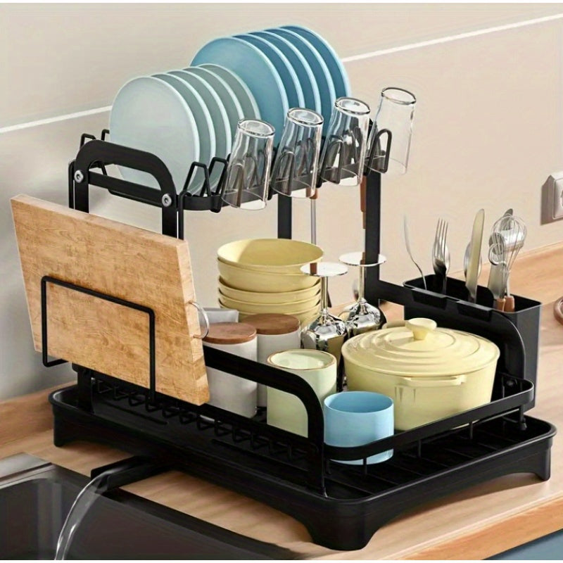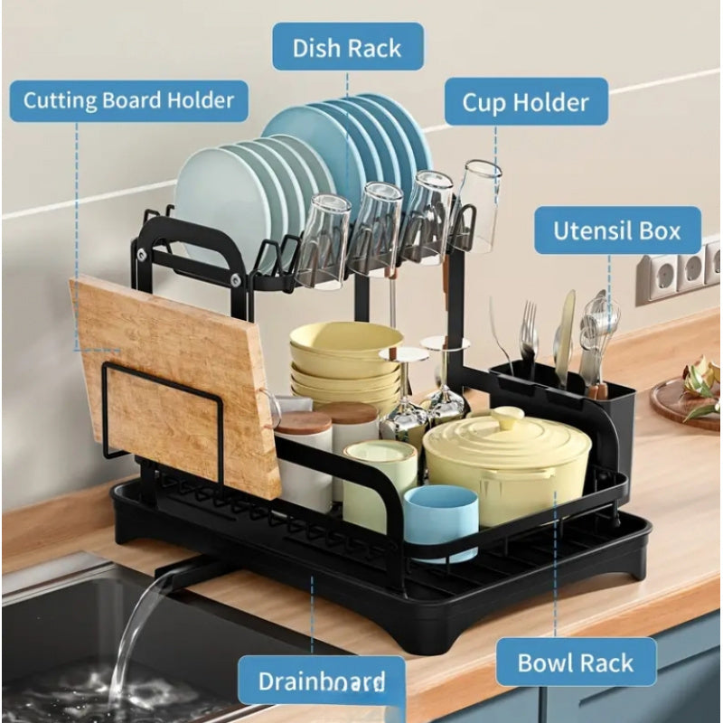 Ikkita qavatli, suyuqlik oqadigan taxtasi va turli oshxona aksessuarlariga ega bo'lgan po'lat idish quruq rack to'plami, oshxona lavabosining ustida va ish yuzasida joyni maksimal darajada oshirish va quritish imkoniyatini yaratish uchun mo'ljallangan.