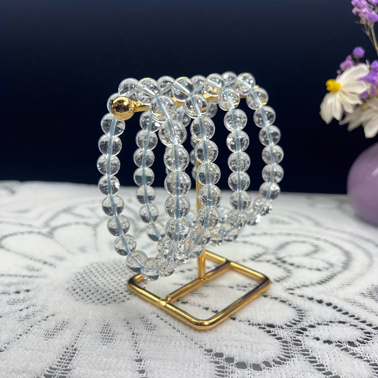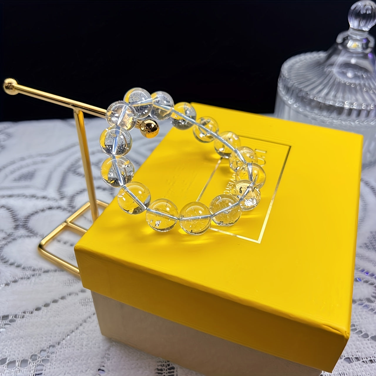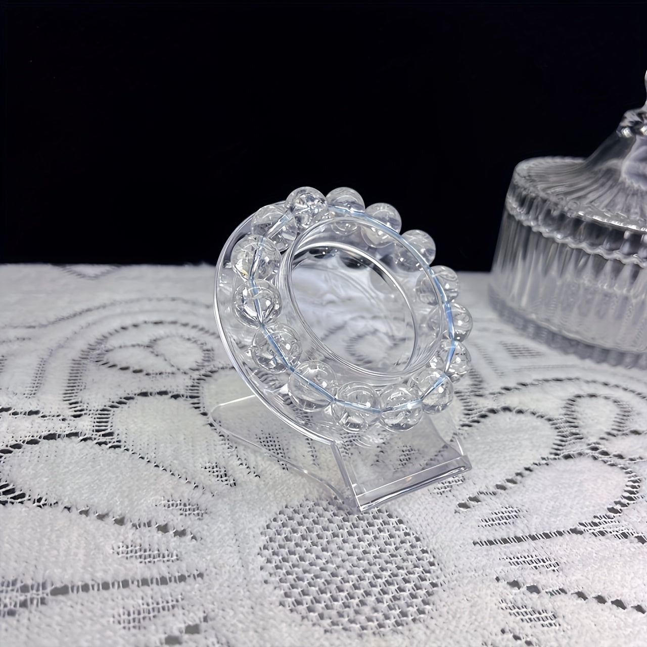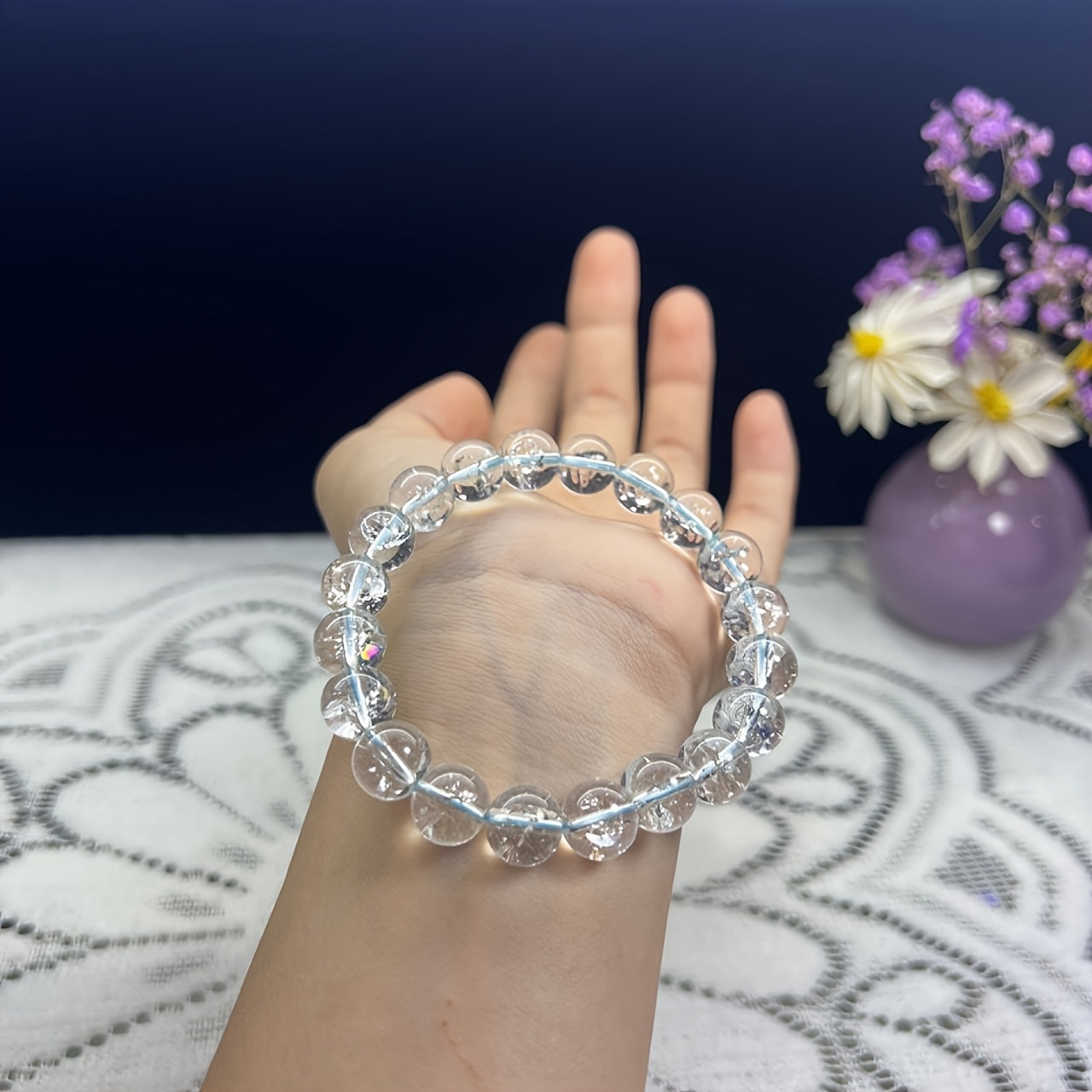 Yagona sun'iy oq kristal dumaloq toshdan tayyorlangan zamonaviy bilaguzuk. Kristal shaffof, porloq va silliq bo'lib, unga nozik va hashamatli ko'rinish beradi. Ushbu bilaguzuk modali, oddiy va nafis uslubni taratadi.