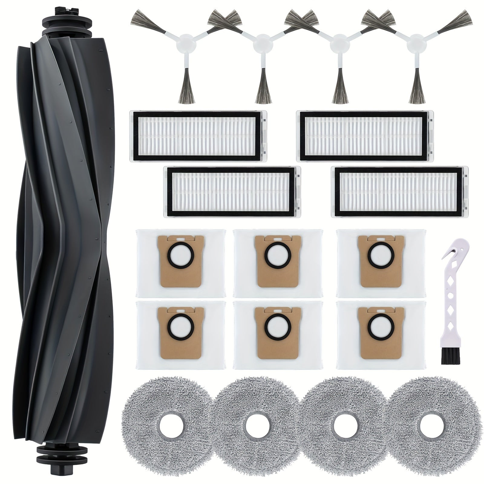 Dreame L20 Ultra Robot Tozalovchi uchun aksessuarlar 1 ta asosiy cho'tka, 4 ta filtr, 4 ta mato, 4 ta yon cho'tka, 6 ta chang sumkasi va 1 ta tozalash cho'tkasini o'z ichiga oladi.
