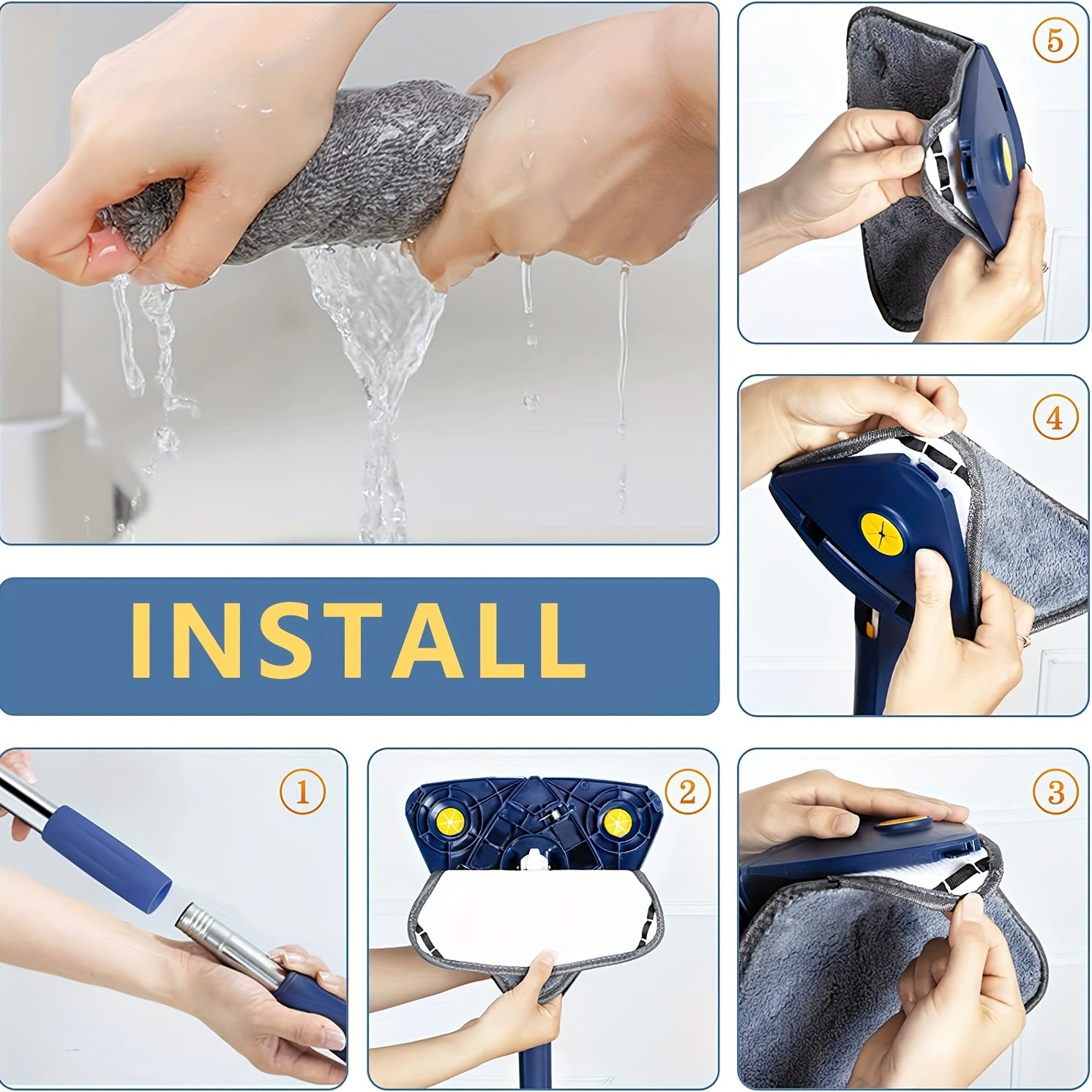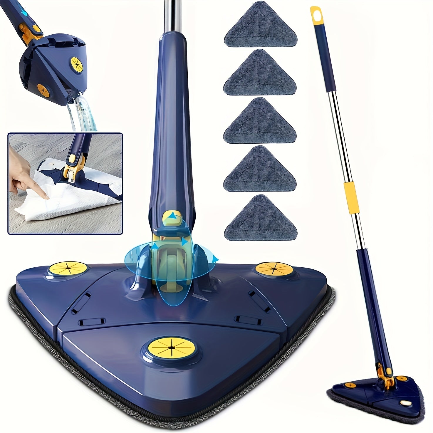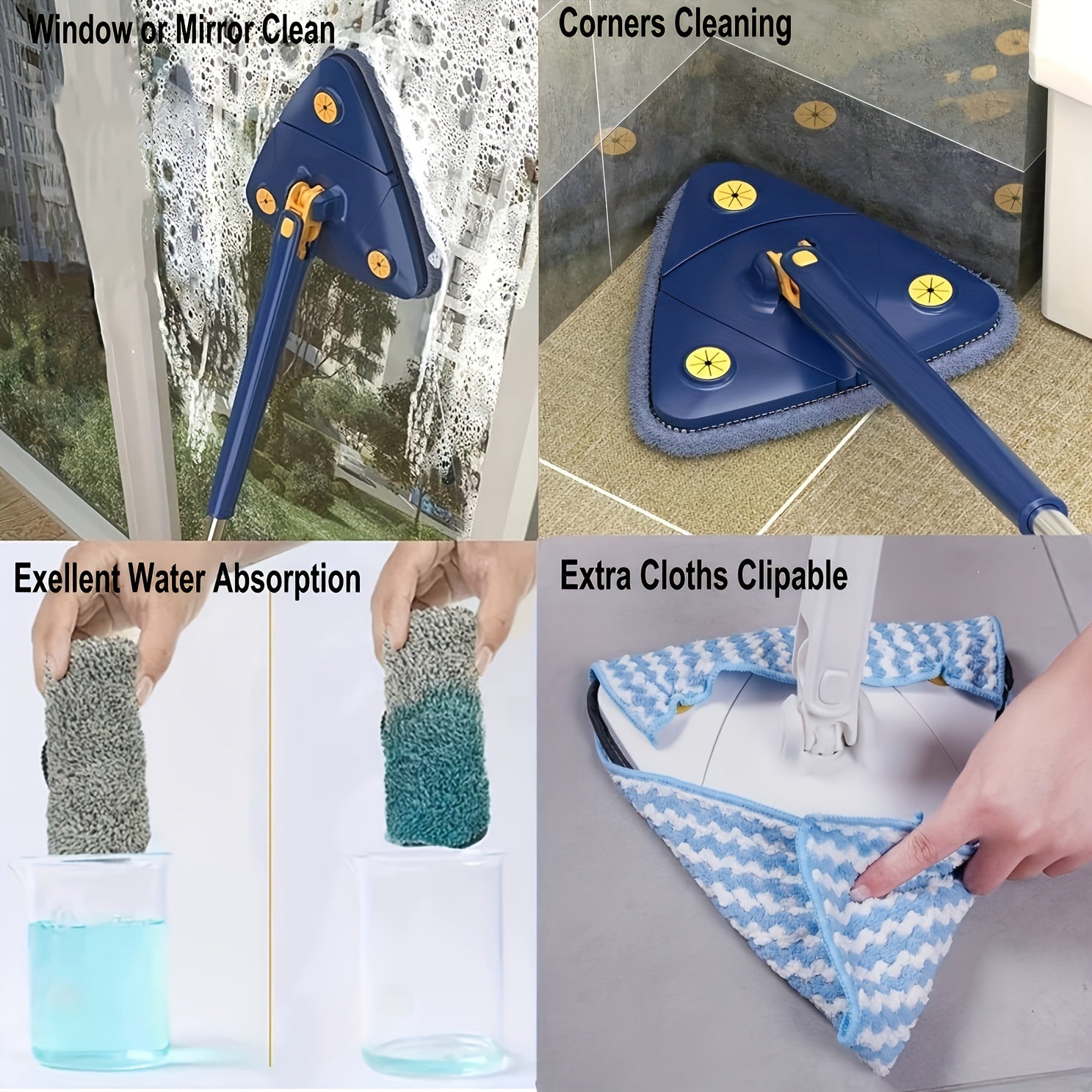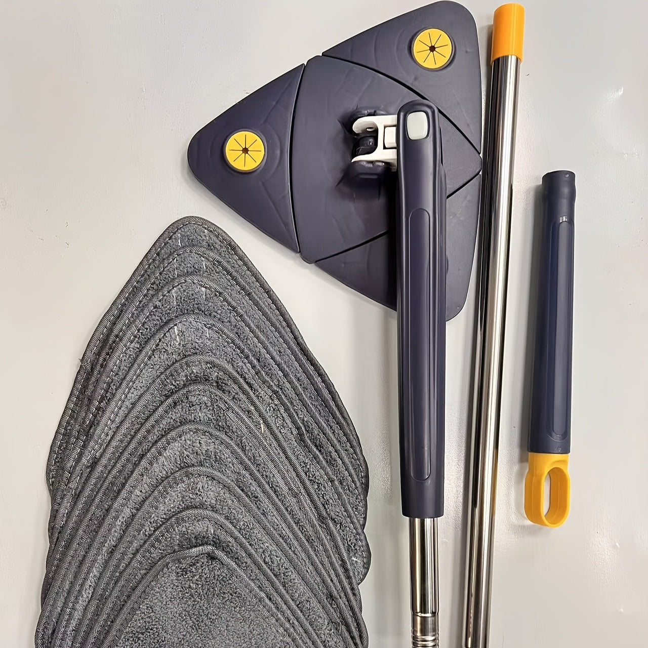 Tez quriydigan va avtomatik siqish imkoniyatiga ega sozlanadigan uchburchak tozalash mopki, pol, shift va devor uchun