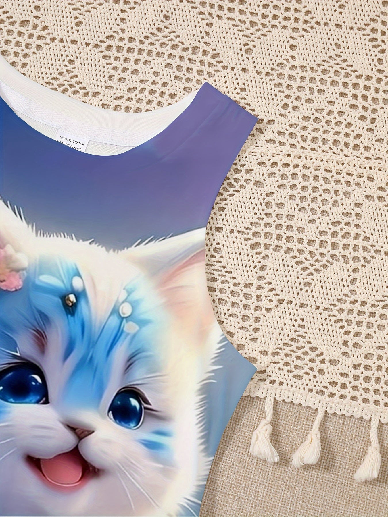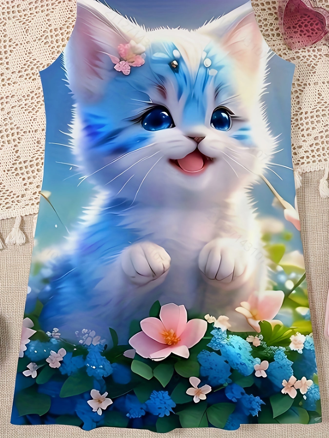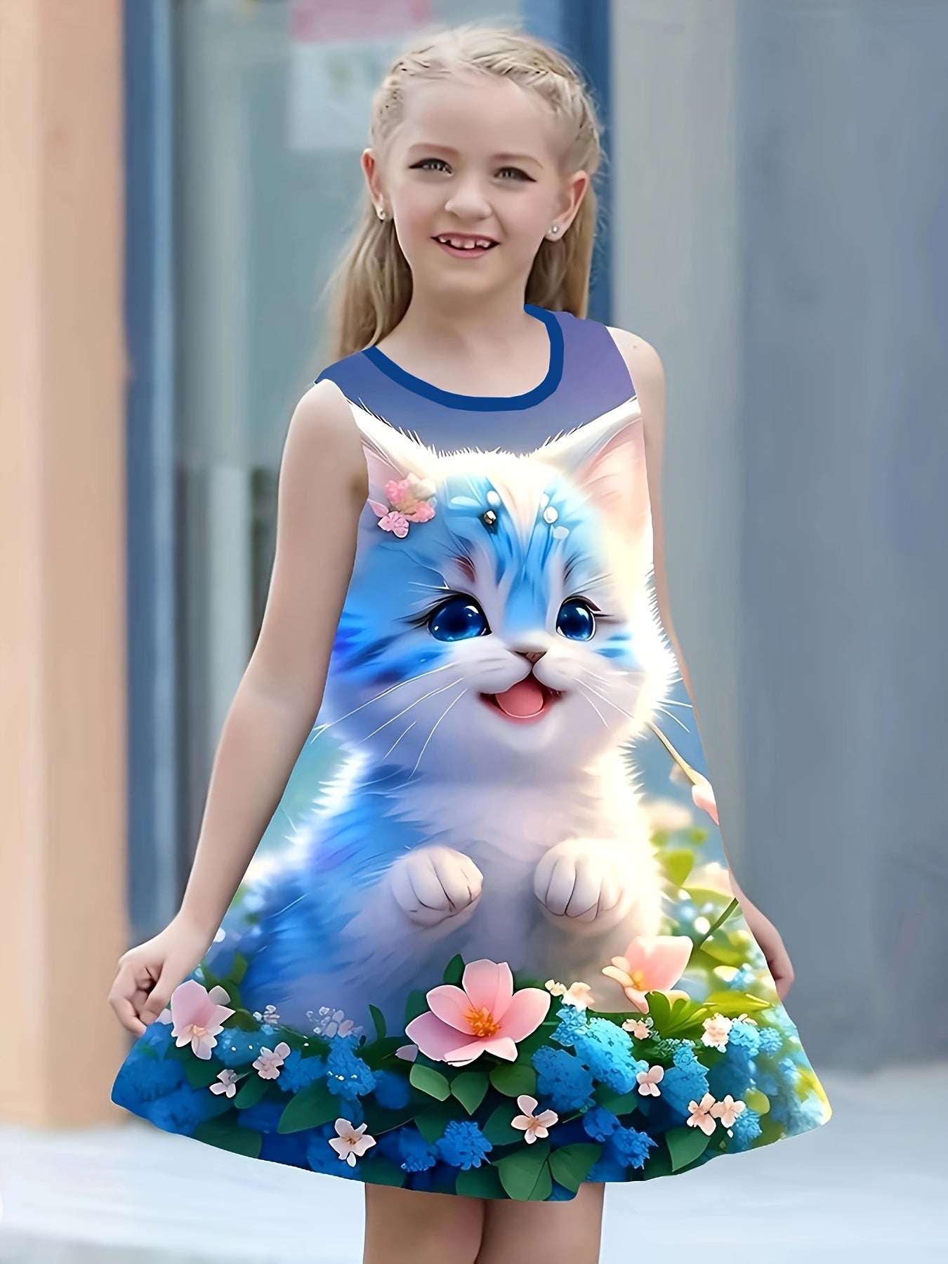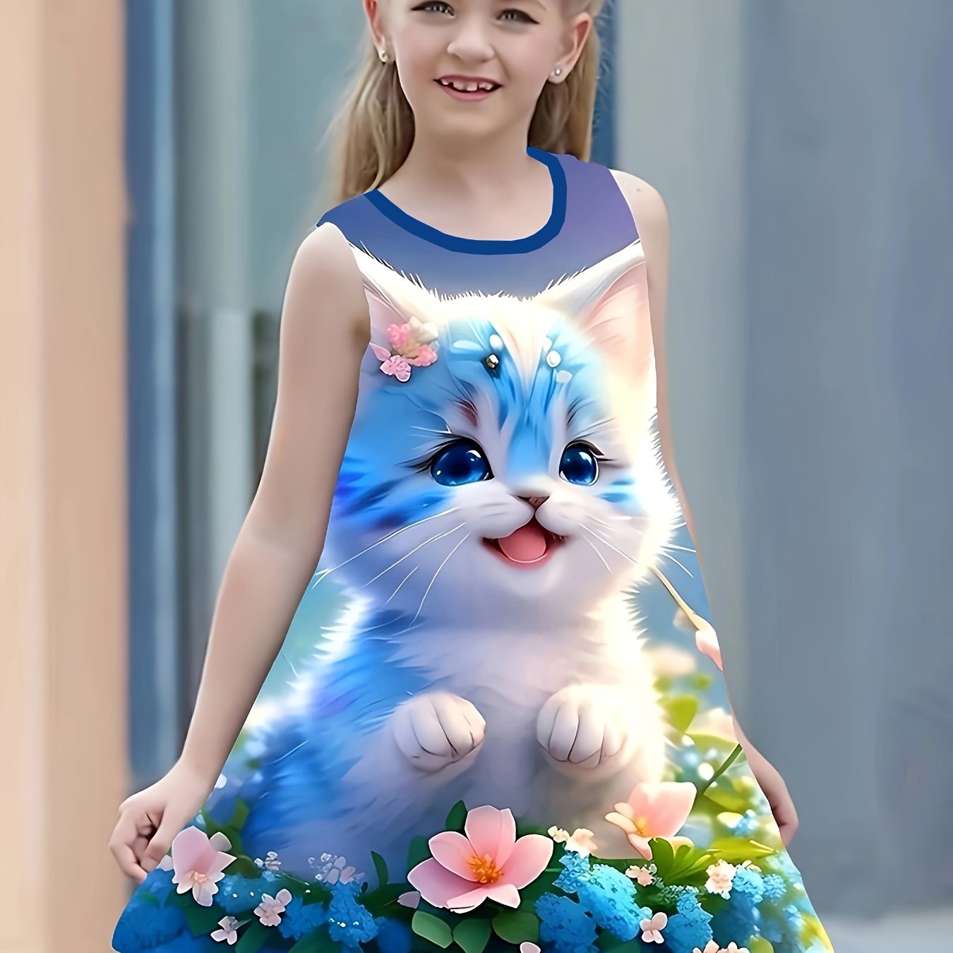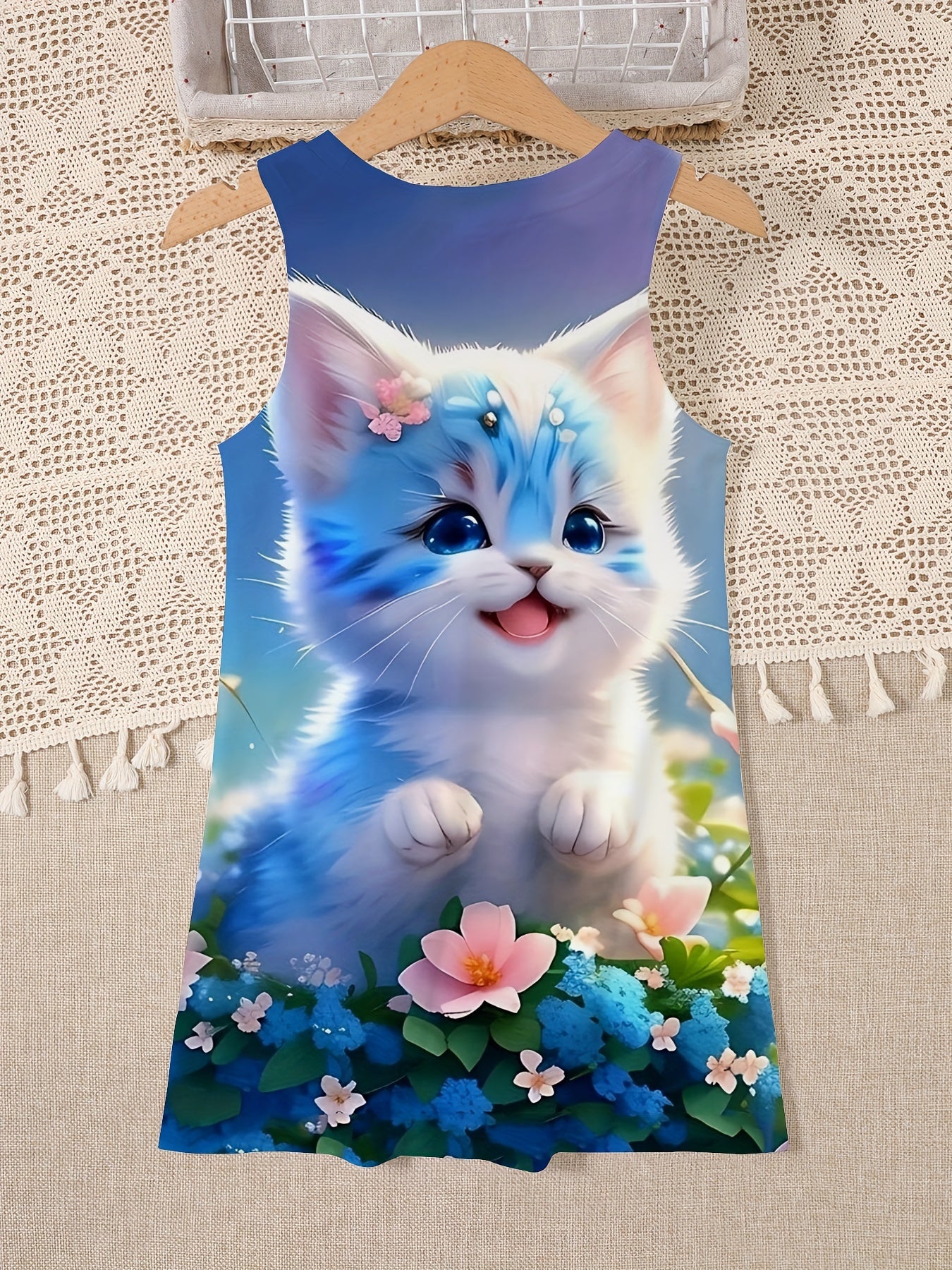 Sevimli Qizlar uchun Moviy Yengsiz Mushuk Libosi, Gullar Printi bilan, 100% Polyesterdan tayyorlangan. Yoshlar uchun tasodifiy yozgi kiyim, qulay to'qilgan.