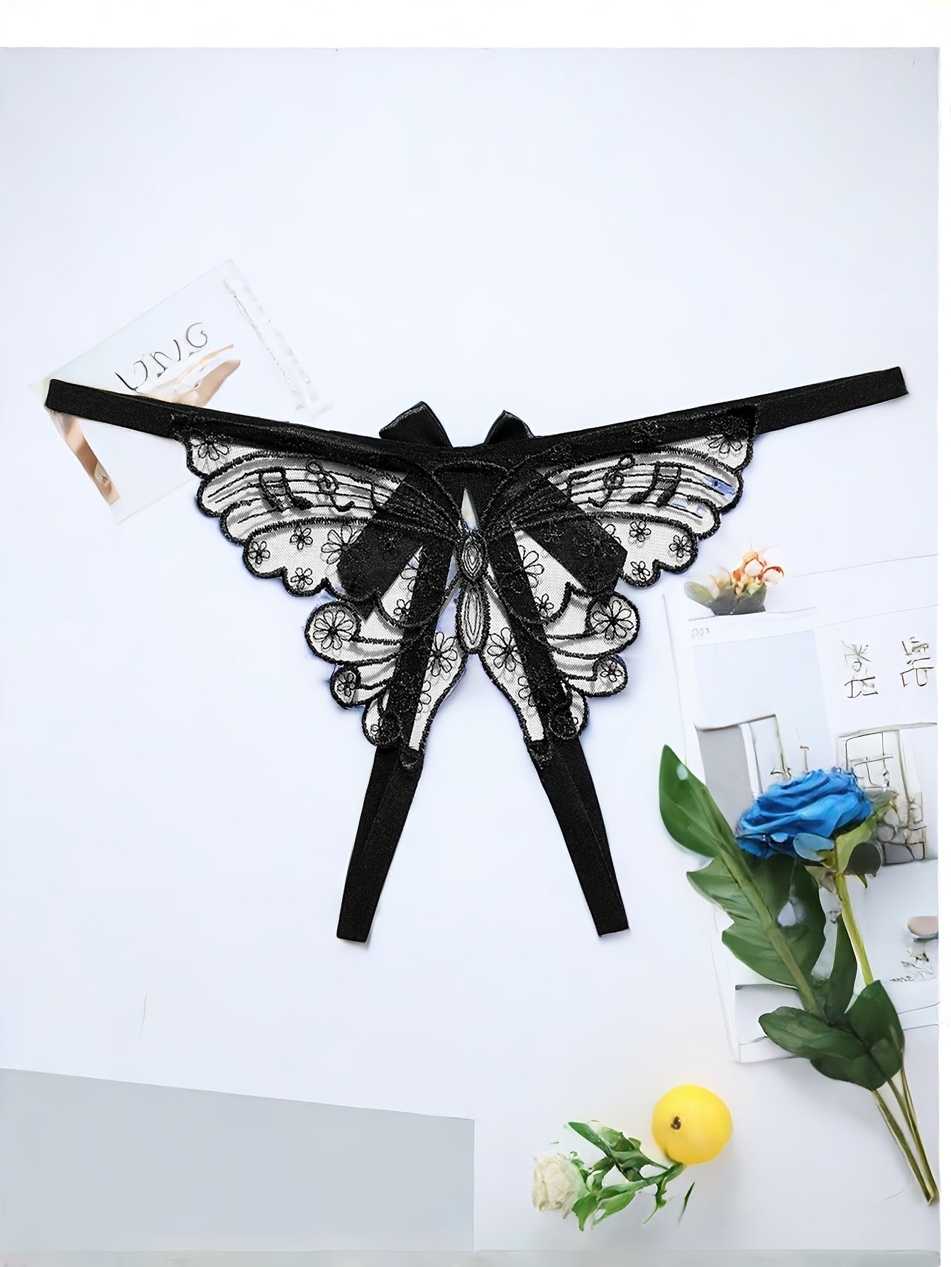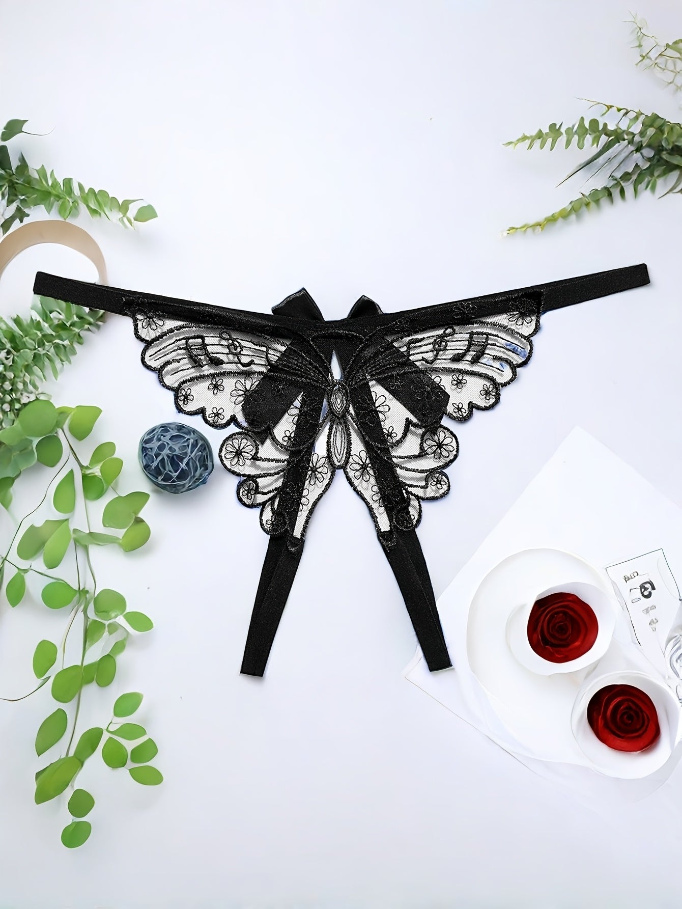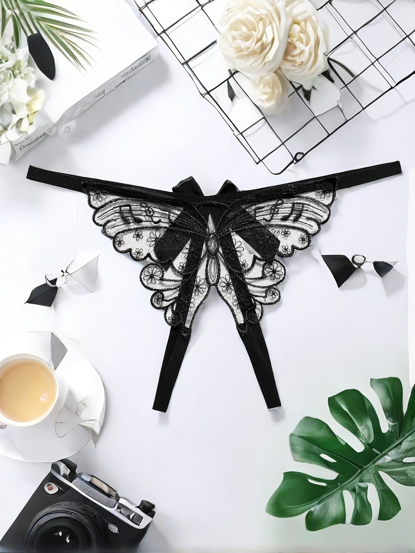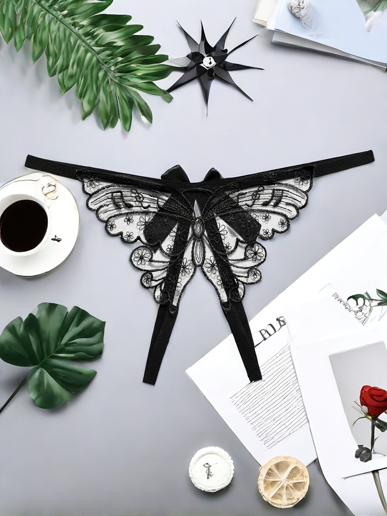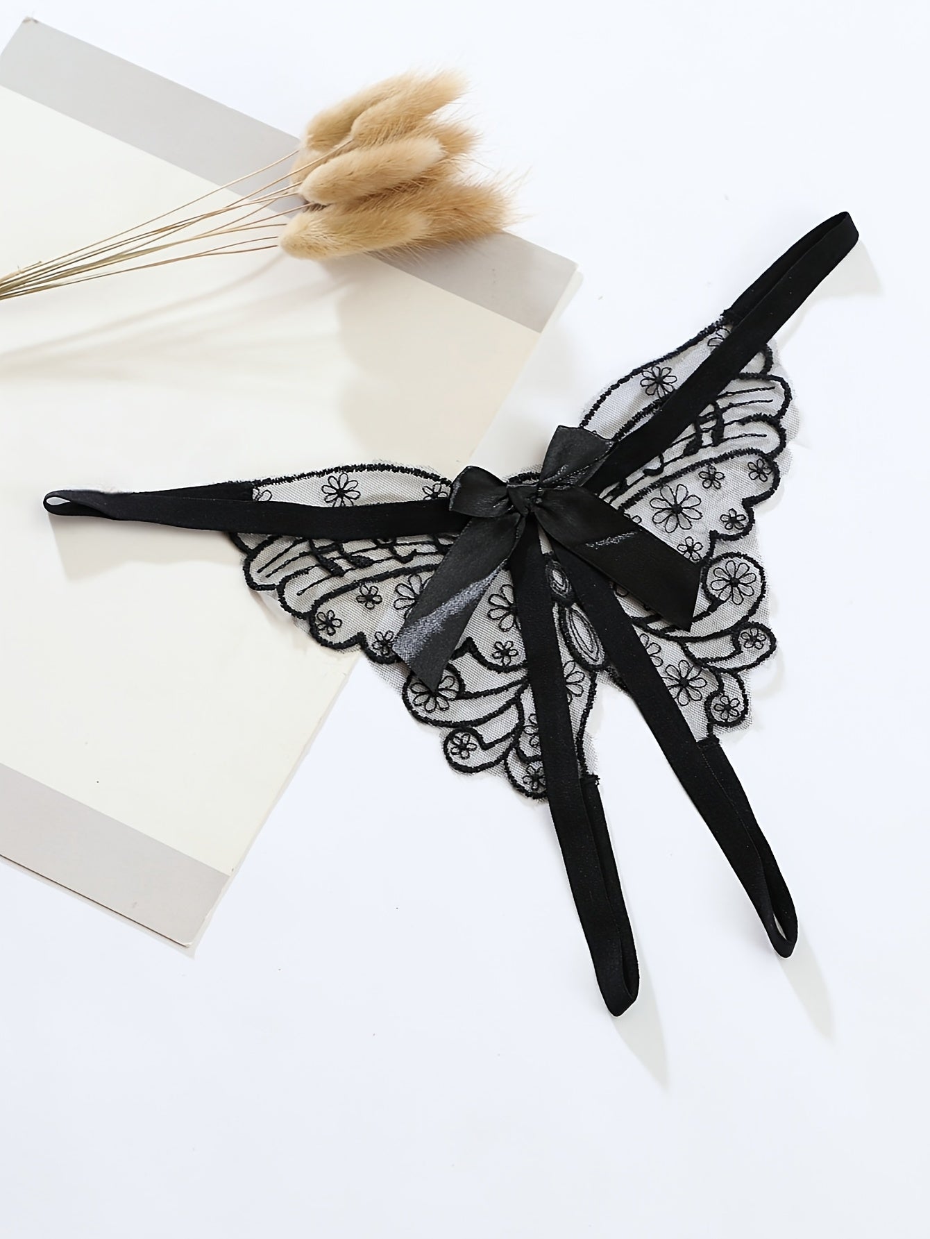 Kattalar uchun nafis kapalak tikuvli to'rli thong, bo'lakli qorin va kamon detali bilan, to'qilgan matodan tayyorlangan.