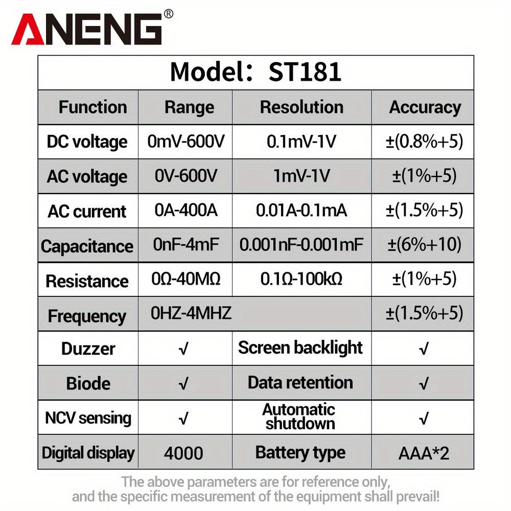 ANENG ST181 Ma'lumotlarni ko'rsatish raqamli qamchi o'lchagichi AC tok uchun, DC/AC voltaj uchun multimetre, ammetre, voltaj tester, Amp, Hz, sig'im, NCV, Ohm