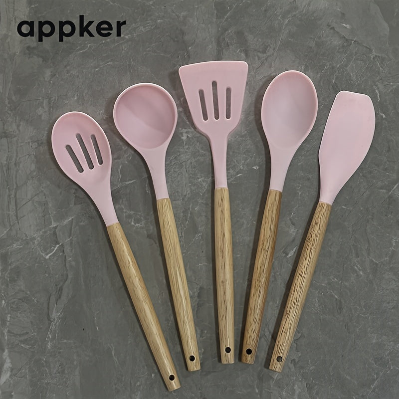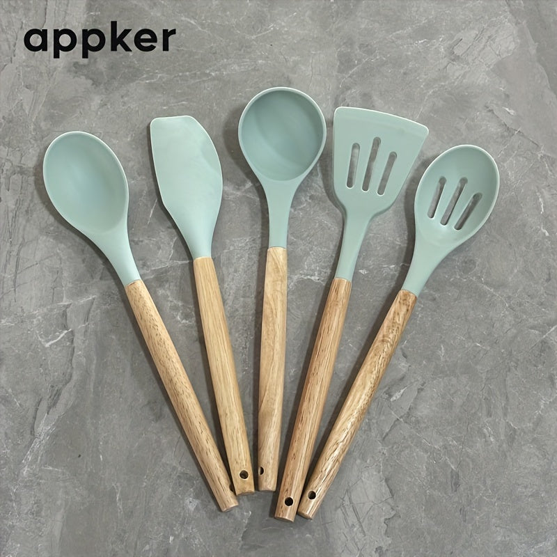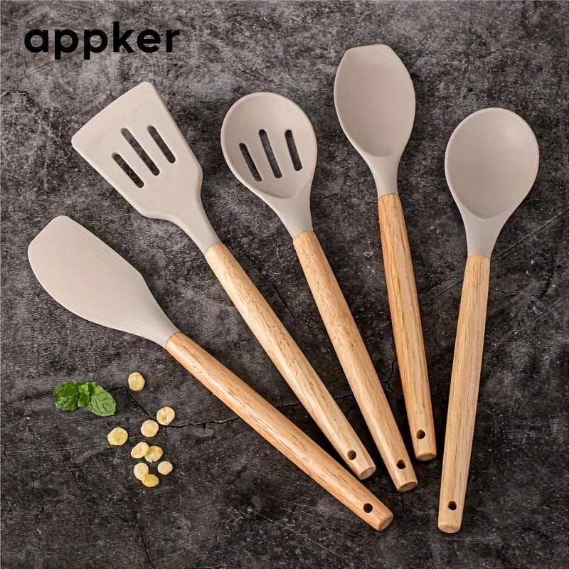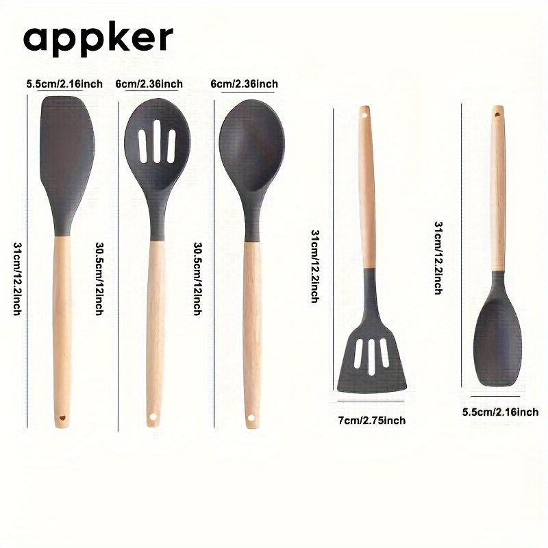 Appkerning 5 dona silikon oshxona asboblari to'plami yopishmaydigan, xavfsiz pishirish asboblari va yog'och tutqichlar bilan ta'minlangan. Yuvilishi mumkin va zamonaviy, bu to'plam uy oshpazlari uchun mukammaldir.