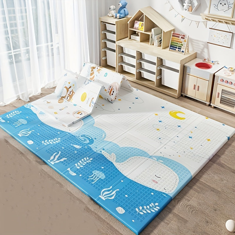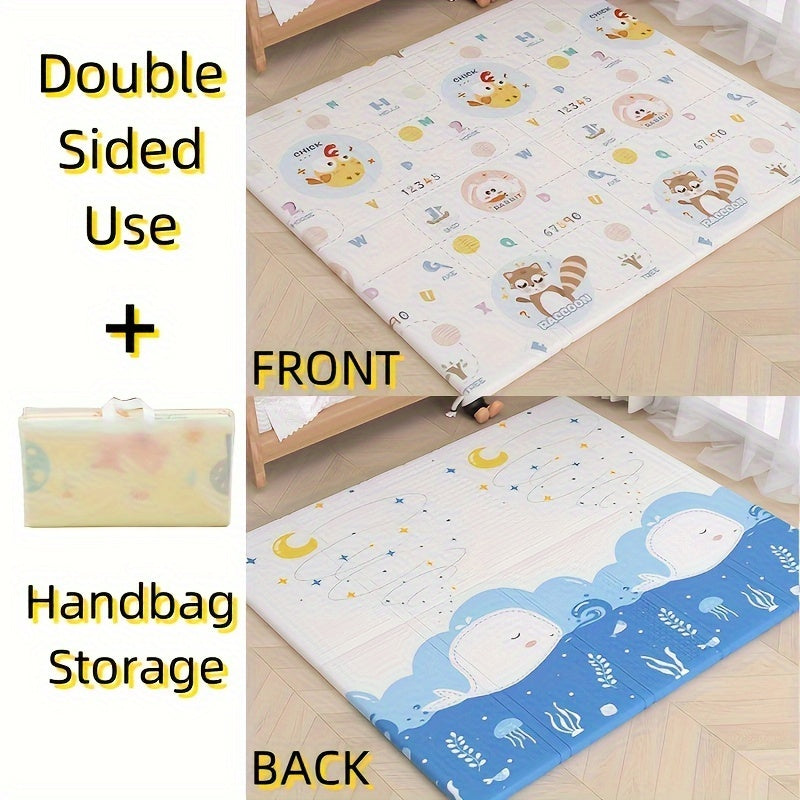Bolalar uchun o'yin matosi ikki tomonlama suv o'tkazmaydigan ko'pik, multfilm naqshlari va saqlash sumkasi bilan