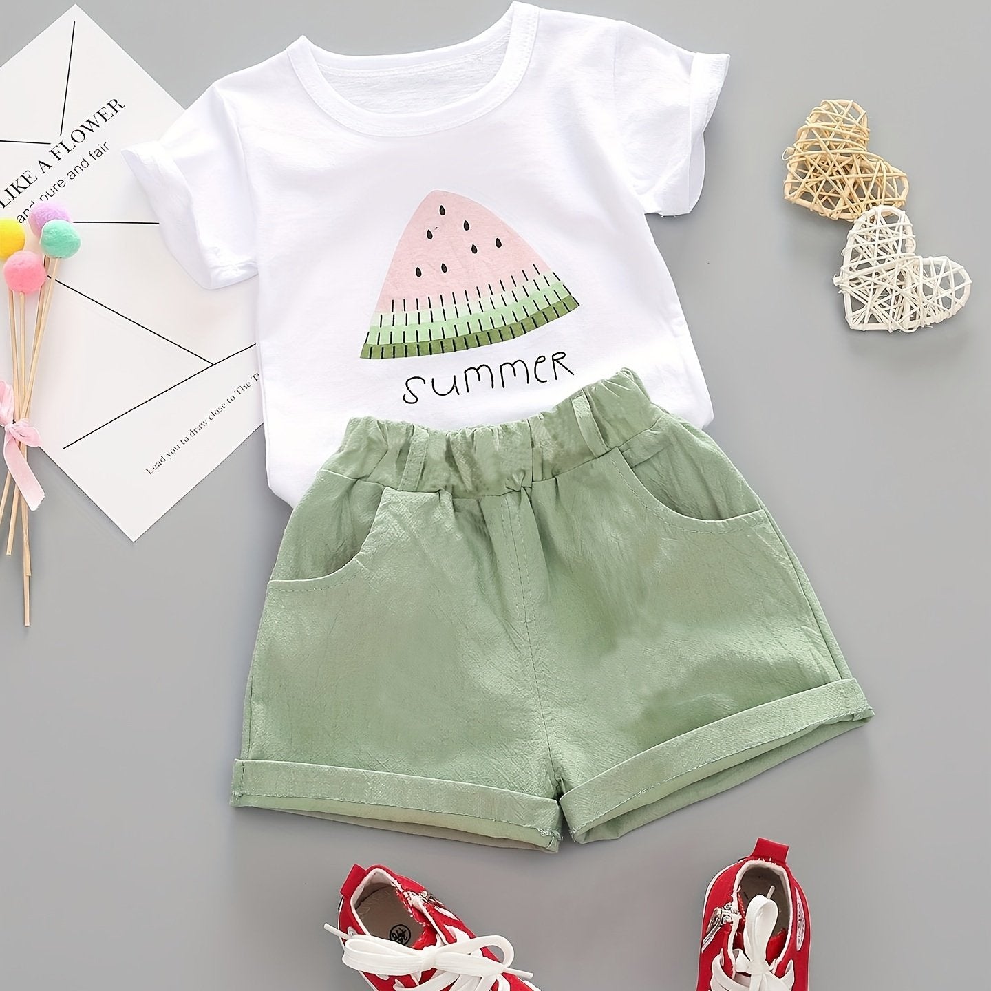 Kichkina qizlar uchun yozgi paxta 2 ta qismlik to'plam, qovun naqshli T-shirt va shortlar