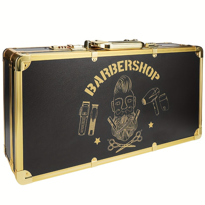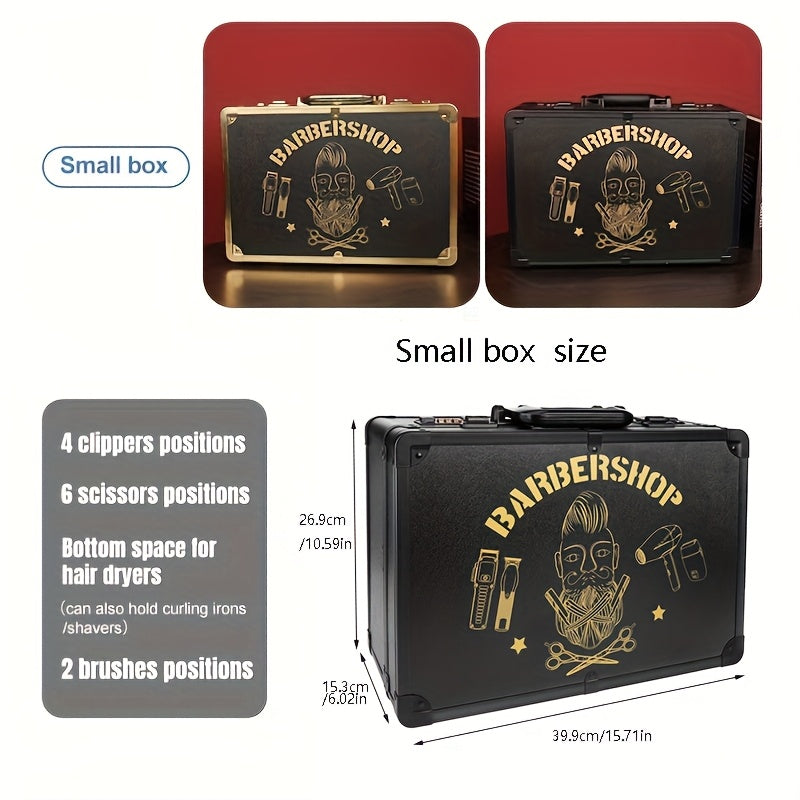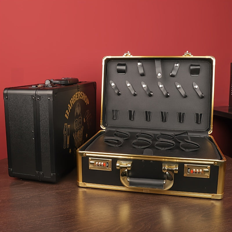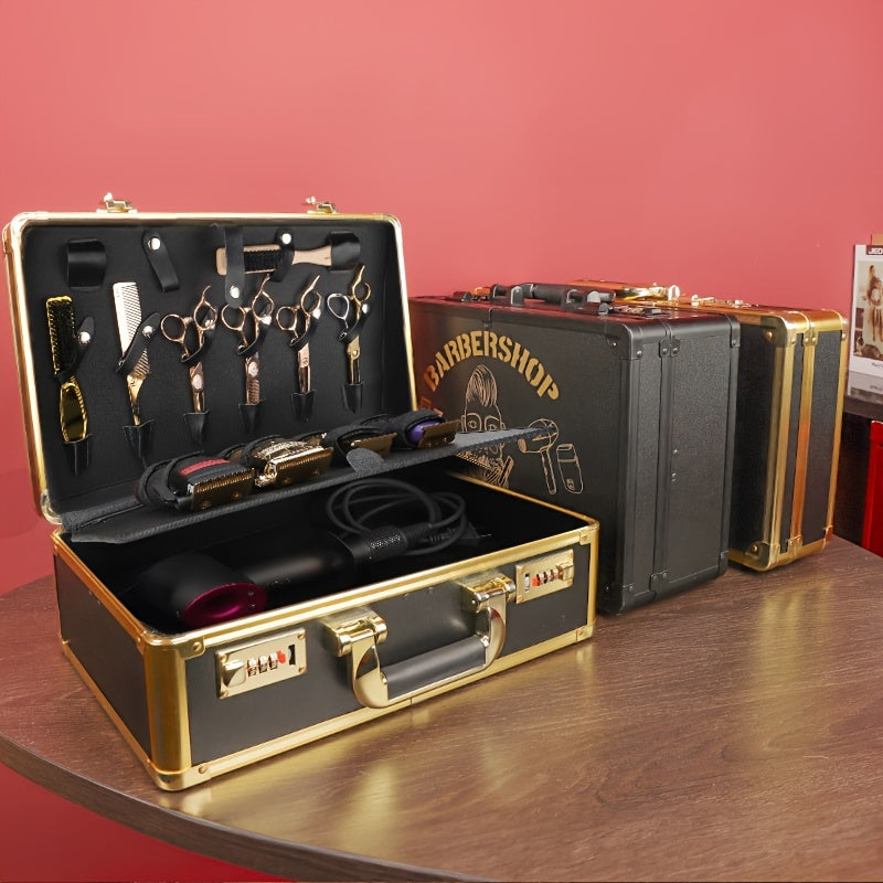 Qassoblar uchun mo'ljallangan qattiq saqlash qutisi, qaychi, taroq, moy va aksessuarlar bilan
