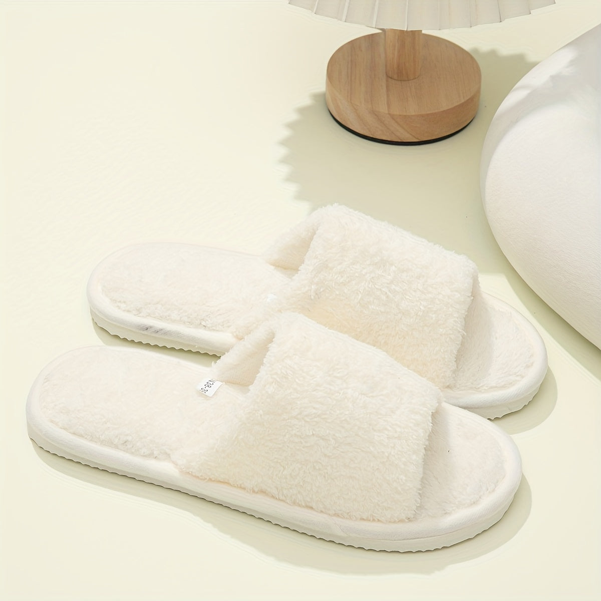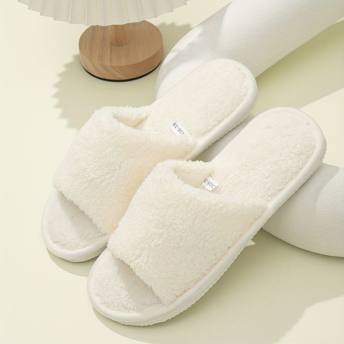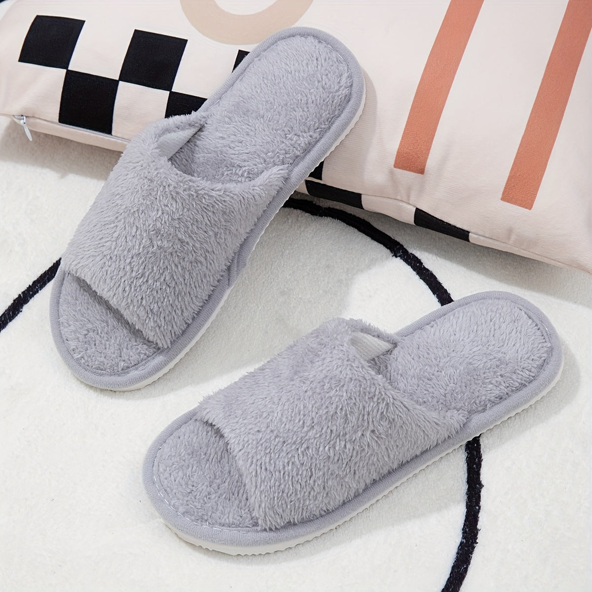 Ichki qulaylik uchun plush ochiq barmoq dizayni bilan asosiy bir rangli uy poyabzallari.