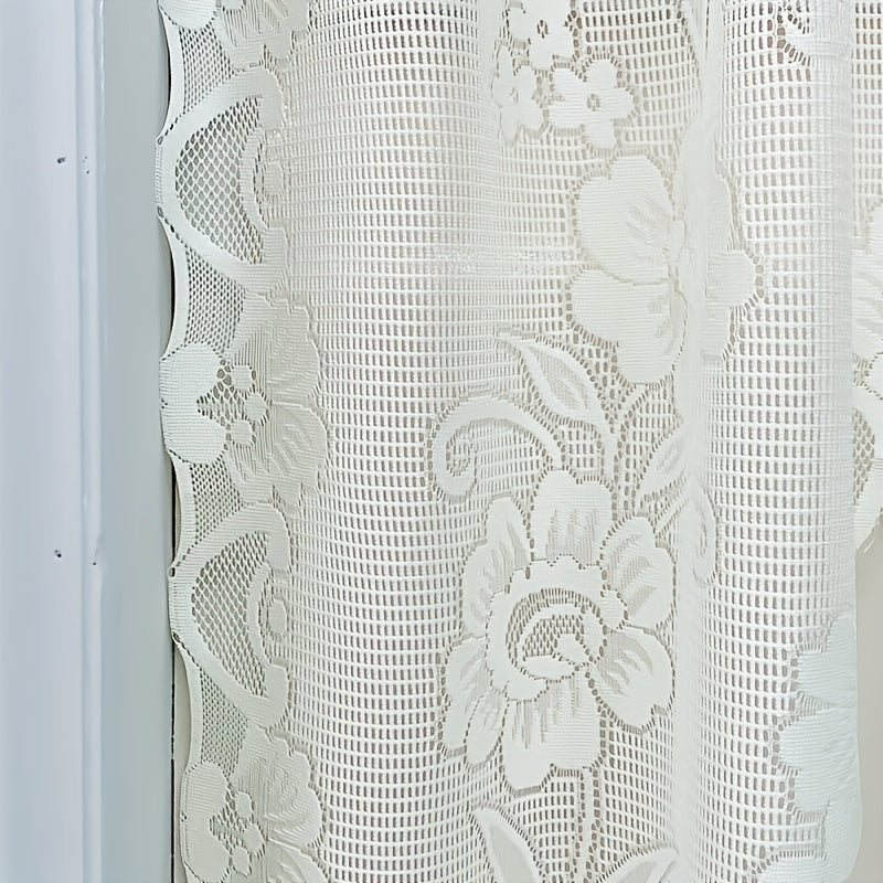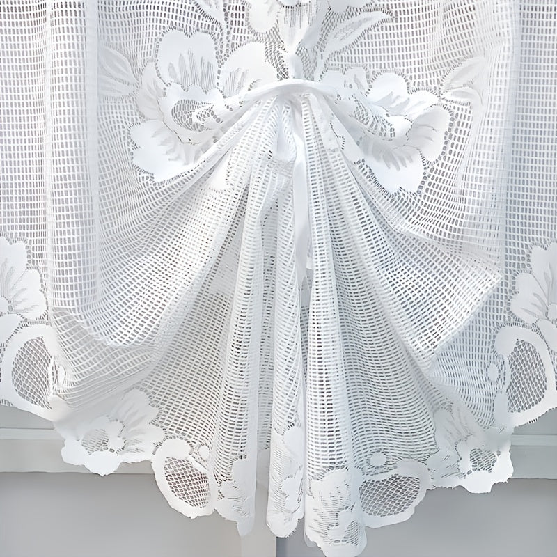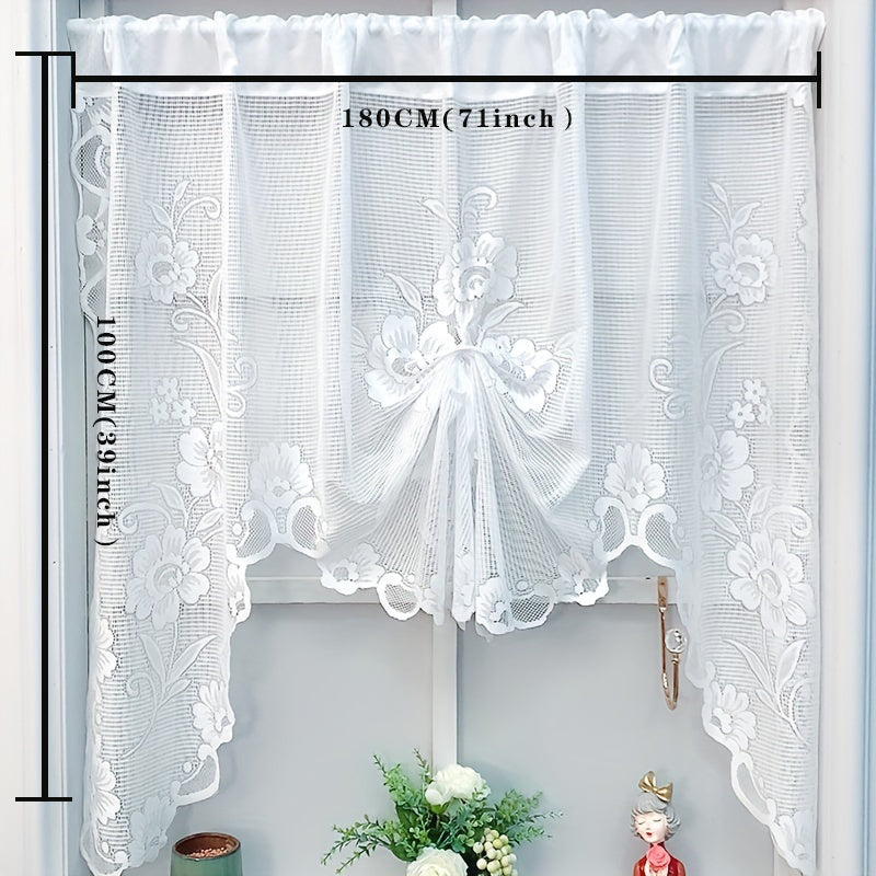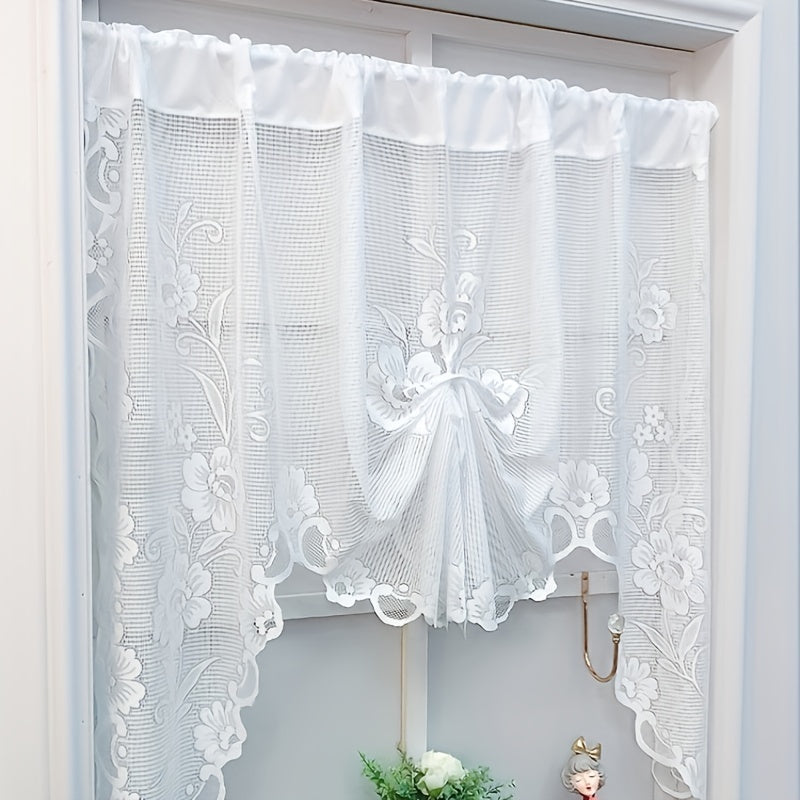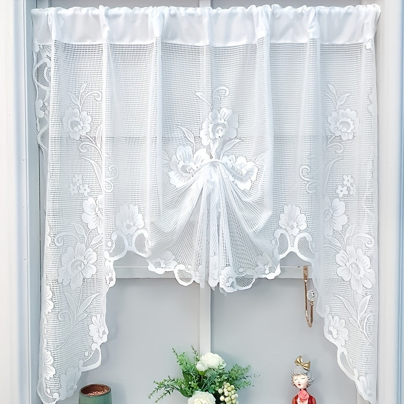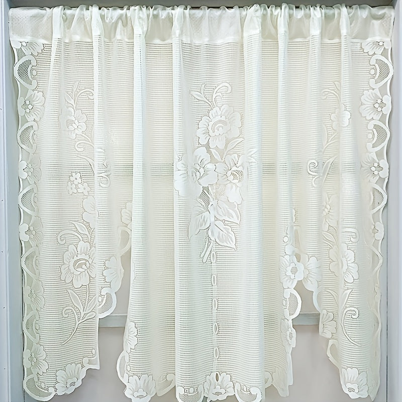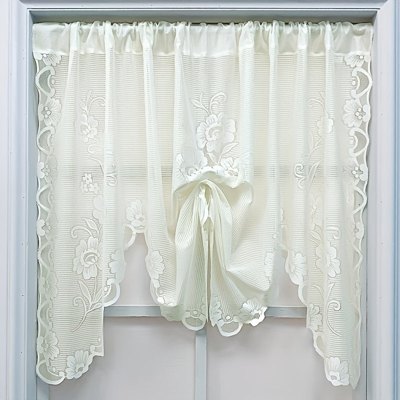 Bej va oq rangli chiroyli gulli qisqa pardozlar, rodda joylashgan, oshxona va mehmonxona uchun